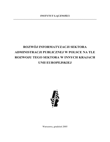 INSTYTUT ŁĄCZNOŚCI _____________________________________________________________________________ ROZWÓJ INFORMATYZACJI SEKTORA ADMINISTRACJI PUBLICZNEJ W POLSCE NA TLE ROZWOJU TEGO SEKTORA W INNYCH KRAJACH UNII EUROPEJSKIEJ Warszawa, grudzień 2005 INSTYTUT ŁĄCZNOŚCI _____________________________________________________________________________ ROZWÓJ INFORMATYZACJI SEKTORA ADMINISTRACJI PUBLICZNEJ W POLSCE NA TLE ROZWOJU TEGO SEKTORA W INNYCH KRAJACH UNII EUROPEJSKIEJ Kierownik tematu mgr inż. Wojciech Michalski Wykonawcy mgr inż. Wojciech Michalski mgr inż. Danuta Latoszek inż. Urszula Cackowska Nr pracy: 04 30 006 5 Rozwój informatyzacji sektora administracji publicznej w Polsce na tle rozwoju tego sektora w innych krajach Unii Europejskiej Spis treści 1. WSTĘP................................................................................................................................ 4 1.1 Cel pracy.................................................................................................................... 4 1.2 Założenia pracy.......................................................................................................... 4 1.3 Zakres pracy............................................................................................................... 4 1.4 Struktura dokumentu ................................................................................................. 4 2. OGÓLNE ASPEKTY ŚWIADCZENIA USŁUG EGOVERNMENT............................... 6 2.1 Definicja pojęcia eGovernment ................................................................................. 6 2.2 Określenie i podział usług eGovernment................................................................... 6 2.3 Pojęcia związane z eGovernment .............................................................................. 7 2.4 Realizacja usług eGovernment za pośrednictwem Internetu..................................... 8 2.5 Realizacja usług eGovernment przy wykorzystaniu technologii niezwiązanych z Internetem .................................................................................................................. 8 2.6 Efekty wprowadzenia usług eGovernment ................................................................ 9 3. ROZWÓJ STRATEGII E-EUROPA ................................................................................ 11 3.1 Wprowadzenie ......................................................................................................... 11 3.2 Rozwój inicjatyw programowych strategii eEuropa................................................ 11 3.2.1 3.2.2 3.2.3 3.2.4 3.3 Wprowadzenie................................................................................................................ 11 Plan działań eEuropa 2002............................................................................................. 12 Plan działań eEuropa 2005............................................................................................. 12 Plan działań eEuropa+.................................................................................................... 13 Realizacja zadań strategii eEuropa .......................................................................... 13 3.3.1 3.3.2 3.3.3 Upowszechnianie platform dostępowych...................................................................... 13 Uruchomienie programu IDA........................................................................................ 14 Tworzenie transeuropejskiej sieci elektronicznej wymiany danych między administracjami państw członkowskich........................................................................ 15 3.3.4 Wprowadzenie elektronicznej administracji państwowej ............................................ 15 3.3.5 Propagowanie idei elektronicznego nauczania ............................................................. 15 3.3.6 Zainicjowanie elektronicznej opieki zdrowotnej .......................................................... 15 3.3.7 Rozwijanie elektronicznej działalności biznesowej...................................................... 16 3.3.8 Budowanie bezpiecznej infrastruktury informacyjnej.................................................. 16 3.3.9 Rozwijanie aplikacji usługowych i upowszechnianie idei dobrych praktyk ............... 16 3.3.10 Uruchomienie programu Netimpact 2004..................................................................... 17 3.3.11 Wprowadzenie mechanizmów służących do koordynacji działań politycznych związanych z wykorzystaniem Internetu ...................................................................... 17 3.3.12 Wprowadzenie benchmarkingu jako jednolitej oceny postępów w elektronizacji gospodarki krajów Unii Europejskiej ............................................................................ 17 3.4 4. Ocena rozwoju inicjatywy eEuropa w świetle badań prowadzonych w ramach benchmarkingu ........................................................................................................ 18 ROZWÓJ STRATEGII E-POLSKA................................................................................. 20 4.1 Wprowadzenie ......................................................................................................... 20 4.2 Rozwój strategii informatyzacji kraju według dokumentów programowych Rządu ................................................................................................................................. 20 4.2.1 ePolska - Strategia rozwoju społeczeństwa informacyjnego w Polsce na lata 2001– 2006................................................................................................................................. 20 I Rozwój informatyzacji sektora administracji publicznej w Polsce na tle rozwoju tego sektora w innych krajach Unii Europejskiej 4.2.2 4.2.3 4.2.4 4.2.5 4.2.6 4.2.7 4.2.8 4.3 4.4 4.5 ePolska 2006 - Plan działań na rzecz rozwoju 