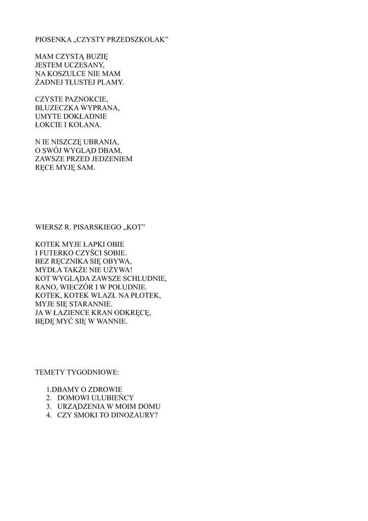 PIOSENKA „CZYSTY PRZEDSZKOLAK” MAM CZYSTĄ BUZIĘ JESTEM UCZESANY, NA KOSZULCE NIE MAM ŻADNEJ TŁUSTEJ PLAMY. CZYSTE PAZNOKCIE, BLUZECZKA WYPRANA, UMYTE DOKŁADNIE ŁOKCIE I KOLANA. N IE NISZCZĘ UBRANIA, O SWÓJ WYGLĄD DBAM, ZAWSZE PRZED JEDZENIEM RĘCE MYJĘ SAM. WIERSZ R. PISARSKIEGO „KOT” KOTEK MYJE ŁAPKI OBIE I FUTERKO CZYŚCI SOBIE. BEZ RĘCZNIKA SIĘ OBYWA, MYDŁA TAKŻE NIE UŻYWA! KOT WYGLĄDA ZAWSZE SCHLUDNIE, RANO, WIECZÓR I W POŁUDNIE. KOTEK, KOTEK WLAZŁ NA PŁOTEK, MYJE SIĘ STARANNIE. JA W ŁAZIENCE KRAN ODKRĘCĘ, BĘDĘ MYĆ SIĘ W WANNIE. TEMETY TYGODNIOWE: 1.DBAMY O ZDROWIE 2. DOMOWI ULUBIEŃCY 3. URZĄDZENIA W MOIM DOMU 4. CZY SMOKI TO DINOZAURY?