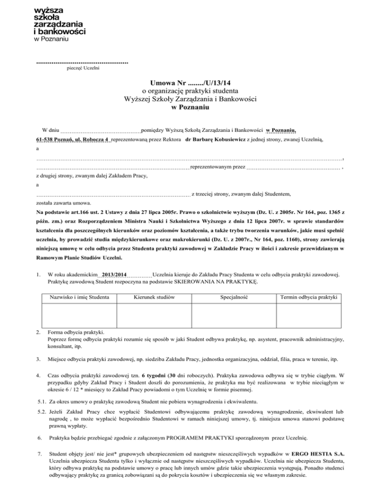 ................................................ pieczęć Uczelni Umowa Nr ......../U/13/14 o organizację praktyki studenta Wyższej Szkoły Zarządzania i Bankowości w Poznaniu W dniu pomiędzy Wyższą Szkołą Zarządzania i Bankowości w Poznaniu, 61-538 Poznań, ul. Robocza 4 reprezentowaną przez Rektora dr Barbarę Kobusiewicz z jednej strony, zwanej Uczelnią, a , reprezentowanym przez , z drugiej strony, zwanym dalej Zakładem Pracy, a z trzeciej strony, zwanym dalej Studentem, została zawarta umowa. Na podstawie art.166 ust. 2 Ustawy z dnia 27 lipca 2005r. Prawo o szkolnictwie wyższym (Dz. U. z 2005r. Nr 164, poz. 1365 z późn. zm.) oraz Rozporządzeniem Ministra Nauki i Szkolnictwa Wyższego z dnia 12 lipca 2007r. w sprawie standardów kształcenia dla poszczególnych kierunków oraz poziomów kształcenia, a także trybu tworzenia warunków, jakie musi spełnić uczelnia, by prowadzić studia międzykierunkowe oraz makrokierunki (Dz. U. z 2007r., Nr 164, poz. 1160), strony zawierają niniejszą umowę w celu odbycia przez Studenta praktyki zawodowej w Zakładzie Pracy w ilości i zakresie przewidzianym w Ramowym Planie Studiów Uczelni. 1. W roku akademickim 2013/2014 Uczelnia kieruje do Zakładu Pracy Studenta w celu odbycia praktyki zawodowej. Praktykę zawodową Student rozpoczyna na podstawie SKIEROWANIA NA PRAKTYKĘ. Nazwisko i imię Studenta Kierunek studiów Specjalność Termin odbycia praktyki 2. Forma odbycia praktyki. Poprzez formę odbycia praktyki rozumie się sposób w jaki Student odbywa praktykę, np. asystent, pracownik administracyjny, konsultant, itp. 3. Miejsce odbycia praktyki zawodowej, np. siedziba Zakładu Pracy, jednostka organizacyjna, oddział, filia, praca w terenie, itp. 4. Czas odbycia praktyki zawodowej tzn. 6 tygodni (30 dni roboczych). Praktyka zawodowa odbywa się w trybie ciągłym. W przypadku gdyby Zakład Pracy i Student doszli do porozumienia, że praktyka ma być realizowana w trybie nieciągłym w okresie 6 / 12 * miesięcy to Zakład Pracy powiadomi o tym Uczelnię w formie pisemnej. 5.1. Za okres umowy o praktykę zawodową Student nie pobiera wynagrodzenia i ekwiwalentu. 5.2. Jeżeli Zakład Pracy chce wypłacić Studentowi odbywającemu praktykę zawodową wynagrodzenie, ekwiwalent lub nagrodę , to może wypłacić bezpośrednio Studentowi w ramach niniejszej umowy, tj. niniejsza umowa stanowi podstawę prawną wypłaty. 6. Praktyka będzie przebiegać zgodnie z załączonym PROGRAMEM PRAKTYKI sporządzonym przez Uczelnię. 7. Student objęty jest/ nie jest* grupowych ubezpieczeniem od następstw nieszczęśliwych wypadków w ERGO HESTIA S.A. Uczelnia ubezpiecza Studenta tylko i wyłącznie od następstw nieszczęśliwych wypadków. Uczelnia nie ubezpiecza Studenta, który odbywa praktykę na podstawie umowy o pracę lub innych umów gdzie takie ubezpieczenia występują. Ponadto studenci odbywający praktykę za granicą zobowiązani są do pokrycia kosztów i ubezpieczenia się we własnym zakresie. Strona 1/2 8. Zakład Pracy zobowiązuje się do: a) zapewnienia odpowiednich stanowisk pracy zgodnie z programem praktyki, b) zapoznania Studenta z zakładowym regulaminem pracy, przepisami o bezpieczeństwie i higienie pracy oraz o ochronie tajemnicy państwowej i służbowej lub innymi aktami prawa obowiązującymi Studenta w czasie praktyki ze strony Zakładu Pracy, c) nadzoru nad wykonaniem przez Studenta zadań wynikających z programu praktyki, d) zapewnienia Studentowi na czas odbywania praktyki odzieży roboczej i ochronnej oraz sprzętu ochrony osobistej i środków higieny, jeśli istnieje taka potrzeba i konieczność, e) zapewnienia Studentowi na czas odbywania praktyki posiłków wzmacniających lub regeneracyjnych oraz umożliwienia korzystania z biblioteki zakładowej, jeśli istnieje taka potrzeba i konieczność, f) umożliwienia opiekunowi dydaktycznemu sprawowania nadzoru dydaktycznego nad praktyką, g) potwierdzenia przebiegu i faktu odbycia praktyki ( oraz innych zdarzeń mających miejsce w trakcie odbywania przez Studenta praktyki) w DZIENNIKU PRAKTYKI ZAWODOWEJ. 9. Uczelnia zobowiązuje się do: a) sporządzenia SKIEROWANIA NA PRAKTYKĘ, które Student musi okazać w momencie zgłoszenia się do Zakładu Pracy w celu rozpoczęcia praktyki, b) przedstawienia PROGRAMU PRAKTYKI. W przypadku gdy Zakład Pracy wystąpi o zmianę programu, Uczelnia za pomocą odpowiedniej osoby może uwzględnić zmiany w programie praktyki. Opracowany w porozumieniu z Zakładem Pracy program praktyki zostaje przedstawiony Studentowi, c) sprawowania nadzoru dydaktyczno-wychowawczego oraz organizacyjnego nad przebiegiem praktyki. 10. Zakład Pracy może zażądać od Uczelni odwołania z praktyki Studenta odbywającego praktykę na podstawie skierowania, w przypadku gdy naruszy on w sposób rażący prawo lub dyscyplinę pracy. Jeżeli naruszenie dyscypliny spowodowało zagrożenie dla życia, zdrowia lub inne zagrożenia dla Zakładu Pracy, Zakład Pracy może nie dopuścić tym samym zawieszając Studenta w kontynuowaniu praktyki w zakładzie i równocześnie może go odwołać z odbywania praktyki. 11. Student pokrywa we własnym zakresie koszty zakwaterowania i wyżywienia oraz wszelkie inne koszty związane z odbyciem praktyk (np. materiały przygotowawcze, dojazdy, ubezpieczenie zgodnie z pkt.7 lub inne). 12. Zakład Pracy może zawrzeć ze Studentem umowę o pracę na okres odbywania praktyki lub poza tym okresem o czym poinformuje Uczelnię w formie pisemnej. 13. Uczelnia może w ramach posiadanych możliwości poinformować opinię publiczną za pomocą Informatora lub innego kanału informacyjnego, że Zakład Pracy wspiera studentów w celu zdobycia wykształcenia wyższego i zarazem podziękować w imieniu Studenta za umożliwienie odbycia praktyki na co Zakład Pracy wyraża zgodę. 14.1.Rezultaty pracy Studenta jakie powstaną w trakcie odbycia praktyki zawodowej na zasadzie postanowień pkt.14.2 i pkt.14.3 Zakł