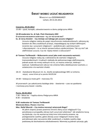 ŚWIAT WOBEC UCZUD RELIGIJNYCH WARSZTATY DLA DZIENNIKARZY Licheo, 29-31.03.2012 CZWARTEK, 29.03.2012 15:00 – zjazd, kanapki, zakwaterowanie w domu pielgrzyma ARKA 16:30 Moderator ks. dr hab. Piotr Kieniewicz MIC O UCZUCIACH RELIGIJNYCH SŁÓW KILKA – SĄ, CZY TEŻ ICH NIE MA? ks. dr Jerzy Smoleo - Czy istnieje coś takiego jak uczucia religijne? Uczucia religijne należą do pojęd nieuchronnie niedookreślonych, odnoszą się bowiem do sfery osobistych przeżyd, niepoddającej się ścisłym definicjom. Liczenie się z uczuciami religijnymi – podobnie jak z patriotycznymi i obyczajowymi – to w istocie sprawa kultury społeczeostwa. Tak czy nie? Jak zdefiniowad uczucia. Czy nie lepiej mówid o odczuciach? dr Tomasz Terlikowski – Wzburzenie uczud jako znak naruszenia wartości. Uczucia religijne rodzą się z odniesienia do wartości religijnych, transcendentnych i trudnych niekiedy do jednoznacznego zdefiniowania, jednak wcale nie mniej realnych niż to, co można zmierzyd, dotknąd i wyliczyd. Subiektywnośd odczud nie zmienia faktu obiektywności wartości, a ostatecznie o te wartości chodzi. 18.15 Zwiedzanie Muzeum im. ks. Józefa Jarzębowskiego MIC w Licheniu więcej - www.lichen.pl w panelu MUZEUM 19:30 – kolacja (a może grill – marcowy ) W przerwach i po zakooczeniu każdego dnia - kawiarnia – czas na spotkania i rozmowy przy kawie i ciastku. PIĄTEK, 30.03.2012 7.30 – Msza św. – kaplica domu Pielgrzyma ARKA 8:30 – śniadanie 9:30 Moderator dr Tomasz Terlikowski WIZERUNEK BOGA. PRAWO I POLITYKA Mec. Rafał Sikorski – Czy można naruszyd wizerunek Boga? W jakim stopniu prawo powinno chronid sferę uczud religijnych? Czy penalizacja w przypadku obrazy tych uczud jest właściwa? Jak wiadomo toczą się dyskusje, czy nie wystarczą tutaj inne instrumenty prawne, np. postępowanie cywilne, gdzie obrazę uczud religijnych można więc potraktowad jako naruszenie dóbr osobistych, a kodeks cywilny daje podstawę do dochodzenia odszkodowania. Niemniej są jednak sytuacje, gdy w bardzo brutalny sposób narusza się te uczucia, co nawet prowadzi do napięd społecznych. Wtedy mamy do czynienia nie tylko z ochroną uczud jednostki, ale i z dbałością o interes ogólny – chodzi o to, żeby nie dopuszczad do ekstremalnych zachowao. W takich sytuacjach penalizacja jest konieczna. Podobnie zresztą gdy obraża się osoby niewierzące ze względu na brak wiary. Przykłady orzeczeo sadowych: chusty we Francji, minarety w Szwajcarii, krzyż we Włoszech. Co to jest sfera publiczna? Czy sama w sobie podlega ochronie. Ustawodawstwo Europejskie. ks. dr Andrzej Draguła – Kościół w czasach pop-kultury. O potrzebie nowego języka opowiadania o sacrum. Czy płaszczyzny Kościoła i świeckiego paostwa mogą ze sobą nawiązad łącznośd? Czy jest szansa, że nastąpi między nimi porozumienie? Czy da się je wzajemnie przetłumaczyd? Jak „ocalid Boga” w sekularyzującym się społeczeostwie. Pytanie o „ocalenie” dotyczy obecności wartości w dyskusji publicznej, a ni jedynie oddanie im należnej czci i miejsca (słowacki wielkim poetą był…. Tylko co z tego) Czy nie jest tak, że Kościół odpowiada na pytania, których sobie już nikt nie stawia, a nie odpowiada na pytania, które ludzie stawiają? 11:00 – kawa 11:30 Moderator dr Tomasz Terlikowski ŻARTY I KPINY Z KOŚCIOŁA I WIARY. GDZIE JEST GRANICA TOLERANCJI? dr Paweł Skrzydlewski – O tolerancji słów kilka. Definicja pojęcia. Historia pojęcia. Współczesna demokracja broni świeckości paostwa, by rozmaite wyznania i ludzie niereligijni mieli te same prawa i przywileje. Tak, aby paostwo mogło stad się wspólnym domem dla ludzi różnych opcji ideowych. Stanowisko to wynika m.in. z doświadczenia krwawych wojen religijnych ciągnących się dziesiątki lat w Europie u początków nowoczesności. Wtedy ufundowano pojęcie tolerancji. Jeżeli świeckie paostwo nie chce preferowad żadnej religii, ale jednocześnie nie odrzuca religii jako takiej i bynajmniej nie tworzy aksjologicznej próżni. Jak to połączyd, tak by tolerancja nie była młotem na wyznawców jakiejkolwiek religii i zapewnienie harmonijnego współistnienia ludziom o niekiedy skrajnie odmiennych poglądach. dr hab. Piotr Kieniewicz MIC – Tolerancja wobec innych wartości. Obecne zakręcenie świata (nade wszystko świata mediów) wokół tolerancji i demokracji sprawia, że cały porządek wartości uległ splątaniu. Ważniejsze od prawdy stało się z jednej strony „zrobienie newsa”, a z drugiej – nie urażenie kogokolwiek (przy czym do wyraźnie złego tonu jest urażanie się czyimiś uwagami). Jak zatem na nowo uporządkowad świat wartości społecznych, by nie negując tolerancji, przywrócid należne miejsce wartościom zdecydowanie od niej ważniejszym. Jak ukazad te wartości, by zostały dostrzeżone i przyjęte? 13:00 – Obiad 13.30 – Wizyta w lesie grąblioskim i krótkie spotkanie w siostrami anuncjatkami więcej – www.lichen.pl w panelu ZAKONY WSPÓŁPRACUJĄCE 15:00 Moderator o. Roman Bielecki OP KOŚCIÓŁ W CZASACH POP-KULTURY dr Sławomir Sowioski – Uczucia religijne jako element manipulacji politycznej. Kościół i religia w sferze prywatnej, politycznej czy publicznej? Pojęcie i granice sfery publicznej? Obecnośd Kościoła katolickiego w Polsce w życiu publicznym, na tle paostw Unii Europejskiej? Czy wolno politycznie agitowad w Kościele? Wolnośd religijna, jej granice? Spory wokół rozumienia wolności religijnej? Proponowana lektura: S. Sowioski, Kościelna wieża w nowoczesnym mieście, w: Więź nr 11/2011 http://laboratorium.wiez.pl/teksty.php?koscielna_wieza_w_nowoczesnym_miescie _spor_o_kosci red. Jerzy Sosnowski – Na co może sobie pozwolid artysta? Co to jest „artystyczna prowokacja”. Jakie są granice takiej prowokacji. Gdzie kooczy się „dzieło” a zaczyna kicz i nie ma wartości artystycznej. Na ile można używad symboli religijnych do takich prowokacji.