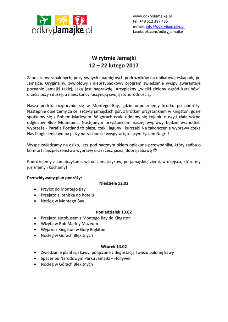 www.odkryjJamajke.pl tel. +48 512 387 435 e-mail: [email protected] facebook.com/odkryjjamajke W rytmie Jamajki 12 – 22 lutego 2017 Zapraszamy zapalonych, pozytywnych i namiętnych podróżników na unikatową eskapadę po Jamajce. Oryginalny, żywiołowy i nieprzypadkowy program zwiedzania wyspy gwarantuje poznanie Jamajki takiej, jaką jest naprawdę. Arcypiękny „wielki zielony ogród Karaibów” urzeka oczy i duszę, a mieszkańcy fascynują swoją różnorodnością. Nasza podróż rozpocznie się w Montego Bay, gdzie odpoczniemy krótko po podróży. Następnie obierzemy za cel szczyty jamajskich gór, z krótkim przystankiem w Kingston, gdzie spotkamy się z Bobem Marleyem. W górach czule oddamy się kojeniu duszy i ciała wśród odgłosów Blue Mountains. Następnym przystankiem naszej wyprawy będzie wschodnie wybrzeże - Parafia Portland to plaże, rzeki, laguny i kurczak! Na zakończenie wyprawy czeka Nas błogie lenistwo na plaży na zachodzie wyspy w tętniącym życiem Negril! Wyspę zwiedzamy na dziko, lecz pod bacznym okiem opiekuna-przewodnika, który zadba o komfort i bezpieczeństwo wyprawy oraz rzecz jasna, dobrą zabawę Podróżujemy z Jamajczykami, wśród Jamajczyków, po jamajskiej ziemi, w miejsca, które my już znamy i kochamy! Przewidywany plan podróży: Niedziela 12.02 Przylot do Montego Bay Przejazd z lotniska do hotelu Nocleg w Montego Bay Poniedziałek 13.02 Przejazd autobusem z Montego Bay do Kingston Wizyta w Bob Marley Muzeum Wyjazd z Kingston w Góry Błękitne Nocleg w Górach Błękitnych Wtorek 14.02 Zwiedzanie plantacji kawy, połączone z degustacją świeżo palonej kawy Spacer po Narodowym Parku Jamajki – Hollywell Nocleg w Górach Błękitnych www.odkryjJamajke.pl tel. +48 512 387 435 e-mail: [email protected] facebook.com/odkryjjamajke Środa 15.02 Przejazd z Gór Błękitnych do Port Antonio Spacer po Port Antonio, podczas którego odwiedzimy najpiękniejsze miejsca w mieście, lokalnych artystów i rzemieślników, a także zwyczajnych mieszkańców w niezwyczajnej scenerii Nocleg w Port Antonio Czwartek 16.02 Plażowanie w Port Antonio Wieczorem spacer promenadą przy marinie, mini plaża z barem do dyspozycji Nocleg w Port Antonio Piątek 17.02 Wyjazd na wyprawę w górę rzeki do wodospadów Reach Falls (kąpiele, pływanie, skoki do wody) Wieczorem wyjazd na koncert The Jolly Boys Nocleg w Port Antonio Sobota 18.02 Plażowanie na jednej z najpiękniejszych plaż Jamajki – Frenchman’s Cove Beach Opcjonalnie: spływ na tratwach po Rio Grande (obiad w czasie spływu i pływanie w rzece; dodatkowo płatne 70$/os) Nocleg w Port Antonio Niedziela 19.02 Przejazd autobusem z Port Antonio do Negril Wizyta w legendarnym Rick’s Cafe Nocleg w Negril Poniedziałek 20.02 Rejs po Morzu Karaibskim, wizyta w słynnym Pelican Bar – szansa zobaczenia delfinów na wolności Nocleg w Negril Wtorek 21.02 Pożegnanie z przewodnikiem (instrukcja na trasę do Montego Bay + bilety autobusowe na trasę Negril-Montego Bay) Nocleg w Negril Środa 22.02 Przejazd autobusem z Negril do Montego Bay Wylot z Montego Bay www.odkryjJamajke.pl tel. +48 512 387 435 e-mail: [email protected] facebook.com/odkryjjamajke Opiekun wyprawy: Piotrek Wasilewski - osoba kochająca życie i czerpiąca z niego pełnymi garściami. Zawodowo od wielu lat zawiązany z branżą motoryzacyjną w Polsce i Europie. Od młodych lat pasjonat podróży, muzyki i literatury. Osoba otwarta na ludzi, w iście hipisowskim stylu krocząca przez świat. Uczestnik niezliczonej liczby festiwali muzycznych. Miłośnik i poszukiwacz pozytywnych emocji z nutką adrenaliny. Przełamuje schematy, przekracza granice w poszukiwaniu sensu życia. Jego serce bije w rytmie reggae, więc wszystko na to wskazuje, że odnalazł na Jamajce swoje miejsce na Ziemi! Na Jamajce wcieli się w role opiekunaprzewodnika po wyspie. Koszt wyprawy to 1299 USD za uczestnika. Podany koszt wyprawy obejmuje opiekę polskiego przewodnika, przejazdy po wyspie, zakwaterowanie oraz atrakcje wymienione w planie podróży. Każdy uczestnik musi dodatkowo opłacić bilety lotnicze, wyżywienie w trakcie trwania całej wyprawy oraz ubezpieczenie zdrowotne (posiadanie indywidualnego ubezpieczenia jest warunkiem uczestnictwa w wyprawie). Oferujemy również pomoc w wyszukaniu oraz zakupie biletów lotniczych. Średnia cena podróży na Jamajkę wraz z noclegiem na trasie przelotu wynosi około 800 USD. Uczestnicy wyprawy, którzy będą lecieli na wyspę na własną rękę, muszą wylądować w Montego Bay najpóźniej w dniu 12.02.2017.