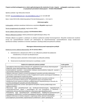 Program praktyki pedagogicznej w szkole ogólnodostępnej dla studentów III roku I stopnia – pedagogika wspierająca uczniów ze specjalnymi potrzebami edukacyjnymi – STUDIA STACJONARNE Opiekun praktyki: mgr Aleksandra Antonik Kontakt: [email protected], [email protected], tel. 514-200-589 Dyżur: środa 9.00-10.00, Zakład Specjalnych Potrzeb Edukacyjnych, s. 112, bud. D. Informacje ogólne Liczba godzin: praktyka zawodowa śródroczna w wymiarze 60 godzin zegarowych Termin przygotowania do praktyki: maj/czerwiec 2015r. Termin oddania dokumentacji z praktyki: do 30 kwietnia 2016 r. Miejsce odbywania praktyki: Szkoła podstawowa ogólnodostępna (klasy I-III) Praktyka odbywa się zgodnie z ustalonym ze szkolnym opiekunem praktyk harmonogramem. Wszystkie nieobecności studenta muszą być usprawiedliwione (student jest zobowiązany do natychmiastowego usprawiedliwienia swojej nieobecności Dyrektorowi Szkoły) i odrobione w terminie ustalonym z Dyrekcją Szkoły lub opiekunem praktyki. Wymagana dokumentacja przed rozpoczęciem praktyki Ostateczny termin oddania dokumentów: do 15 czerwca 2015 r. 2. Zaświadczenie o ubezpieczeniu NW na czas odbywania praktyki lub podpisanie oświadczenia, że nie jest się ubezpieczonym 3. Deklaracja wyboru placówek w której będzie się odbywało praktykę 4. Dostarczenie do placówek skierowania na praktykę z uczelni Zadania do wykonania podczas praktyki sporządzenie obserwacji lekcji w klasach I-III i wypełnienie trzech arkuszy obserwacyjnych (załącznik: arkusz obserwacji lekcji w klasie ogólnodostępnej) przeprowadzenie wywiadu z nauczycielem edukacji wczesnoszkolnej (załącznik: wywiad z nauczycielem edukacji wczesnoszkolnej) Zdobycie informacji o dwóch uczniach posiadających specjalne potrzeby edukacyjne, ewentualna analiza dokumentacji uczniów. Przygotowanie opisów zawierających dodatkowo cele działań wspierających rozwój tych dzieci. Praca w charakterze nauczyciela współorganizującego proces nauczania uczniów ze specjalnymi potrzebami edukacyjnymi. Przygotowanie pięciu konspektów lekcji (podpisanych przez opiekuna praktyki) uwzględniających indywidualizację w stosunku do uczniów posiadających specjalne potrzeby edukacyjne. Organizacja imprezy dla uczniów. Sporządzenie konspektu imprezy podpisanego przez opiekuna praktyki. Obserwacja zajęć specjalistycznych (np. korekcyjno-kompensacyjne, logopedycznych, socjoterapeutycznych, zajęcia z psychologiem lub inne prowadzone w placówce) i wypełnienie arkusza obserwacji (załącznik: obserwacja zajęć specjalistycznych) Prowadzenie zajęć specjalistycznych (rewalidacyjnych, dydaktyczno-wyrównawczych, rozwijających uzdolnienia) z uczniami posiadającymi specjalne potrzeby edukacyjne Zdobycie informacji na tematy związane z organizacją szkoły, zakresem obowiązków poszczególnych pracowników, najważniejszymi problemami z jakimi spotykają się 1 Liczba godzin 6 (po dwa w kl I, II, III) 1 4 20 2 5 6 4 nauczyciele w pracy pedagogicznej, stosowanymi metodami i formami pracy, formami pomocy psychologiczno-pedagogicznej stosowanymi w danej placówce itd. Wypełnienie arkusza z pytaniami dotyczącymi poszczególnych kwestii. Uczestnictwo w różnego typu zajęciach oferowanych przez placówkę tj. zajęcia specjalistyczne (korekcyjno-kompensacyjne, logopedyczne, socjoterapeutyczne, dydaktyczno-wyrównawcze, rehabilitacyjne i inne), wycieczki, imprezy dla uczniów, zajęcia pozalekcyjne, zajęcia świetlicowe, zajęcia w bibliotece. 10 Opracowanie dziennika praktyk 2 SUMA GODZIN 60 Przygotowanie dokumentacji z praktyki Termin oddania dokumentacji z praktyki upływa 30 kwietnia 2016 r. Cała dokumentacja ma być uporządkowana w skoroszycie i podpisana na grzbiecie imieniem i nazwiskiem studenta, określeniem trybu studiów, stopnia i roku oraz nazwą specjalności Dokumentacji nieuporządkowanej oraz umieszczonej w teczkach nie przyjmuję !!! Uporządkowanie dokumentacji w skoroszycie: Numer koszulki w skoroszyc ie 1 2 Dokumenty 1. pierwsza strona dzienniczka z pieczątką placówki (musi zawierać imię i nazwisko studenta, nr indeksu, dokładną nazwę szkoły z zaznaczeniem w jakich klasach odbywana była praktyka, imię i nazwisko opiekuna) 2. harmonogram praktyki z pieczątką placówki w której odbywana jest praktyka z podpisem dyrektora oraz podpisem opiekuna (wzór harmonogramu praktyki znajduje się w dzienniczku praktyki – strona 2) 3. opinia o studencie przygotowana przez opiekuna praktyki, z pieczątką placówki, podpisem dyrektora oraz opiekuna praktyki (formularz opinii znajduje się w dzienniczku praktyki – strona 8) 1. umowa dla opiekuna z każdego typu placówki (ogólnodostępnej i integracyjnej) powinna być wydrukowana dwustronnie w dwóch egzemplarzach (jeśli w placówce praktykę odbywa więcej niż jeden student, opiekun może wypełnić jedną umowę dla maksymalnie 3 osób) 2. do każdej umowy musi zostać wydrukowany rachunek do umowy (jeden) 3. oświadczenie osoby nie zatrudnionej w UAM (jedno) UWAGA: jeżeli opiekun praktyki rezygnuje z przyjęcia wynagrodzenia, musi wypełnić deklarację rezygnacji z wynagrodzenia 3 ksero pierwszej strony dzienniczka 4 ksero harmonogramu praktyki 5 ksero opinii opiekuna praktyki w placówce 6 7 wypełniona karta samooceny studenta, podpisana przez studenta (formularz w dzienniczku praktyki – strona 7) przebieg praktyki – wypełnione karty z dzienniczka praktyki opisujące realizowane zadania w trakcie odbywania praktyki podpisane przez opiekuna praktyki (strona 3 dzienniczka) 8 kartka z napisem załączniki 9 dwa opisy funkcjonowania uczniów ze specjalnymi potrzebami edukacyjnymi (powinny zawierać opis funkcjonowania w poszczególnych sferach oraz cele działań wspierających) 2 10 arkusze obserwacji zajęć specjalistycznych (5 arkuszy) 11 konspekty zajęć specjalistycznych podpisane przez opiekuna praktyki (6 konspektów) 12 Konspekty lekcji prowadzonych w charakterze nauczyciela współ