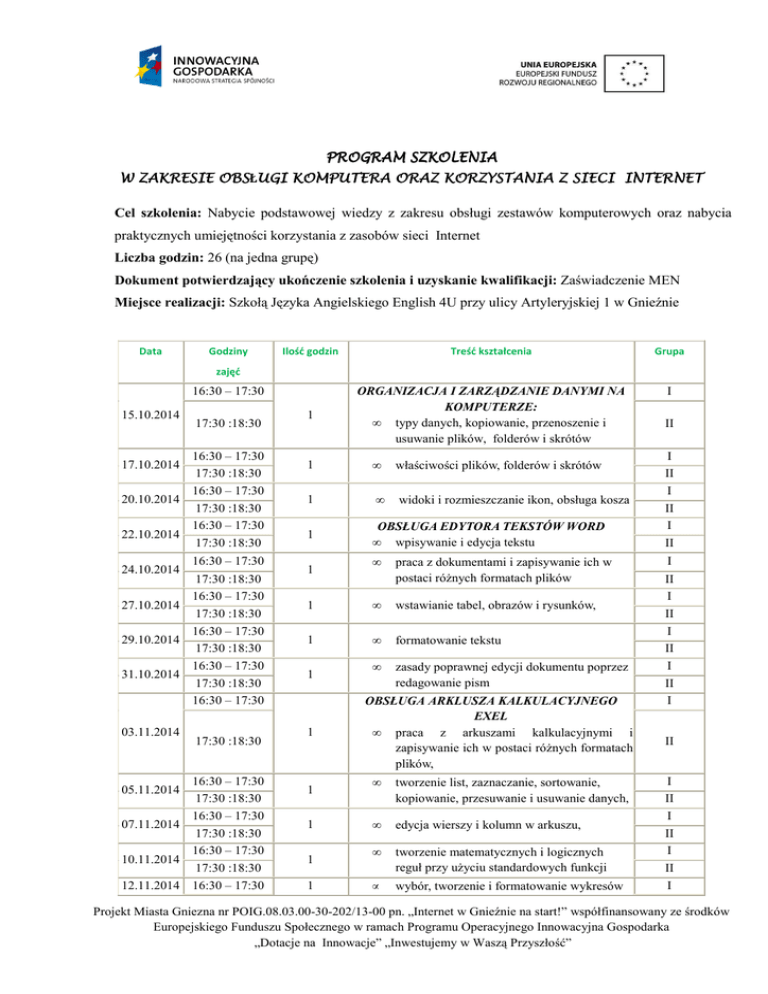 PROGRAM SZKOLENIA W ZAKRESIE OBSŁUGI OBS UGI KOMPUTERA ORAZ KORZYSTANIA Z SIECI INTERNET Cel szkolenia: Nabycie podstawowej wiedzy z zakresu obsługi zestawów komputerowych oraz nabycia praktycznych umiejętności korzystania z zasobów sieci Internet Liczba godzin: 26 (na jedna grupę) Dokument potwierdzający ukończenie szkolenia i uzyskanie kwalifikacji: Zaświadczenie MEN Miejsce realizacji: Szkołą Języka Angielskiego English 4U przy ulicy Artyleryjskiej 1 w Gnieźnie Data Godziny Ilość godzin Treść kształcenia Grupa I 1 ORGANIZACJA I ZARZĄDZANIE DANYMI NA KOMPUTERZE: • typy danych, kopiowanie, przenoszenie i usuwanie plików, folderów i skrótów zajęć 16:30 – 17:30 15.10.2014 17:30 :18:30 16:30 – 17:30 17:30 :18:30 16:30 – 17:30 20.10.2014 17:30 :18:30 16:30 – 17:30 22.10.2014 17:30 :18:30 17.10.2014 24.10.2014 16:30 – 17:30 17:30 :18:30 16:30 – 17:30 27.10.2014 17:30 :18:30 16:30 – 17:30 29.10.2014 17:30 :18:30 16:30 – 17:30 31.10.2014 17:30 :18:30 16:30 – 17:30 03.11.2014 17:30 :18:30 16:30 – 17:30 17:30 :18:30 16:30 – 17:30 07.11.2014 17:30 :18:30 16:30 – 17:30 10.11.2014 17:30 :18:30 12.11.2014 16:30 – 17:30 05.11.2014 II 1 • właściwości plików, folderów i skrótów 1 • widoki i rozmieszczanie ikon, obsługa kosza 1 OBSŁUGA EDYTORA TEKSTÓW WORD • wpisywanie i edycja tekstu I II I II I II • I 1 praca z dokumentami i zapisywanie ich w postaci róŜnych formatach plików 1 • wstawianie tabel, obrazów i rysunków, 1 • formatowanie tekstu • zasady poprawnej edycji dokumentu poprzez redagowanie pism 1 1 1 1 1 1 OBSŁUGA ARKLUSZA KALKULACYJNEGO EXEL • praca z arkuszami kalkulacyjnymi i zapisywanie ich w postaci róŜnych formatach plików, • tworzenie list, zaznaczanie, sortowanie, kopiowanie, przesuwanie i usuwanie danych, • edycja wierszy i kolumn w arkuszu, • tworzenie matematycznych i logicznych reguł przy uŜyciu standardowych funkcji • wybór, tworzenie i formatowanie wykresów II I II I II I II I II I II I II I II I Projekt Miasta Gniezna nr POIG.08.03.00-30-202/13-00 pn. „Internet w Gnieźnie na start!” współfinansowany ze środków Europejskiego Funduszu Społecznego w ramach Programu Operacyjnego Innowacyjna Gospodarka „Dotacje na Innowacje” „Inwestujemy w Waszą Przyszłość” 17:30 :18:30 16:30 – 17:30 14.11.2014 17:30 :18:30 16:30 – 17:30 17:30 :18:30 16:30 – 17:30 19.11.2014 17:30 :18:30 16:30 – 17:30 21.11.2014 17:30 :18:30 16:30 – 17:30 24.11.2014 17:30 :18:30 17.11.2014 16:30 – 17:30 17:30 :18:30 16:30 – 17:30 28.11.2014 17:30 :18:30 16:30 – 17:30 01.12.2014 17:30 :18:30 26.11.2014 1 • organizowanie danych na dysku twardym komputera: pliki, katalogi, skróty • popularne formaty zapisywania plików graficznych • kompresja stratna i bezstratna stosowana przy zapisie plików graficznych • 1 przekształcenia plików graficznych: rozdzielczość, rozmiar, kolory, nasycenie, kontrast, itp. 1 POCZTA ELEKTRONICZNA I INTERNET • bezpieczeństwo w sieci 1 • obsługa przeglądarek internetowych • interfejs przeglądarki internetowej i jego główne opcje 1 1 1 1 1 • • wyszukiwanie informacji nawigowanie po stronach WWW 1 • sklepy Internetowe 1 • aukcje internetowe 16:30 – 17:30 03.12.2014 17:30 :18:30 16:30 – 17:30 17:30 :18:30 16:30 – 17:30 08.12.2014 17:30 :18:30 16:30 – 17:30 10.12.2014 17:30 :18:30 16:30 – 17:30 05.12.2014 12.12.2014 17:30 :18:30 PODSTAWOWE ZAGADNIENIA Z ZAKRESU GRAFIKI KOMPUTEROWEJ • organizowanie danych na dysku twardym komputera: pliki, katalogi, skróty 1 • • 1 forum dyskusyjne i grupy dyskusyjne, Blogi zakładanie konta poczty elektronicznej, wysyłanie i odbieranie listów (e-maili), dołączanie załączników, ksiąŜka adresowa II I II I II I II I II I II I II I II I II I II I II I II I II I II Projekt Miasta Gniezna nr POIG.08.03.00-30-202/13-00 pn. „Internet w Gnieźnie na start!” współfinansowany ze środków Europejskiego Funduszu Społecznego w ramach Programu Operacyjnego Innowacyjna Gospodarka „Dotacje na Innowacje” „Inwestujemy w Waszą Przyszłość”