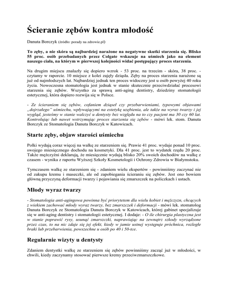 Ścieranie zębów kontra młodość Danuta Borczyk (źródło: porady na zdrowie.pl) To zęby, a nie skóra są najbardziej naraŜone na negatywne skutki starzenia się. Blisko 55 proc. osób przebadanych przez Colgate wskazuje na uśmiech jako na element naszego ciała, na którym w pierwszej kolejności widać postępujący proces starzenia. Na drugim miejscu znalazły się dopiero wzrok - 53 proc. na trzecim - skóra, 38 proc. czytamy w raporcie. 10 miejsce z kolei zajęły dziąsła. Zęby na proces starzenia naraŜone są juŜ od najmłodszych lat. Najbardziej jednak ten proces widoczny jest u osób powyŜej 40 roku Ŝycia. Nowoczesna stomatologia jest jednak w stanie skutecznie przeciwdziałać procesowi starzenia się zębów. Wszystko za sprawą anti-aging dentistry, dziedziny stomatologii estetycznej, która dopiero rozwija się w Polsce. - Ze ścieraniem się zębów, cofaniem dziąseł czy przebarwieniami, typowymi objawami „dojrzałego” uśmiechu, wpływającymi na estetykę uzębienia, ale takŜe na wyraz twarzy i jej wygląd, jesteśmy w stanie walczyć u dentysty bez względu na to czy pacjent ma 30 czy 60 lat. Kontrolując lub nawet wstrzymując proces starzenia się zębów - mówi lek. stom. Danuta Borczyk ze Stomatologia Danuta Borczyk w Katowicach. Starte zęby, objaw starości uśmiechu Polki wydają coraz więcej na walkę ze starzeniem się. Prawie 41 proc. wydaje ponad 10 proc. swojego miesięcznego dochodu na kosmetyki. Dla 41 proc. jest to wydatek rzędu 20 proc. TakŜe męŜczyźni deklarują, Ŝe miesięcznie wydają blisko 20% swoich dochodów na walkę z czasem - wynika z raportu WyŜszej Szkoły Kosmetologii i Ochrony Zdrowia w Białymstoku. Tymczasem walkę ze starzeniem się - zdaniem wielu ekspertów - powinniśmy zaczynać nie od zakupu kremu i maseczki, ale od zapobiegania ścieraniu się zębów. Jest ono bowiem główną przyczyną deformacji twarzy i pojawiania się zmarszczek na policzkach i ustach. Młody wyraz twarzy - Stomatologia anti-agingowa powinna być priorytetem dla wielu kobiet i męŜczyzn, chcących z wiekiem zachować młody wyraz twarzy, bez zmarszczek i deformacji - mówi lek. stomatolog Danuta Borczyk ze Stomatologia Danuta Borczyk w Katowicach, której gabinet specjalizuje się w anti-aging dentistry i stomatologii estetycznej. I dodaje: - O ile chirurgia plastyczna jest w stanie poprawić rysy, usunąć zmarszczki, naprawiając na zewnątrz szkody wyrządzone przez czas, to na nic zdaje się jej efekt, kiedy w jamie ustnej występuje próchnica, rozległe braki lub przebarwienia, powszechne u osób po 40 i 50-tce. Regularnie wizyty u dentysty Zdaniem dentystki walkę ze starzeniem się zębów powinniśmy zacząć juŜ w młodości, w chwili, kiedy zaczynamy stosować pierwsze kremy przeciwzmarszczkowe. - Regularne wizyty u dentysty, zaleczanie ubytków, obserwacja długości zębów, przeciwdziałanie ich ścieraniu się przy pomocy specjalnych szyn, a w razie konieczności, nieznaczne ich przedłuŜanie minimalnie inwazyjnymi metodami jest w stanie zapewnić młody wygląd twarzy i zębów nawet osobom w wieku 50-60 lat - mówi. Długość zębów, a zmarszczki A wszystko po to, Ŝeby skóra i mięśnie miały solidne oparcie w walce z grawitacją. - Zęby są jak rusztowania, które utrzymują mięśnie i skórę twarzy. W momencie, kiedy nasze zęby zaczynają się ścierać, stają się coraz krótsze, mięśnie z kolei tracą swoje oparcie, w konsekwencji wiotczeje skóra na twarzy i wokół ust. Efekt? Wyglądamy starzej niŜ w rzeczywistości. Jeszcze gorszy proces zachodzi w momencie, kiedy w jamie ustnej brakuje zębów, wówczas skóra i mięśnie nie mają w ogóle oparcia i bardzo szybko tracą swoją elastyczność - tłumaczy lek. stomatolog Danuta Borczyk. Zgrzytanie zębami sprzyja ścieraniu Ścieranie się zębów jest najczęstszym objawem starzenia się uśmiechu. W ciągu 10 lat ząb ściera się o ok. 0,3 mm, sam proces rozpoczyna się natomiast w momencie pojawienia się zębów stałych i towarzyszy nam przez całe Ŝycie. Wpływają na niego zarówno nawyki Ŝywieniowe, jak równieŜ procesy fizjologiczne. Zęby ścierają się szybciej u osób, które cierpią na bruksizm lub clenching, czyli patologiczne zgrzytanie lub zaciskanie zębów. Jak tłumaczy Danuta Borczyk, długość zębów wpływa znacząco na skórę twarzy, przede wszystkim na jej elastyczność i napięcie. - W miarę, jak z wiekiem skracają nam się zęby, zaczynają one znikać pod górną wargą. Sama warga traci takŜe podparcie, które do tej pory miała w zębach. Pojawiają się charakterystyczne zmarszczki wokół ust. Twarz nabiera starczych rysów. W skrajnych przypadkach ścieranie się zębów prowadzi do powstania Ŝółtych plam na brzegach zębów, czyli widać obnaŜoną zębinę. Tkanka ta bardziej chłonie barwniki, stąd ząb zaczyna dramatycznie się przebarwiać , moŜe temu towarzyszyć nadwraŜliwość a ignorowanie tego problemu moŜe doprowadzić do zapalenia miazgi i następnie nawet do utraty zęba - mówi dr Borczyk. PrzedłuŜanie zębów, takie jak u Demi Moore Jak więc walczyć ze ścieraniem się zębów? Dr Danuta Borczyk zaleca profilaktykę antiagingową. - Stała obserwacja stomatologiczna, regularne wizyty, które naprawiają ubytki sprawiają, sprawiają, Ŝe sam proces starzenia się jest pod pełną kontrolą. Z tego typy rozwiązania powinny korzystać juŜ osoby, które ukończyły 25 rok Ŝycia - mówi Borczyk. - Inaczej sprawa wygląda z osobami, które pojawiają się u dentysty juŜ ze startymi zębami. Wtedy moŜna je przedłuŜyć dzięki pracom protetycznym, przywracając im pierwotny wygląd. SłuŜą do tego zarówno wypełnienia kompozytowe, czyli plomby, które są szlifowane albo specjalne nakładki porcelanowe, tworzone w oparciu o formę z kompozytu. Sam zabieg jest mało inwazyjny, a efekt jest natychmiastowy - wyjaśnia Borczyk.