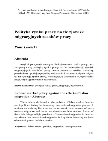 Artykuł pochodzi z publikacji: Czowiek i organizacja XXI wieku, (Red.) W. Harasim, Wyższa Szkoła Promocji, Warszawa 2013 Polityka rynku pracy na tle zjawisk migracyjnych zasobów pracy Piotr Lewicki Abstrakt Artykuł podejmuje tematykę funkcjonowania rynku pracy oraz związaną z nią politykę rynku pracy na tle intensyfikacji zjawisk migracyjnych zasobów pracy. Autor prowadzi analizę literatury przedmiotu i podejmuje próbę wskazania kierunku wpływu migracji na sytuację rynku pracy, wskazując jej znaczenie w jego stabilizacji, czyli ograniczania bezrobocia. Słowa kluczowe: polityka rynku pracy, migracja, bezrobocie Labour market policy against the effects of labor migration - Abstract The article is dedicated to the problem of labor market theories and it politics, facing the increasing international migration process. It reviews the existing literature on the economic determinants of international migration and impact on situation on labor market. Author of the article brings to light problems of international migration in theories and shows that international migration is key factor lowering the level of unemployment on labor market. Keywords: labor market politics, migration, unemployment 161 1. Wstęp Postępujące procesy globalizacyjne oraz zmniejszające się bariery komunikacyjne i informacyjne prowadzą do nasilających się zjawisk migracji zarobkowej. W maju 2004 roku Polska stała się pełnoprawnym członkiem Unii Europejskiej. Otworzyło to przed obywatelami naszego kraju wspólny unijny rynek pracy, a co za tym idzie ułatwioną migrację zarobkową. Coraz więcej młodych Polaków otwarcie deklaruje chęć opuszczenia Polski i poszukiwania zatrudnienia w krajach należących do Unii Europejskiej. Także coraz większa liczba ludzi w wieku powyżej trzydziestego roku życia odważniej zgłasza zainteresowanie podjęciem zatrudnienia na zachodzie Europy. Celem artykułu jest przedstawienie problematyki migracji zarobkowej Polaków w kontekście wstąpienia Polski do struktur Unii Europejskiej, który jest tematem budzącym zainteresowanie wśród polskich naukowców, jak również praktyków zarządzania i rozwoju kapitału ludzkiego. 2. Migracja na tle teorii opisujących funkcjonowanie rynków pracy. Zainteresowanie teoretyków rynków pracy skupia się głównie na badaniu związku mobilności pracowników z występującą sytuacją na rynkach pracy i występowaniem nierównowagi pomiędzy popytem i podażą na pracę, czyli najsilniej dolegliwym społecznie skutkiem jej występowania, jakim jest bezrobocie. Wątki dotyczące uwarunkowań ruchliwości pracowniczej, jej ograniczeń i wynikających stąd konsekwencji dla tworzenia i utrwalania bezrobocia zostały podjęte w teoriach zajmujących się zagadnieniami postępowania podmiotów rynku pracy.1 Neoklasyczne teorie rynku pracy wskazują na funkcjonowanie dwóch zasadniczych problemów badawczych rynku pracy: samego mechanizmu jego funkcjonowania oraz natury zachowań jednostki, jako uczestnika transakcji kupna-sprzedaży. Zgodnie z założeniem tradycyjnej teorii neoklasycznej rynku pracy, funkcjonuje on jako jedE. Kwiatkowski, Neoklasyczne teorie zatrudnienia, Tradycja i współczesność, Instytut Pracy i Spraw Socjalnych, Warszawa 1988, s. 18. 1 162 norodna i zunifikowana całość (homogeniczna), w której alokacja siły roboczej określana jest mechanizmem cenowym. Wskazany w teorii neoklasycznej model funkcjonowania gospodarki oczywiście nie oddaje w pełni rzeczywistości, gdyż w rzeczywistej gospodarce trudno jest mówić o doskonale konkurencyjnym rynku pracy. Rynku, na którym tylko za pomocą działania mechanizmu zmiany wynagrodzeń można ustalić stan równowagi, a co za tym idzie pełnego zatrudnienia. Jako kluczowy czynnik destabilizujący rynek pracy wskazywano problemy związane z występowaniem niewystarczającej mobilności pracowników. Zwolennicy neoklasycznej teorii zatrudnienia przyjmowali, że w celu zmniejszenia nierównowagi rynku pracy, konieczne jest wspieranie mobilności pracobiorców. Koncepcje segmentacyjne rynku pracy, w odróżnieniu od teorii neoklasycznych, przyjęły założenie o jego wewnętrznym zróżnicowaniu (heterogeniczności). Podstawową ideę koncepcji segmentacyjnej stanowi przeświadczenie, że dostęp do niektórych segmentów rynku pracy jest ograniczony. Ograniczony w tym sensie, że więcej ludzi chce podjąć w nich pracę, niż oferuje się tam wolnych miejsc pracy.2 Może więc dojść do sytuacji, kiedy wśród chętnych do zatrudnienia będą tworzyć się kolejki do miejsc pracy złożonych z bezrobotnych albo pracujących gdzie indziej, albo wreszcie jednych i drugich.3 Rozgraniczenie rynków częściowych przeprowadzone zostało na gruncie występowania mniej lub bardziej sformalizowanych kryteriów i warunków dostępu do nich. Powyższe kryteria i warunki dostępu określają stopień powiązania danego segmentu z innymi. Im są one wyraźniejsze, tym odleglejsze stają się rynki. Determinanty te wyznaczają w praktyce dopuszczalną skalę mobilności i substytucyjności siły roboczej, a bariery mobilności nie są sztywne. Pracobiorcy są w stanie zmieniać swą niekorzystną pozycję i jak się okazało w toku dalszych badań, zmieniają ją.4 Koncepcja tradycyjnego (statycznego) podziału rynku pracy nie zakłada funkcjonowania różnych zasad działania poszczególnych części rynków pracy w zakresie mechanizmów alokacyjnych i wyrówE. Kryńska (red.), Mobilność zasobów pracy - analiza i metody stymulacji, Instytut Pracy i Spraw Socjalnych, Warszawa 2000, s. 15. 3 W. Darity Jr. (red.), Labor Economics: Problems In Analyzing Labor Markets, Kluwer Academic Publishers, Recent Economic Thought Series, Boston 1993, s. 144. 4 F. WiIkinson (red.), Dynamics of Labour Market Segmentation, Academic Press, New York 1981, s. 26. 2 163 nywania podaży i popytu pracowników. Jako podstawowy regulator rynku wskazano mechanizm czysto płacow