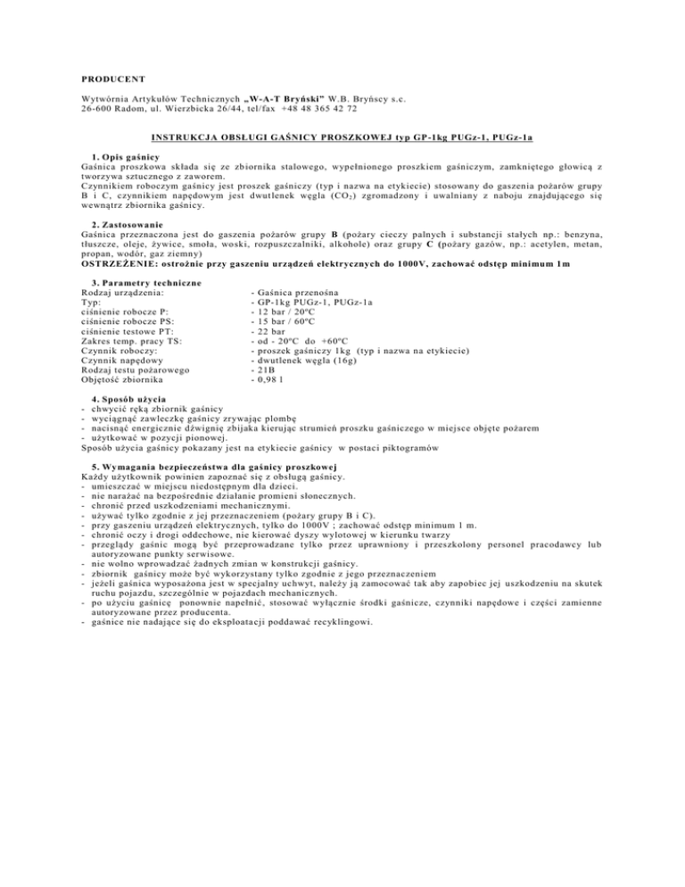 PRODUCENT Wytwórnia Artykułów Technicznych „W-A-T Bryński” W.B. Bryńscy s.c. 26-600 Radom, ul. Wierzbicka 26/44, tel/fax +48 48 365 42 72 INSTRUKCJA OBSŁUGI GAŚNICY PROSZKOWEJ typ GP -1kg PUGz-1, PUGz-1a 1. Opis gaśnicy Gaśnica proszkowa składa się ze zb iornika stalowego, wypełnionego proszkiem gaśniczym, zamkniętego głowicą z tworzywa sztucznego z zaworem. Czynnikiem roboczym gaśnicy jest proszek gaśniczy (typ i nazwa na etykiecie) stosowany do gaszenia pożarów grupy B i C, czynnikiem napędowym jest dwut lenek węgla (CO 2 ) zgromadzony i uwalniany z naboju znajdującego się wewnątrz zbiornika gaśnicy. 2. Zastosowanie Gaśnica przeznaczona jest do gaszenia pożarów grupy B (pożary cieczy palnych i substancji stałych np.: benzyna, tłuszcze, oleje, żywice, smoła, wo ski, rozpuszczalniki, alkohole) oraz grupy C (pożary gazów, np.: acetylen, metan, propan, wodór, gaz ziemny) OSTRZEŻENIE: ostrożnie przy gaszeniu urządzeń elektrycznych do 1000V, zachować odstęp minimum 1m 3. Parametry techniczne Rodzaj urządzenia: Typ: ciśnienie robocze P: ciśnienie robocze PS: ciśnienie testowe PT: Zakres temp. pracy TS: Czynnik roboczy: Czynnik napędowy Rodzaj testu pożarowego Objętość zbiornika - Gaśnica przenośna GP-1kg PUGz-1, PUGz-1a 12 bar / 20ºC 15 bar / 60ºC 22 bar od - 20ºC do +60ºC proszek gaśniczy 1kg (typ i nazwa na etykiecie) dwutlenek węgla (16g) 21B 0,98 l 4. Sposób użycia - chwycić ręką zbiornik gaśnicy - wyciągnąć zawleczkę gaśnicy zrywając plombę - nacisnąć energicznie dźwignię zbijaka kierując strumień proszku gaśniczego w miejsce objęte pożarem - użytkować w pozycji pionowej. Sposób użycia gaśnicy pokazany jest na etykiecie gaśnicy w postaci piktogramów 5. Wymagania bezpieczeństwa dla gaśnicy proszkowej Każdy użytkownik powinien zapoznać się z obsługą gaśnicy. - umieszczać w miejscu niedostępnym dla dzieci. - nie narażać na bezpośrednie działanie promieni słonecznych. - chronić przed uszkodzeniami mechanicznymi. - używać tylko zgodnie z jej przeznaczeniem (pożary grupy B i C). - przy gaszeniu urządzeń elektrycznych, tylko do 1000V ; zachować odstęp minimum 1 m. - chronić oczy i drogi oddechowe, nie kierować dyszy wylotowej w kierunku twarzy - przeglądy gaśnic mogą być przeprowadzane tylko przez uprawniony i przeszkolony personel pracodawcy lub autoryzowane punkty serwisowe. - nie wolno wprowadzać żadnych zmian w konstrukcji gaśnicy. - zbiornik gaśnicy może być wykorzystany tylko zgodnie z jego przeznaczeniem - jeżeli gaśnica wyposażona jest w specjalny uchwyt, należy ją zamocować tak aby zapobiec jej uszkodzeniu na skutek ruchu pojazdu, szczególnie w pojazdach mechanicznych. - po użyciu gaśnicę ponownie napełnić , stosować wyłącznie środki gaśnicze, czynniki napędowe i części zamienne autoryzowane przez producenta. - gaśnice nie nadające się do eksploata cji poddawać recyklingowi.