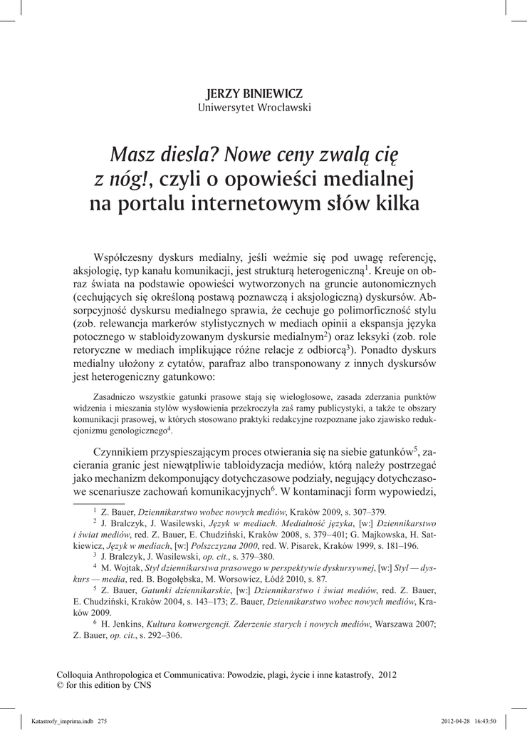 JERZY BINIEWICZ Uniwersytet Wroc³awski Masz diesla? Nowe ceny zwal¹ ciê z nóg!, czyli o opowieœci medialnej na portalu internetowym s³ów kilka Współczesny dyskurs medialny, jeśli weźmie się pod uwagę referencję, aksjologię, typ kanału komunikacji, jest strukturą heterogeniczną1. Kreuje on obraz świata na podstawie opowieści wytworzonych na gruncie autonomicznych (cechujących się określoną postawą poznawczą i aksjologiczną) dyskursów. Absorpcyjność dyskursu medialnego sprawia, że cechuje go polimorficzność stylu (zob. relewancja markerów stylistycznych w mediach opinii a ekspansja języka potocznego w stabloidyzowanym dyskursie medialnym2) oraz leksyki (zob. role retoryczne w mediach implikujące różne relacje z odbiorcą3). Ponadto dyskurs medialny ułożony z cytatów, parafraz albo transponowany z innych dyskursów jest heterogeniczny gatunkowo: Zasadniczo wszystkie gatunki prasowe stają się wielogłosowe, zasada zderzania punktów widzenia i mieszania stylów wysłowienia przekroczyła zaś ramy publicystyki, a także te obszary komunikacji prasowej, w których stosowano praktyki redakcyjne rozpoznane jako zjawisko redukcjonizmu genologicznego4. Czynnikiem przyspieszającym proces otwierania się na siebie gatunków5, zacierania granic jest niewątpliwie tabloidyzacja mediów, którą należy postrzegać jako mechanizm dekomponujący dotychczasowe podziały, negujący dotychczasowe scenariusze zachowań komunikacyjnych6. W kontaminacji form wypowiedzi, 1 Z. Bauer, Dziennikarstwo wobec nowych mediów, Kraków 2009, s. 307–379. J. Bralczyk, J. Wasilewski, Język w mediach. Medialność języka, [w:] Dziennikarstwo i świat mediów, red. Z. Bauer, E. Chudziński, Kraków 2008, s. 379–401; G. Majkowska, H. Satkiewicz, Język w mediach, [w:] Polszczyzna 2000, red. W. Pisarek, Kraków 1999, s. 181–196. 3 J. Bralczyk, J. Wasilewski, op. cit., s. 379–380. 4 M. Wojtak, Styl dziennikarstwa prasowego w perspektywie dyskursywnej, [w:] Styl — dyskurs — media, red. B. Bogołębska, M. Worsowicz, Łódź 2010, s. 87. 5 Z. Bauer, Gatunki dziennikarskie, [w:] Dziennikarstwo i świat mediów, red. Z. Bauer, E. Chudziński, Kraków 2004, s. 143–173; Z. Bauer, Dziennikarstwo wobec nowych mediów, Kraków 2009. 6 H. Jenkins, Kultura konwergencji. Zderzenie starych i nowych mediów, Warszawa 2007; Z. Bauer, op. cit., s. 292–306. 2 Colloquia Anthropologica et Communicativa: Powodzie, plagi, życie i inne katastrofy, 2012 © for this edition by CNS Katastrofy_imprima.indb 275 2012-04-28 16:43:50 276 JERZY BINIEWICZ zacieraniu granic gatunkowych, łamaniu konwencji należy widzieć komponent dynamizujący komunikację, czyniący z dyskursu medialnego dialogowe zdarzenie komunikacyjne. Dyskurs medialny zatem, semantyzując (transponując, modyfikując, mutując) narracje wytworzone przez autonomiczne dyskursy, kreując swój obraz świata, chętnie strukturyzuje go za pomocą kategorii pragmatycznych (na przykład kategoria infotainment w mechanizmie tabloidyzacji obrazu świata: fragmentacja, konkretyzacja, personalizacja, sensacjonizacja7). Procedura adaptacyjna, czyli schemat selekcji informacji oraz upraszczania obrazu świata, jawi się zatem jako konieczność komunikacyjna, wszak dzięki niej przeciętny odbiorca ma dostęp do złożonej rzeczywistości, ma szansę na uczestnictwo w dialogu społecznym. Przegląd literatury przedmiotu upoważnia do stwierdzenia, że dyskurs medialny jest strukturą heterogeniczną o różnorodnej referencji, uruchamiającą różne strategie narracji, aktywujące różne role retoryczne tożsame z określonymi relacjami z odbiorcą, strukturą sięgającą po różne gatunki mowy. Impulsem homogenizującym obraz świata jest niewątpliwie mechanizm selekcji informacji oraz aksjologizacji obrazu świata. Zbigniew Bauer8 widzi w konwergencji niezwykle dynamiczny proces przeobrażający współczesne dziennikarstwo pojmowane jako sposób oglądu rzeczywistości — mechanizm informowania i interpretowania świata. Zauważa przy tym, że: Konwergencja istniała od dawna, niemniej stała się fizycznie możliwa dzięki zaistnieniu nowych cyfrowych mediów i technik digitalizacji. Przestrzenią komunikacyjną — a przez to społecznym kontekstem — dla mediów podlegających konwergencji jest globalna Sieć, Internet. Siłę Internetu (będącego przestrzenią interaktywną i multimedialną komunikacji masowej) dostrzegły tradycyjne media (telewizja, radio, a zwłaszcza prasa). Platformą komunikacji aktywującą uwagę internautów są wielkie portale (na przykład wp.pl, gazeta.pl czy onet.pl), które kreując w atrakcyjny sposób swoje strony tytułowe, zapraszają do zapoznania się z wciągającą opowieścią o świecie: Dewastują obszar Natura 2000. Koszą, a urzędnicy nic Zabójstwo studentki w Krakowie: mnożą się zagadki Krzyżowali ludzi i zwierzęta. Powstało 155 zarodków-hybryd „Staruch”, szef kiboli Legii zatrzymany. „Czyn kryminalny” Policyjne auta rozwoziły gości po imprezie w Ostrołęce F-16 wypada z pasa i zaczyna dymić. Co robi pilot?9 7 8 9 M. Wojtak, op. cit., s. 83. Z. Bauer, op. cit., s. 380. www.wp.pl (dostęp: 3 sierpnia 2011). Colloquia Anthropologica et Communicativa: Powodzie, plagi, życie i inne katastrofy, 2012 © for this edition by CNS Katastrofy_imprima.indb 276 2012-04-28 16:43:50 Masz diesla? Nowe ceny zwal¹ ciê z nóg!, czyli o opowieœci medialnej 277 Internet jest ze swej natury przestrzenią dialogową, tak więc media preferujące narrację monologową (zdając sobie sprawę z faktu, że dzięki sieci informacje mogą przepływać bez ich pośrednictwa) zostały zmuszone do zaanektowania10 nowej przestrzeni komunikacji, potraktowania jej jako platformy nowej narracji, przełamującej ograniczenia komunikowania bezzwrotnego. Chcąc z niej uczynić środowisko ożywionych kontaktów, musiały w atrakcyjny sposób ją zaaranżować, uczynić z niej zarazem instru