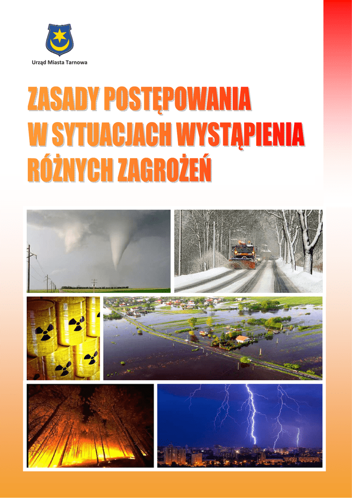 Urząd Miasta Tarnowa Wydział Bezpieczeństwa Publicznego Urząd Miasta Tarnowa Spis treści: Telefony alarmowe i informacyjne na terenie Miasta Tarnowa oraz zasady ich wykorzystania .......................................................................... 2 Niezbędnik na wypadek zagrożeń ..................................................................... 3 Postępowanie w przypadku wystąpienia zagrożeń wywołanych siłami natury................................................................................. 4 BURZA ............................................................................................................ 4 PORYWISTE WIATRY ...................................................................................... 7 PODTOPIENIA I POWODZIE.......................................................................... 10 UPAŁY........................................................................................................... 16 ŚNIEŻYCE I MROZY ....................................................................................... 19 Postępowanie w przypadku wystąpienia zagrożeń miejscowych................... 22 POŻAR .......................................................................................................... 22 NIEWYPAŁY, NIEWYBUCHY .......................................................................... 28 PORAŻENIE PRĄDEM ELEKTRYCZNYM ......................................................... 29 Postępowanie w przypadku wystąpienia zagrożeń technicznych................... 30 ZAGROŻENIE CHEMICZNE............................................................................. 30 ZAGROŻENIE RADIACYJNE............................................................................ 33 KATASTROFA BUDOWLANA......................................................................... 37 Postępowanie po usłyszeniu sygnałów alarmowych i komunikatów ............. 40 Zasady postępowania podczas ewakuacji....................................................... 46 Tarnów – 2016 r. ZASADY POSTĘPOWANIA W SYTUACJACH WYSTĄPIENIA RÓŻNYCH ZAGROŻEŃ 1 Wydział Bezpieczeństwa Publicznego Urząd Miasta Tarnowa TELEFONY ALARMOWE I INFORMACYJNE NA TERENIE MIASTA TARNOWA ORAZ ZASADY ICH WYKORZYSTANIA Europejski numer alarmowy ………………….. 112 Pogotowie Ratunkowe …………………………… 999 Straż Pożarna …………………………………………. 998 Policja ……………………………………………………. 997 Straż Miejska …………………………………………. 986 Pogotowie wodociągowo-kanalizacyjne …. 994 Pogotowie ciepłownicze ………………………… 993 Pogotowie gazowe …………………………………. 992 Pogotowie energetyczne ………………………… 991 Po wybraniu numeru alarmowego i zgłoszeniu się dyspozytora spokojnie i wyraźnie powiedz: 1. Co się stało. 2. Czy są poszkodowani – jeśli tak, powiedz jaki jest ich stan (czy są przytomni, czy oddychają). 3. Miejsce zdarzenia (adres, nazwa obiektu, charakterystyczne cechy miejsca). 4. Swoje imię i nazwisko, numer telefonu, z którego podawana jest informacja o zdarzeniu. Pamiętaj! Dyspozytor zawsze odkłada słuchawkę pierwszy! 2 ZASADY POSTĘPOWANIA W SYTUACJACH WYSTĄPIENIA RÓŻNYCH ZAGROŻEŃ Wydział Bezpieczeństwa Publicznego Urząd Miasta Tarnowa Niezbędnik na wypadek zagrożeń Zestaw, który w sytuacji zagrożenia może poprawić bezpieczeństwo i podnieść komfort twojej rodziny: • woda – około 4 litry na osobę dziennie, • urządzenie bądź tabletki do uzdatniania wody (dostępne w sklepach turystycznych), • koc termiczny (folia NRC) dla każdego członka rodziny – ogranicza wychłodzenie organizmu, • apteczka i poradnik pierwszej pomocy, • kuchenka gazowa wraz z zapasem gazu – w sklepach turystycznych można zakupić niewielkich rozmiarów kuchenki i kartusze z gazem, • trwała żywność – konserwy mięsne, płatki śniadaniowe, zupy w proszku, kasza, żywność liofilizowana, • scyzoryk wielofunkcyjny (otwieracz do puszek, nóż, itp.), • żel dezynfekujący do rąk, • koc lub śpiwór – po jednym na osobę, • przenośne radio wraz z bateriami zapasowymi, • latarka wraz z bateriami zapasowymi lub latarka na dynamo, świece z zapałkami , • podstawowe lekarstwa, • zapasowe klucze do domu i samochodu, • peleryna przeciwdeszczowa – po jednej na osobę, • duże torby plastikowe na śmieci, • środki czystości i higieny (tj. mydło, pasta i szczoteczka do zębów, szampon, damskie środki higieniczne, papier toaletowy, jeśli masz małe dzieci – pieluchy jednorazowe), • rękawice gumowe, • worek lub pojemnik wodoodporny, do którego będziesz mógł schować pieniądze oraz najważniejsze dokumenty (dowód tożsamości, akty urodzenia, papiery wartościowe, dokumentacja medyczna, dokumenty dotyczące domu i posiadanych gruntów, polisy ubezpieczeniowe, itp.). ZASADY POSTĘPOWANIA W SYTUACJACH WYSTĄPIENIA RÓŻNYCH ZAGROŻEŃ 3 Wydział Bezpieczeństwa Publicznego Urząd Miasta Tarnowa Postępowanie w przypadku wystąpienia zagrożeń wywołanych siłami natury BURZA Burza jest zjawiskiem wyładowań elektrycznych w atmosferze (błyskawice i grzmoty). Zjawisko to najczęściej występuje w okresie letnim. Burzom zwykle towarzyszą intensywne opady deszczu (również gradobicia) oraz bardzo silne i porywiste wiatry, które mogą dewastować lasy, niszczyć domy, trakcje kolejowe, linie energetyczne i telekomunikacyjne. Co roku wiele osób ginie od uderzenia piorunem. Piorun może wywołać również pożar. Postępowanie przed wystąpieniem zagrożenia Zabezpiecz swoje mienie: • przygotuj swoje mieszkanie: zamknij wszystkie okna i drzwi wejściowe, oceń stan okien, w razie konieczności odpowiednio je zabezpiecz, • umocuj lub usuń z zewnętrznych parapetów, balkonów, tarasów i podwórek przedmioty, które mogą być porwane przez wi