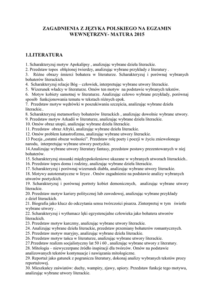 ZAGADNIENIA Z JĘZYKA POLSKIEGO NA EGZAMIN WEWNĘTRZNY- MATURA 2015 1.LITERATURA 1. Scharakteryzuj motyw Apokalipsy , analizując wybrane dzieła literackie. 2. Przedstaw topos oblężonej twierdzy, analizując wybrane przykłady z literatury . 3. Różne obrazy śmierci bohatera w literaturze. Scharakteryzuj i porównaj wybranych bohaterów literackich. 4. Scharakteryzuj relacje Bóg – człowiek, interpretując wybrane utwory literackie. 5. Wizerunek władcy w literaturze. Omów ten motyw na podstawie wybranych tekstów. 6. Motyw kobiety samotnej w literaturze. Analizując celowo wybrane przykłady, porównaj sposób funkcjonowania tematu w tekstach różnych epok. 7. Przedstaw motyw wędrówki w poszukiwaniu szczęścia, analizując wybrane dzieła literackie.. 8. Scharakteryzuj metamorfozy bohaterów literackich , analizując dowolnie wybrane utwory. 9. Przedstaw motyw Arkadii w literaturze, analizując wybrane dzieła literackie. 10. Omów obraz utopii, analizując wybrane dzieła literackie. 11. Przedstaw obraz Afryki, analizując wybrane dzieła literackie. 12. Omów problem katastrofizmu, analizując wybrane utwory literackie. 13 Poezja „ostatni obszar wolności”. Przedstaw rolę poety i poezji w życiu zniewolonego narodu, interpretując wybrane utwory poetyckie. 14.Analizując wybrane utwory literatury fantasy, przedstaw postawy prezentowanych w niej bohaterów. 15. Scharakteryzuj stosunki międzypokoleniowe ukazane w wybranych utworach literackich.. 16. Przedstaw topos domu i rodziny, analizując wybrane dzieła literackie. 17. Scharakteryzuj i porównaj wizerunek diabła, analizując wybrane utwory literackie. 18. Motywy autotematyczne w liryce . Omów zagadnienie na podstawie analizy wybranych utworów poetyckich. 19. Scharakteryzuj i porównaj portrety kobiet demonicznych, analizując wybrane utwory literackie. 20. Przedstaw motyw kariery politycznej lub zawodowej, analizując wybrane przykłady z dzieł literackich. 21. Biografia jako klucz do odczytania sensu twórczości pisarza. Zinterpretuj w tym świetle wybrane utwory . 22. Scharakteryzuj i wytłumacz lęki egzystencjalne człowieka jako bohatera utworów literackich. 23. Przedstaw motyw karczmy, analizując wybrane utwory literackie. 24. Analizując wybrane dzieła literackie, przedstaw przemiany bohaterów romantycznych. 25. Przedstaw motyw maryjny, analizując wybrane dzieła literackie. 26. Przedstaw motyw tańca w literaturze, analizując wybrane utwory literackie. 27.Przedstaw realizm socjalistyczny lat 50 i 60 , analizując wybrane utwory z literatury. 28. Mitologia – niewyczerpane źródło inspiracji dla twórców. Omów na podstawie analizowanych tekstów kontynuacje i nawiązania mitologiczne. 29. Reportaż jako gatunek z pogranicza literatury, dokonaj analizy wybranych tekstów prozy reportażowej. 30. Mieszkańcy zaświatów: duchy, wampiry, zjawy, upiory. Przedstaw funkcje tego motywu, analizując wybrane utwory literackie. 31. Małe formy poetyckie (np. epigramat, fraszka, bajka). Scharakteryzuj te gatunki, odwołując się do wybranych utworów literackich. 32. Obawy i lęki kobiety w literaturze feministycznej. Określ ich przyczyny, analizując wybrane utwory literackie. 33. Topos świata – teatru. Omów motyw, analizując wybrane utwory literackie. 34. Scharakteryzuj wątek człowieka w miejskiej dżungli, analizując wybrane utwory literackie. 35. Obraz powstań narodowych w literaturze XIX i XX wieku. Przedstaw zagadnienie , analizując wybrane dzieła literackie. 36. Miłość niespełniona w literaturze. Analizując celowo wybrane przykłady, omów wpływ tego uczucia na życie bohaterów literackich. 37. Przedstaw małe ojczyzny Polaków, analizując wybrane utwory literackie. 38. Kobieta upadła i kobieta – anioł. Porównaj motywy, analizując wybrane przykłady z literatury. 39. Przedstaw portret Żyda w literaturze polskiej, analizując wybrane utwory literackie. 40. Przedstaw motyw wróżbity i proroka, scharakteryzuj jego funkcję w wybranych utworach literackich. 41. Przedstaw małżeńskie dramaty, analizując wybrane utwory literackie. 42. Literackie apele, przesłania, testamenty, zanalizuj te sposoby dialogu pisarza z czytelnikami, odwołując się do wybranych przykładów z literatury. 43. Omów wzorzec filozofa , mędrca, analizując wybrane utwory literackie. 44. Przedstaw wizerunek Sarmaty, analizując wybrane dzieła literackie. 45. Wojna i jej różne oblicza. Problem przedstaw na podstawie analizy wybranych przykładów z literatury polskiej oraz obcej, uwzględniając kontekst epoki. 46. Przedstaw ludowe tradycje i obrzędy, analizując teksty literackie. 47. Ludowość a chłopomania. Dokonaj porównania i analizy zjawisk na podstawie literatury młodopolskiej i innych wybranych tekstów. 48. Omów obraz proletariatu na podstawie analizy wybranych utworów literackich. 49. Omów stoicyzm i epikureizm , interpretując wybrane teksty z literatury. 50. Scharakteryzuj literackie przykłady związku człowieka z przyrodą na podstawie analizy wybranych utworów . 51. Scharakteryzuj portrety literackich małżeństw, analizując wybrane utwory literackie. 52.Radość życia i cierpienie – dwa źródła i dwa tematy twórczości artystycznej. Scharakteryzuj problem, analizując wybrane utwory literackie. 53. Scharakteryzuj wizerunek polskiej wsi, utrwalony w wybranych utworach literackich. 54.Scharakteryzuj rolę nagości w literaturze, analizując wybrane utwory literackie. 55. Omów postać kobiety wyzwolonej, analizując wybrane utwory literackie. 56. Scharakteryzuj wpływ rewolucji na psychikę bohatera, analizując wybrane utwory literackie . 57. Scharakteryzuj postać artysty, analizując wybrane przykłady z literatury. 58.Scharakteryzuj postać duchownego, kaznodziei, analizując wybrane utwory literackie. 59. Przedstaw topos twórcy wyklętego na podstawie analizowanych tekstów . 60. Przedstaw wizerunek wiedźmy utrwalony w literaturze, interpretując wybra