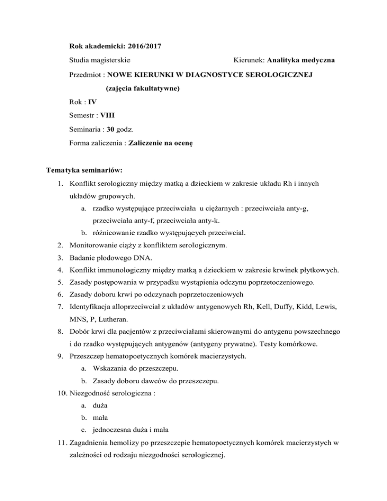 Rok akademicki: 2016/2017 Studia magisterskie Kierunek: Analityka medyczna Przedmiot : NOWE KIERUNKI W DIAGNOSTYCE SEROLOGICZNEJ (zajęcia fakultatywne) Rok : IV Semestr : VIII Seminaria : 30 godz. Forma zaliczenia : Zaliczenie na ocenę Tematyka seminariów: 1. Konflikt serologiczny między matką a dzieckiem w zakresie układu Rh i innych układów grupowych. a. rzadko występujące przeciwciała u ciężarnych : przeciwciała anty-g, przeciwciała anty-f, przeciwciała anty-k. b. różnicowanie rzadko występujących przeciwciał. 2. Monitorowanie ciąży z konfliktem serologicznym. 3. Badanie płodowego DNA. 4. Konflikt immunologiczny między matką a dzieckiem w zakresie krwinek płytkowych. 5. Zasady postępowania w przypadku wystąpienia odczynu poprzetoczeniowego. 6. Zasady doboru krwi po odczynach poprzetoczeniowych 7. Identyfikacja alloprzeciwciał z układów antygenowych Rh, Kell, Duffy, Kidd, Lewis, MNS, P, Lutheran. 8. Dobór krwi dla pacjentów z przeciwciałami skierowanymi do antygenu powszechnego i do rzadko występujących antygenów (antygeny prywatne). Testy komórkowe. 9. Przeszczep hematopoetycznych komórek macierzystych. a. Wskazania do przeszczepu. b. Zasady doboru dawców do przeszczepu. 10. Niezgodność serologiczna : a. duża b. mała c. jednoczesna duża i mała 11. Zagadnienia hemolizy po przeszczepie hematopoetycznych komórek macierzystych w zależności od rodzaju niezgodności serologicznej. 12. Zasady doboru krwi po przeszczepie hematopoetycznych komórek macierzystych. 13. Chimeryzm potransplantacyjny. 14. Niedokrwistość autoimmunohemolityczna (NAIH) : a. typu ciepłego, typu zimnego, typu mieszanego. b. diagnostyka oraz zasady doboru krwi w NAIH. 15. Aspekty kliniczne leczenia krwią w chirurgii i traumatologii, kardiochirurgii, położnictwie i ginekologii, neonatologii i pediatrii , u chorych z zaburzeniami krzepnięcia krwi. 16. Organizacja pracy w Pracowni Badań Konsultacyjnych Regionalnego Centrum Krwiodawstwa i Krwiolecznictwa . Zalecane podręczniki: 1. Wieczorek K., Bochenek-Jantczak D., Grajewska A. : Immunologia krwinek czerwonych. Pracownia serologii transfuzjologicznej, organizacja i metodyka badań, Wydawnictwo Warszawa 2010. 2. Fabijańska-Mitek J (red.): Immunologia krwinek czerwonych. Grupy krwi. OINPHARMA, Warszawa 2007. 3. Fabijańska-Mitek J (red.): Immunologia krwinek czerwonych. Niedokrwistości autoimmunohemolityczne. OINPHARMA, Warszawa 2007. 4. Fabijańska-Mitek J, Nowak J. Immunogenetyczne podstawy doboru dawców oraz przeszczepiania komórek krwiotwórczych i narządów. OINPHARMA, Warszawa 2007. 5. Łętowska M (red): Medyczne zasady pobierania krwi, oddzielania jej składników i wydawania, obowiązujące w jednostkach organizacji publicznej służby krwi. Instytut Hematologii i Transfuzjologii, Warszawa 2011. 6. Korsak J., Łętowska M. : Transfuzjologia kliniczna, Alfa Medica Press Wydawnictwo, Bielsko-Biała 2009, wyd.1 7. Nowak J., Fabijańska-Mitek J. : Podstawy immunogenetyki transplantacyjnej, Wydawnictwo Warszawa 2012, wyd.1 8. Mariańska B, Fabijańska-Mitek J, Windyga J: Badania laboratoryjne w hematologii, PZWL, Warszawa 2003. 9. Mintz P.D. Leczenie krwią. Zasady postępowania klinicznego. Sekcja Transfuzjologiczna Polskiego Towarzystwa Hematologów i Transfuzjologów, Warszawa 2001.