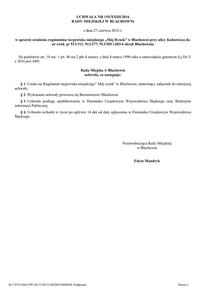 UCHWAŁA NR 155/XXIII/2016 RADY MIEJSKIEJ W BLACHOWNI z dnia 27 czerwca 2016 r. w sprawie ustalenia regulaminu targowiska miejskiego „Mój Rynek” w Blachowni przy ulicy Kubowicza dz. nr ewid. gr 913/311, 913/277, 913/305 i 603/4 obręb Blachownia Na podstawie art. 18 ust. 1 art. 40 ust.2 pkt 4 ustawy z dnia 8 marca 1990 roku o samorządzie gminnym (t,j Dz U z 2016.poz 449) Rada Miejska w Blachowni uchwala, co następuje: § 1. Ustala się Regulamin targowiska miejskiego” Mój rynek” w Blachowni, stanowiący załącznik do niniejszej uchwały. § 2. Wykonanie uchwały powierza się Burmistrzowi Blachowni. § 3. Uchwała podlega opublikowaniu w Dzienniku Urzędowym Województwa Śląskiego oraz Biuletynie informacji Publicznej. § 4. Uchwała wchodzi w życie po upływie 14 dni od daty ogłoszenia w Dzienniku Urzędowym Województwa Śląskiego. Przewodnicząca Rady Miejskiej w Blachowni Edyta Mandryk Id: C9741266-C9F2-4C13-9CC2-B5DD73084D50. Podpisany Strona 1 Załącznik Nr 1 do Uchwały Nr 155/XXIII/2016 Rady Miejskiej w Blachowni z dnia 27 czerwca 2016 r. § 1. Właścicielem targowiska „Mój Rynek” w Blachowni przy ulicy Kubowicza zlokalizowanego na działkach Nr ewid.: 913/311, oraz fragmentach działek Nr ewid. 913/277, 913/305, 603/4 – obręb Blachownia (zwanym dalej: „Rynek”) jest Gmina Blachownia (zwana dalej: „Gmina”). § 2. 1. Jednostką organizacyjną zarządzającą Rynkiem w imieniu i na rzecz Gminy jest jednostka budżetowa gminy „Zarząd Mieniem Komunalnym” w Blachowni ul. Miodowa 4a (zwany dalej: „Zarządca”). 2. Kierownikiem Rynku jest osoba wyznaczona przez Zarządcę działającą w jego imieniu. 3. Ilekroć w Regulaminie targowiska jest mowa o: a) Produktach rolno spożywczych – są to: produkty rolne, runo leśne, dziczyzna, organizmy morskie i słodkowodne w postaci surowców, półproduktów i wyrobów gotowych otrzymywanych z tych surowców i półproduktów, w tym środki spożywcze. b) Regulaminie – Regulamin targowiska Mój rynek w Blachowni. c) Sprzedającym – osoby fizyczne, osoby prawne i jednostki organizacyjne nieposiadające osobowości prawnej sprzedające artykuły na terenie targowiska i mogące uczestniczyć w obrocie towarowym. d) Stanowisku handlowym – oznacza rodzaj miejsca (stanowiska) sprzedaży określonym w §6 Regulaminu. e) Wyrobie rękodzielniczym – wyrób wytworzony w sposób nieprzemysłowy, posiadający walory artystyczne. § 3. Nadzór nad przestrzeganiem niniejszego Regulaminu sprawuje Burmistrz Blachowni. § 4. 1. Rynek jest czynny od poniedziałku do soboty. 2. W dniach od poniedziałku do piątku w godzinach od 600 do 1500. 3. W soboty w godzinach od 600 do 1300. 4. Możliwe jest funkcjonowanie rynku w inne dni w przypadku okazjonalnych imprez oraz na wniosek najemców, w przypadku uruchomienia z tej okazji 50% powierzchni handlowej. 5. Zgodę na funkcjonowanie rynku w innych terminach wydaje Burmistrz Blachowni § 5. 1. Rynek jest oznaczony tablicą informacyjną o treści: „Targowisko Mój Rynek w Blachowni” oraz informacją, że budowa Targowiska była współfinansowana ze środków Programu Rozwoju Obszarów Wiejskich na lata 2007-2013 w ramach działania 321 „Podstawowe usługi dla gospodarki i ludności wiejskiej”. 2. Na tablicy zamieszczone są również podstawowe informacje dotyczące funkcjonowania Rynku, tj. nazwa i adres Właściciela oraz Zarządcy Rynku, Regulamin Rynku, wysokość opłaty targowej, zasady rejestracji oraz położenie stanowisk handlowych i wewnętrzne informacje oraz ogłoszenia dotyczące funkcjonowania Rynku. § 6. 1. Sprzedaż na Rynku odbywa się wyłącznie na stanowiskach handlowych, po zawarciu umowy najmu na pawilon handlowy lub zawarcia umowy najmu na pozostałe stanowiska handlowe, oraz na miejscach wyznaczonych do handlu „z wolnej ręki”. 2. Położenie stanowisk handlowych wraz z numerami porządkowymi oraz warunkami rezerwacji i najmu stanowisk handlowych są zawarte w Załączniku Nr 1 do Regulaminu. 3. Targowisko posiada następujące rodzaje stanowisk handlowych: a) Pawilony handlowe zadaszone stałe w ilości 10 szt o łącznej powierzchni 178,72 m2, b) Wiaty zadaszone do handlu stacjonarnego; 4 moduły 8 ladowe, 24 moduły 1 ladowe, c) Wiaty zadaszone do handlu z samochodu; 3 x 6 stanowisk samochodowych, d) Miejsca na placu targowym przeznaczone do handlu „z wolnej ręki”, e) Miejsca na placu targowym przeznaczone do handlu z samochodu. Id: C9741266-C9F2-4C13-9CC2-B5DD73084D50. Podpisany Strona 1 4. Ogólna powierzchnia handlowa wiat podpunkt b i c wynosi 558 m2, co stanowi 100 % powierzchni handlowej przeznaczonej do najmu. 5. Minimum 50,0% powierzchni handlowej, z wyjątkiem pawilonów jest zarezerwowane do sprzedaży produktów rolno-spożywczych. 6. W przypadku braku zainteresowania sprzedażą towarów rolno-spożywczych na 50% powierzchni handlowej, dopuszcza się możliwość zagospodarowania niewykorzystanych miejsc do sprzedaży pozostałych towarów. 7. W przypadku gdy wynajęciem stanowiska handlowego będzie zainteresowany więcej niż jeden sprzedający, Zarządca przeprowadzi ustną licytację stawki czynszu na okres jednego miesiąca lub trwania imprezy okazjonalnej o określonej tematyce. § 7. Uprawnionymi do prowadzenia handlu na Rynku są osoby fizyczne, osoby prawne oraz jednostki organizacyjne nie posiadające osobowości prawnej mogące uczestniczyć w obrocie towarowym. § 8. 1. Na Rynku mogą być sprzedawane wszystkie towary, z wyłączeniem: 1) spirytusu i napojów alkoholowych; 2) produktów ropopochodnych niekonfekcjonowanych; 3) środków farmakologicznych, materiałów medycznych; 4) broni, amunicji oraz materiałów wybuchowych i pirotechnicznych; 5) zagranicznych banknotów i monet będących w obiegu oraz papierów wartościowych, 6) grzybów świeżych i suszonych nie posiadających atestów określonych przez odrębne przepisy; 7) innych artykułów, których sprzedaż jest zabroniona lub regul