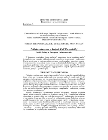 ZDROWIE DOBROSTAN 4/2013 DOBROSTAN I SPOŁECZEŃSTWO ROZDZIAŁ X Katedra Zdrowia Publicznego, Wydział Pielęgniarstwa i Nauk o Zdrowiu, Uniwersytet Medyczny w Lublinie Public Health Department, Faculty of Nursing and Health Sciences, Medical University of Lublin TERESA BERNADETTA KULIK, KINGA ZDUNEK, ANNA PACIAN Polityka zdrowotna w krajach Unii Europejskiej Health Policy in European Union countries W literaturze przedmiotu słowo „polityka” wywodzące się od greckiego „polis” jest definiowane z punktu widzenia dwóch perspektyw: teoretycznej i praktycznej. Ujęcie teoretyczne w centrum zainteresowania stawia poglądy natomiast pragmatyczne stanowisko koncentruje swoją uwagę na działaniach. Politologowie od dawna sygnalizują podwójny sens, który przypisywany jest pojęciu polityka. W języku polskim z pewną trudnością przyjmuje się popularne w krajach anglosaskich rozróżnienie na „policy” i „politics” [10]. PERSPEKTYWA TEORETYCZNA Polityka w najszerszym ujęciu, jako „politics”, jest formą aktywności ludzkiej, której celem jest tworzenie, zachowanie oraz poprawa ogólnych zasad życia [5]. W perspektywie teoretycznej jest ona nierozłącznie związana z fenomenem konfliktu i współpracy. Z jednej strony na politycznej arenie ścierają się sprzeczne opinie, odmienne pragnienia, konkurencyjne potrzeby i przeciwstawne interesy, z drugiej główni aktorzy chcąc wpływać na kształtowanie zasad muszą działać wraz z innymi. Heywood proponuje cztery perspektywy definiowania polityki. W tym celu odwołuje się do sztuki rządzenia, spraw publicznych, kompromisu i konsensusu, władzy oraz dystrybucji zasobów [5]. Według Włodarczyka definiowanie polityki zdrowotnej wymaga przyjęcia dwóch różnych podejść: opisowego i normatywnego [18]. Perspektywa opisowa odpowiada na pytanie: „jaka jest polityka zdrowotna?”, podczas gdy ujęcie normatywne skupia się na tym jaka powinna być polityka zdrowotna. Podejście opisowe umożliwia precyzyjny opis sytuacji, jej interpretację i próby wyjaśniania oraz pozwala na wypracowanie charakterystyki zdarzeń w określonym miejscu i czasie, dzięki czemu możliwe jest wypracowanie wyabstrahowanych modeli. Podejście normatywne poszukuje narzędzi pomagających stwierdzić jakie są cechy „dobrej”, „właściwej” i „słusznej” polityki zdrowotnej, która byłaby najbardziej adekwatna dla środowiska, w którym będzie realizowana. ZDROWIE I DOBROSTAN NR 4 /2013 Dobrostan społeczeństwo Model stworzony przez Walta i Gilson [15] wyraża trójelementowe podejście do polityki zdrowotnej. Bierze pod uwagę jej treści, konteksty warunkujące charakter (determinanty) oraz sam proces. We wszystkie trzy składniki są uwikłani aktorzy polityki zdrowotnej na poziomach: jednostkowym, grupowym i organizacyjnym. Aktorzy pozostają pod wpływem treści, procesów i kontekstów, w których funkcjonują, żyją i pracują. Te są konstruowane przez elementy takie jak niestabilność polityczna, ideologia, doświadczenia historyczne i kultura. Proces tworzenia polityki, czyli sposób wyłaniania się priorytetów oraz ich zakres, jest warunkowany działaniami poszczególnych aktorów, ich pozycją w strukturach władzy oraz ich cechami i oczekiwaniami. Treści polityki są wypadkową wszystkich wcześniej wspomnianych elementów [15]. Zakres definicyjny pojęcia poszerzał się wraz z rozwojem nowych międzynarodowych i globalnych inicjatyw na rzecz zdrowia. Według Światowej Organizacji Zdrowia (WHO) krajowa polityka zdrowotna powinna wyrażać cele dążące do poprawy sytuacji zdrowotnej, określać priorytety w obrębie tych celów oraz wskazywać na główne kierunki ich realizacji. Polityka zdrowotna wskazuje na to, co powinno być zrobione, kto powinien to zrobić, w jakim okresie czasu oraz określa konieczne zasoby finansowe [16]. PERSPEKTYWA PRAKTYCZNA W grupie europejskich aktorów odgrywających kluczowe role w teatrze międzynarodowej polityki zdrowotnej wyróżnia się trzy główne instytucje: Rada Europy, Biuro Europejskie Światowej Organizacji Zdrowia oraz Unia Europejska. Głównym założeniem działalności Rady Europy jest wypracowanie wspólnych i demokratycznych zasad na podstawie Europejskiej Konwencji Praw Człowieka i innych dokumentów dotyczących ochrony każdego człowieka. Rada Europy podejmuje w swych działaniach także kwestie związane ze zdrowiem. Priorytetowo traktuje zagadnienia dotyczące: bioetyki, zachowania równowagi pomiędzy postępem i poszanowaniem praw człowieka oraz uzależnień od narkotyków. Wyrazem walki z uzależnieniami było powołanie Grupy Pompidou, która stanowi ministerialne forum zwalczające nielegalny obrót narkotykami, ustala powszechne i obowiązujące normy jakości leków i podejmuje działania na rzecz ochrony zdrowia zgodnie z zasadami zawartymi w Europejskiej Karcie Społecznej. Biuro Europejskie Światowej Organizacji Zdrowia (WHO) z siedzibą w Kopenhadze, w skład którego wchodzą obecnie 53 państwa członkowskie obejmuje swoim zasięgiem większość regionu. Współpracuje z wieloma instytucjami zaangażowanymi w działalność na poziomie zdrowia publicznego. Obecnie na poziomie europejskim realizowane są cele strategiczne przyjęte w ramach średniookresowego planu strategicznego na lata 2008-2013. Dotyczą one między innymi kwestii nierówności w dostępie do zdrowia, problemu chorób zakaźnych. Organami zarządzającymi działającymi na poziomie europejskim są Regionalny Komitet WHO i Komitet Stały Komitetu Regionalnego. Komitet Regionalny składa się z członków wszystkich państw członkowskich Regionu Europejskiego WHO spotykających się corocznie we wrześniu, w celu wskazania kierunku polityki regionalnej, przeglądu 158 Teresa Bernadetta Kulik, Kinga Zdunek, Anna Pacian Polityka zdrowotna w krajach Unii Europejskiej dokonanych działań oraz zaakceptowania budżetu. Stały Komitet pełni funkcję doradczą ora