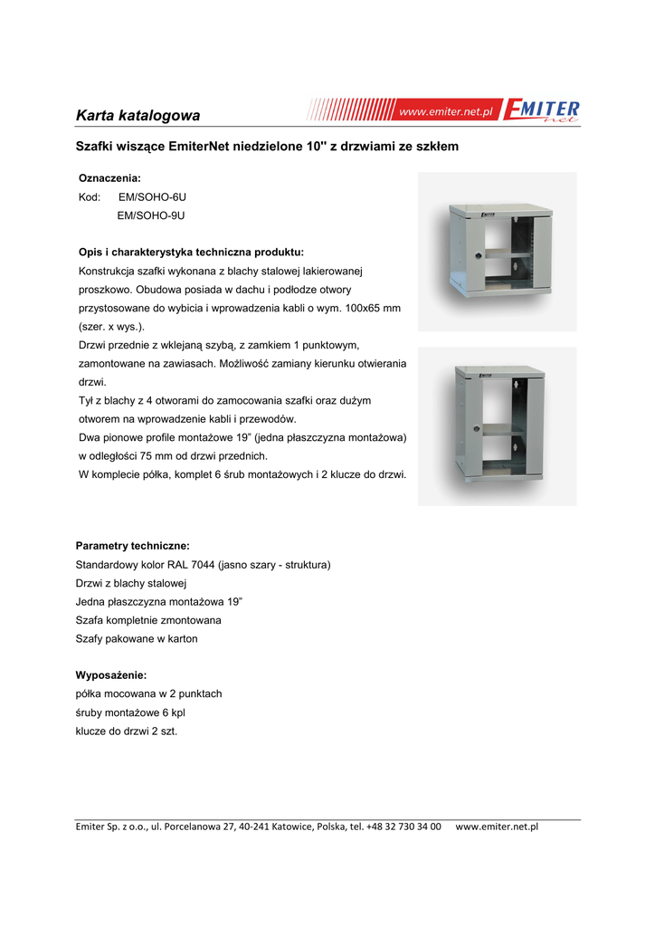 Karta katalogowa Szafki wiszące EmiterNet niedzielone 10'' z drzwiami ze szkłem Oznaczenia: Kod: EM/SOHO-6U EM/SOHO-9U Opis i charakterystyka techniczna produktu: Konstrukcja szafki wykonana z blachy stalowej lakierowanej proszkowo. Obudowa posiada w dachu i podłodze otwory przystosowane do wybicia i wprowadzenia kabli o wym. 100x65 mm (szer. x wys.). Drzwi przednie z wklejaną szybą, z zamkiem 1 punktowym, zamontowane na zawiasach. MoŜliwość zamiany kierunku otwierania drzwi. Tył z blachy z 4 otworami do zamocowania szafki oraz duŜym otworem na wprowadzenie kabli i przewodów. Dwa pionowe profile montaŜowe 19” (jedna płaszczyzna montaŜowa) w odległości 75 mm od drzwi przednich. W komplecie półka, komplet 6 śrub montaŜowych i 2 klucze do drzwi. Parametry techniczne: Standardowy kolor RAL 7044 (jasno szary - struktura) Drzwi z blachy stalowej Jedna płaszczyzna montaŜowa 19” Szafa kompletnie zmontowana Szafy pakowane w karton WyposaŜenie: półka mocowana w 2 punktach śruby montaŜowe 6 kpl klucze do drzwi 2 szt. Emiter Sp. z o.o., ul. Porcelanowa 27, 40-241 Katowice, Polska, tel. +48 32 730 34 00 www.emiter.net.pl Karta katalogowa WYMIARY KOD wysoko ść szerokość [mm] głębokość [mm] wysokość [mm] nośność [kg] masa [kg] EM/SOHO-6U 6U 325 300 310 20 7 EM/SOHO-9U 9U 325 330 445 20 10 KOD otwory montaŜowe odstęp w poziomie [mm] otwory montaŜowe odstęp w pionie [mm] rozmiar otworu na tylnej ścianie szer. x wys. [mm] EM/SOHO-6U 220 195 180x270 EM/SOHO-9U 220 285 180x400 DołoŜyliśmy wszelkich starań, aby przedstawione informacje były rzetelne i kompletne. Jednak nie ponosimy odpowiedzialności za dokładność i kompletność danych oraz w szczególności nie moŜemy zagwarantować, Ŝe niniejsza specyfikacja nie zawiera błędów lub pomyłek. Informacje zawarte w niniejszej specyfikacji mogą zostać zmienione w kaŜdej chwili bez powiadomienia. Emiter Sp. z o.o., ul. Porcelanowa 27, 40-241 Katowice, Polska, tel. +48 32 730 34 00 www.emiter.net.pl