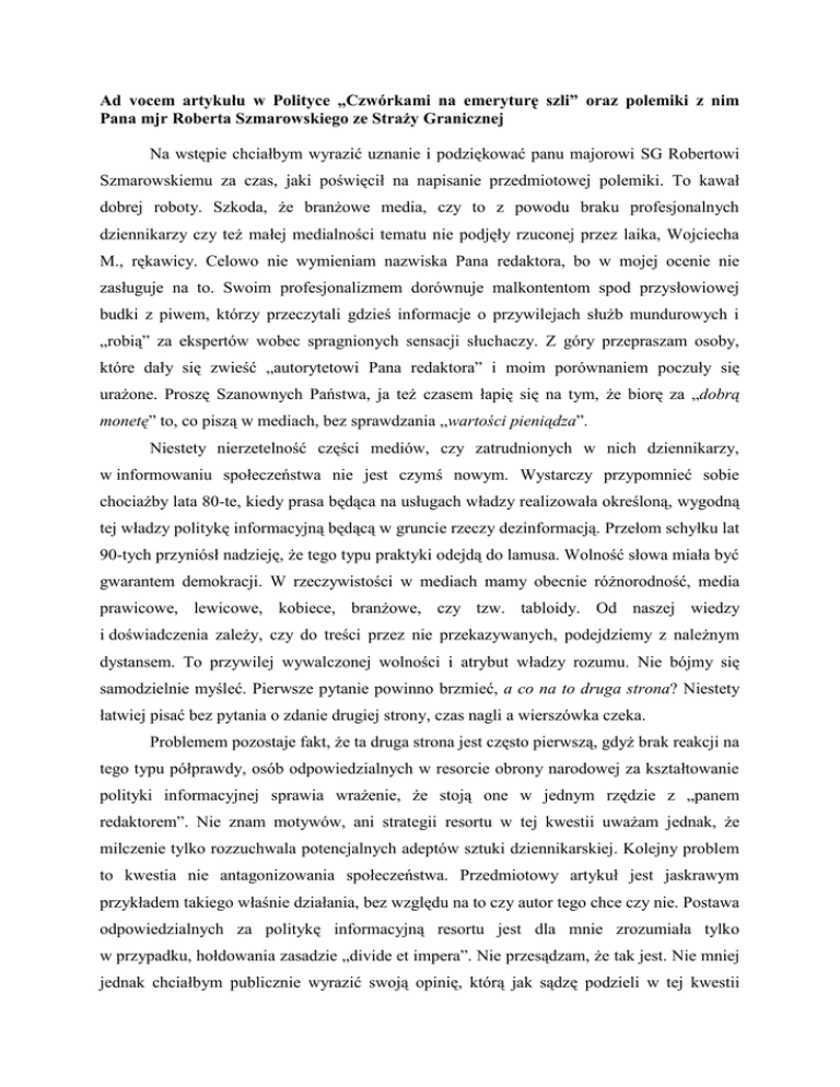 Ad vocem artykułu w Polityce „Czwórkami na emeryturę szli” oraz polemiki z nim Pana mjr Roberta Szmarowskiego ze Straży Granicznej Na wstępie chciałbym wyrazić uznanie i podziękować panu majorowi SG Robertowi Szmarowskiemu za czas, jaki poświęcił na napisanie przedmiotowej polemiki. To kawał dobrej roboty. Szkoda, że branżowe media, czy to z powodu braku profesjonalnych dziennikarzy czy też małej medialności tematu nie podjęły rzuconej przez laika, Wojciecha M., rękawicy. Celowo nie wymieniam nazwiska Pana redaktora, bo w mojej ocenie nie zasługuje na to. Swoim profesjonalizmem dorównuje malkontentom spod przysłowiowej budki z piwem, którzy przeczytali gdzieś informacje o przywilejach służb mundurowych i „robią” za ekspertów wobec spragnionych sensacji słuchaczy. Z góry przepraszam osoby, które dały się zwieść „autorytetowi Pana redaktora” i moim porównaniem poczuły się urażone. Proszę Szanownych Państwa, ja też czasem łapię się na tym, że biorę za „dobrą monetę” to, co piszą w mediach, bez sprawdzania „wartości pieniądza”. Niestety nierzetelność części mediów, czy zatrudnionych w nich dziennikarzy, w informowaniu społeczeństwa nie jest czymś nowym. Wystarczy przypomnieć sobie chociażby lata 80-te, kiedy prasa będąca na usługach władzy realizowała określoną, wygodną tej władzy politykę informacyjną będącą w gruncie rzeczy dezinformacją. Przełom schyłku lat 90-tych przyniósł nadzieję, że tego typu praktyki odejdą do lamusa. Wolność słowa miała być gwarantem demokracji. W rzeczywistości w mediach mamy obecnie różnorodność, media prawicowe, lewicowe, kobiece, branżowe, czy tzw. tabloidy. Od naszej wiedzy i doświadczenia zależy, czy do treści przez nie przekazywanych, podejdziemy z należnym dystansem. To przywilej wywalczonej wolności i atrybut władzy rozumu. Nie bójmy się samodzielnie myśleć. Pierwsze pytanie powinno brzmieć, a co na to druga strona? Niestety łatwiej pisać bez pytania o zdanie drugiej strony, czas nagli a wierszówka czeka. Problemem pozostaje fakt, że ta druga strona jest często pierwszą, gdyż brak reakcji na tego typu półprawdy, osób odpowiedzialnych w resorcie obrony narodowej za kształtowanie polityki informacyjnej sprawia wrażenie, że stoją one w jednym rzędzie z „panem redaktorem”. Nie znam motywów, ani strategii resortu w tej kwestii uważam jednak, że milczenie tylko rozzuchwala potencjalnych adeptów sztuki dziennikarskiej. Kolejny problem to kwestia nie antagonizowania społeczeństwa. Przedmiotowy artykuł jest jaskrawym przykładem takiego właśnie działania, bez względu na to czy autor tego chce czy nie. Postawa odpowiedzialnych za politykę informacyjną resortu jest dla mnie zrozumiała tylko w przypadku, hołdowania zasadzie „divide et impera”. Nie przesądzam, że tak jest. Nie mniej jednak chciałbym publicznie wyrazić swoją opinię, którą jak sądzę podzieli w tej kwestii wielu z moich kolegów żołnierzy i funkcjonariuszy pozostałych służb mundurowych. Z doświadczenia wiem, że polemika do artykułu nie zostanie zamieszczona, patrz casus „Gazety Wyborczej”, która w jednym zdaniu odmówiła Konwentowi Dziekanów publikacji stosownej polemiki będącej odpowiedzią na żonglerkę faktami. Kontynuując, chciałbym zauważyć, że służby mundurowe jak wszystkie grupy zawodowe i społeczne starają się bronić swoich uprawnień, i nie ma tu nic do rzeczy ironia pana Wojciecha M. Proszę zauważyć, że żołnierzy również dotknęły skutki kryzysu finansów państwa. Przejawem tego był brak podwyżek uposażeń żołnierzy od roku 2009 do 1 lipca 2012, kiedy wzrosły one o kwotę 300 zł brutto, co w żadnym stopniu nie rekompensuje nawet jednorocznej inflacji. Warunkiem powodzenia jest jednak, aby w proces ratowania finansów państwa włączyli się wszyscy poczynając od przedstawicieli mediów, w tym dziennikarzy, działaczy związków sportowych, poprzez urzędników administracji rządowej, samorządowej, prokuratorów, sędziów, lekarzy, górników, rolników, duchowieństwa, biznesmenów, przedstawicieli wolnych zawodów, polityków, posłów, euro posłów nie wykluczając. Na marginesie dodam, że na kpinę z przyzwoitości zakrawa możliwość otrzymywania przez euro posłów emerytury po ukończeniu 63 roku życia, dodatkowo zwiększanej o 1140 zł za każdy rok posłowania w sytuacji, poszukiwania oszczędności, w innych sektorach funkcjonowania państwa. Mam na myśli ograniczanie świadczeń zdrowotnych, przeznaczania nie wystarczających pieniędzy na naukę, edukację, kulturę, czy zwiększenia wieku emerytalnego. Czym jest w tym kontekście brak reakcji władzy ustawodawczej na praktykę posła Libickiego, który płacąc przez 5 lat tysiąc euro składki miesięcznie z pieniędzy (podatników) przeznaczonych na działalność biura (razem 60 tys. euro) otrzymuje teraz z parlamentu europejskiego emeryturę zwiększoną dodatkowo o 1500 euro miesięcznie1 jak nie chowaniem głowy w piasek. Nie słyszałem o interpelacji poselskiej w tej sprawie, ani o projekcie zmian stosownych przepisów, które by zakazywały tego typu praktyk. Przecież to my wszyscy partycypujemy w kosztach emerytury pana euro posła. Aktualnym nadal pozostaje stwierdzenie z dawno minionej wydawało się epoki: „No i panie i kto za to płaci? Pan płaci... Pani płaci... My płacimy... To są nasze pieniądze proszę pana...”2. Czyżby brak stosownego artykułu, pana Wojciecha M. na temat emerytur euro posłów miał oznaczać, że jego zdaniem sytuacja ta nie warta jest uwagi szerokiej rzeszy czytelników „Polityki”? 1 2 http://www.fakt.pl/Oni-nie-beda-biednymi-emerytami-,artykuly,146347,1.html Fragment dialogów z kultowego filmu Rejs w reżyserii Marka Piwowskiego Wracając do artykułu Polityki, dodam, że zamieszczone w nim informacje można znaleźć w zapisach stosownych ustaw, i n