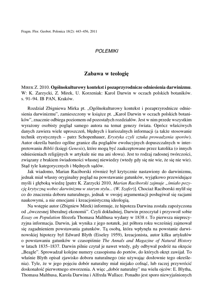Fragm. Flor. Geobot. Polonica 18(2): 443–456, 2011 POLEMIKI Zabawa w teologię MIREK Z. 2010. Ogólnokulturowy kontekst i pozaprzyrodnicze odniesienia darwinizmu. W: K. Zarzycki, Z. Mirek, U. Korzeniak: Karol Darwin w oczach polskich botaników. s. 91–94. IB PAN, Kraków. Rozdział Zbigniewa Mirka pt. „Ogólnokulturowy kontekst i pozaprzyrodnicze odniesienia darwinizmu”, zamieszczony w książce pt. „Karol Darwin w oczach polskich botaników”, znacznie odbiega poziomem od pozostałych rozdziałów. Jest w nim przede wszystkim wyrażony osobisty pogląd samego autora na temat genezy świata. Oprócz właściwych danych zawiera wiele uproszczeń, błędnych i kuriozalnych informacji (a także stosowanie technik erystycznych – patrz Schopenhauer, Erystyka czyli sztuka prowadzenia sporów). Autor określa bardzo ogólne granice dla poglądów ewolucyjnych dopuszczalnych w interpretowaniu Biblii (księgi Genesis), które mogą być zaakceptowane przez katolika (o innych odniesieniach religijnych w artykule nie ma ani słowa). Jest to rodzaj radosnej twórczości, związany z brakiem świadomości własnej niewiedzy (wtedy gdy się nie wie, że się nie wie). Stąd tyle kategorycznych i błędnych sądów. Jak wiadomo, Marian Raciborski również był krytycznie nastawiony do darwinizmu, jednak miał własny oryginalny pogląd na powstawanie gatunków, wyjątkowo przewidujące myśli i głęboką wiedzę [patrz K. Zarzycki 2010, Marian Raciborski zajmuje „śmiało pozycję krytyczną wobec darwinizmu w starym stylu... (W. Szafer)]. Chociaż Raciborski mylił się co do znaczenia doboru naturalnego, jednak w swojej argumentacji posługiwał się racjami naukowymi, a nie emocjami i kreacjonistyczną ideologią. Na wstępie autor (Zbigniew Mirek) informuje, że hipoteza Darwina została zapożyczona od „ówczesnej liberalnej ekonomii”. Czyli dokładniej, Darwin przeczytał i przyswoił sobie Essay on Population filozofa Thomasa Malthusa wydany w 1838 r. To pierwsza nieprecyzyjna informacja. Darwin, jak wynika z jego notatek, już półtora roku wcześniej zajmował się zagadnieniem powstawania gatunków. Tą osobą, która wpłynęła na powstanie darwinowskiej hipotezy był Edward Blyth (Eiseley 1959), kreacjonista, autor kilku artykułów o powstawaniu gatunków w czasopiśmie The Annals and Magazine of Natural History w latach 1835–1837. Darwin pilnie czytał je nawet wtedy, gdy odbywał podróż na okręcie „Beagle”. Sprowadzał kolejne numery czasopisma do portów, do których okręt zawijał. To właśnie Blyth opisał zjawisko doboru naturalnego (nie używając dosłownie tego określenia). Tyle, że w jego pojęciu dobór naturalny miał niejako cofnąć, lub raczej przywrócić doskonałość pierwotnego stworzenia. A więc „dobór naturalny” ma wielu ojców: E. Blytha, Thomasa Malthusa, Karola Darwina i Alfreda Wallace. Ponadto jest sporo niewyjaśnionych 444 Fragm. Flor. Geobot. Polonica 18(2), 2011 okoliczności powstania pojęcia doboru naturalnego, gdzie Darwin bynajmniej nie jawi nam się jako kryształowa postać (patrz. Jodkowski 2010, Spisek Darwina. w: D. Leszczyński, Ewolucja, filozofia, religia. Lectiones & Acroases Philosophicae 3: 265–277.). Autor artykułu twierdzi dalej, że koncepcja Darwina „nie dawała się obronić wobec postępu wiedzy”, a ponadto współczesna wiedza na temat „drzewa życia” jakoby zasadniczo odbiega od ujęć Darwina. Czy to prawda? Raczej należy sądzić, że autor nie zapoznał się wnikliwie ani z samą teorią Darwina, ani też z współczesnym poglądami na temat teorii ewolucji. Zapraszam zatem autora do przeczytania książki Ewolucja napisanej przez D.J. Futuymę. Teoria Darwina została połączona z osiągnięciami genetyki (należy przywołać tu nazwiska takich biologów, jak R.A. Fisher, J.B.S Haldane, E. Mayr, S Wrigth, T. Dobzhansky). Wczesne antydarwinowskie koncepcje ewolucji, jak np. neolamarkizm, teoria cyklicznego życia Hyatta, organogenezy czy też teorie mutacjonistyczne (H. De Vriesa i T. Morgana) zostały zarzucone. Warto tu przypomnieć wspaniałą książkę „Niewczesny pogrzeb Darwina” S.J. Goulda, który również krytycznie odnosi się do wielu niezbyt udanych określeń i metafor dotyczących ewolucji. Znaczenie doboru naturalnego w ewolucji sekwencji DNA zanegował Motoo Kimura. Jego zdaniem ewolucja na poziomie DNA zachodzi pod wpływem dryfu genetycznego. Jednak, jak się okazuje, działanie dryfu genetycznego nie wyklucza doboru naturalnego. Wpływ obu tych procesów zależy od wielkości populacji. Im mniejsza populacja tym znaczenie dryfu genetycznego będzie większe, niemniej oba te zjawiska współdziałają razem. Podobnie C.H. Waddington i H.J. Muller byli negatywnie nastawieni do syntetycznej teorii ewolucji. O tych interesujących zawiłościach teorii ewolucji autor nas nie informuje. Warto zwrócić uwagę na znane powiedzenie Theodosiusa Dobzhansky’ego: „Nic w biologii nie ma sensu, jeśli nie rozpatruje się tego z perspektywy ewolucji”. Genomika ewolucyjna jest dziedziną szybko się rozwijającą. Jej rozwój możemy śledzić niemal każdego dnia. Ale dzisiejszy ewolucjonista wie ile teoria ewolucji zawdzięcza Darwinowi. Ta potencjalnie najciekawsza część artykułu została bardzo skrótowo potraktowana przez autora. Zwróćmy uwagę na zdania o pejoratywnym znaczeniu że „mechanizm ewolucji został zapożyczony od ówczesnej liberalnej ekonomi” oraz że idea ta „nie dawała się obronić wobec postępu wiedzy”. Popatrzmy wobec tego na dokonania naszego Mikołaja Kopernika. W końcu nie zrobił wielkiego odkrycia popierając system heliocentryczny proponowany wcześniej przez Arystarcha z Samos, mało tego, orbity po których poruszały się planety były u niego kołami, co zmusiło Kopernika do użycia wielu epicykli. To dopiero Kepler udowodnił, że planety poruszają się po elipsach. Nikomu jednak dzisiaj nie przychodzi do głow