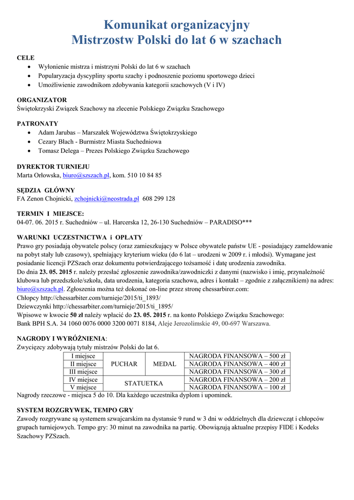 Komunikat organizacyjny Mistrzostw Polski do lat 6 w szachach CELE Wyłonienie mistrza i mistrzyni Polski do lat 6 w szachach Popularyzacja dyscypliny sportu szachy i podnoszenie poziomu sportowego dzieci Umożliwienie zawodnikom zdobywania kategorii szachowych (V i IV) ORGANIZATOR Świętokrzyski Związek Szachowy na zlecenie Polskiego Związku Szachowego PATRONATY Adam Jarubas – Marszałek Województwa Świętokrzyskiego Cezary Błach - Burmistrz Miasta Suchedniowa Tomasz Delega – Prezes Polskiego Związku Szachowego DYREKTOR TURNIEJU Marta Orłowska, [email protected], kom. 510 10 84 85 SĘDZIA GŁÓWNY FA Zenon Chojnicki, [email protected] 608 299 128 TERMIN I MIEJSCE: 04-07. 06. 2015 r. Suchedniów – ul. Harcerska 12, 26-130 Suchedniów – PARADISO*** WARUNKI UCZESTNICTWA i OPŁATY Prawo gry posiadają obywatele polscy (oraz zamieszkujący w Polsce obywatele państw UE - posiadający zameldowanie na pobyt stały lub czasowy), spełniający kryterium wieku (do 6 lat – urodzeni w 2009 r. i młodsi). Wymagane jest posiadanie licencji PZSzach oraz dokumentu potwierdzającego tożsamość i datę urodzenia zawodnika. Do dnia 23. 05. 2015 r. należy przesłać zgłoszenie zawodnika/zawodniczki z danymi (nazwisko i imię, przynależność klubowa lub przedszkole/szkoła, data urodzenia, kategoria szachowa, adres i kontakt – zgodnie z załącznikiem) na adres: [email protected]. Zgłoszenia można też dokonać on-line przez stronę chessarbirer.com: Chłopcy http://chessarbiter.com/turnieje/2015/ti_1893/ Dziewczynki http://chessarbiter.com/turnieje/2015/ti_1895/ Wpisowe w kwocie 50 zł należy wpłacić do 23. 05. 2015 r. na konto Polskiego Związku Szachowego: Bank BPH S.A. 34 1060 0076 0000 3200 0071 8184, Aleje Jerozolimskie 49, 00-697 Warszawa. NAGRODY I WYRÓŻNIENIA: Zwycięzcy zdobywają tytuły mistrzów Polski do lat 6. I miejsce NAGRODA FINANSOWA – 500 zł II miejsce PUCHAR MEDAL NAGRODA FINANSOWA – 400 zł III miejsce NAGRODA FINANSOWA – 300 zł IV miejsce NAGRODA FINANSOWA – 200 zł STATUETKA V miejsce NAGRODA FINANSOWA – 100 zł Nagrody rzeczowe - miejsca 5 do 10. Dla każdego uczestnika dyplom i upominek. SYSTEM ROZGRYWEK, TEMPO GRY Zawody rozgrywane są systemem szwajcarskim na dystansie 9 rund w 3 dni w oddzielnych dla dziewcząt i chłopców grupach turniejowych. Tempo gry: 30 minut na zawodnika na partię. Obowiązują aktualne przepisy FIDE i Kodeks Szachowy PZSzach. Program Mistrzostw Polski do 6 lat 04.06.2015 (czwartek) 1400- 1700 AKREDYTACJA UCZESTNIKÓW 1730- 1830 kolacja 00 00 19 - 20 ODPRAWA TECHNICZNA 05. 06. 2015 (piątek) 800 - 900 śniadanie 00 00 10 - 11 runda I 1140-1240 runda II 1300 -1400 obiad 30 30 14 - 15 runda III 06. 06. 2015 (sobota) 800 - 900 śniadanie 00 00 10 - 11 runda V 1140-1240 runda VI 1300 -1400 obiad 30 30 14 - 15 runda VII 1600- 1700 runda IV 1530- 1800 1800- 1900 1900- 2000 kolacja/grill Imprezy towarzyszące 1800- 1900 1900- 2000 07. 06. 2015 (niedziela) 800 - 900 śniadanie 00 00 10 - 11 runda VIII 1140-1240 runda IX 1300 -1400 obiad 30 UROCZYSTE ok. 14 ZAKOŃCZENIE Imprezy towarzyszące kolacja Imprezy towarzyszące ZAKWATEROWANIE I WYŻYWIENIE Opłata za pobyt (zakwaterowanie w pokojach 2 i 3 osobowych i wyżywienie) wynosi 95 złotych brutto osobodzień – osoba dorosła (łącznie 285 zł), 90 złotych brutto dzieci (270 zł). Pokój 1-osobowy – 120 zł/osobodzień. Zgłoszenia dotyczące zakwaterowania i wyżywienia należy kierować na adres mailowy: [email protected] do 23. 05. 2015 r. Płatne na konto Świętokrzyskiego Związku Szachowego, Aleja Legionów 3/3, 25-035 Kielce Bank ING Oddział/Kielce: 35 1050 1416 1000 0022 4221 7517 DODATKOWE INFORMACJE Hotel PARADISO – luksusowy kompleks hotelowy – http://hotelparadiso.pl/ Do Państwa dyspozycji Hotel pozostawia restaurację serwującą dania kuchni polskiej i europejskiej, Grill House (wiejska chata grillowa) z kuchnią regionalną, parking (60 miejsc parkingowych) oraz przepiękny ogród z oczkiem wodnym i kaskadami o powierzchni 1,5 ha, jak również plac zabaw, tenis stołowy. Hotel zapewnia nieodpłatny dostęp do Internetu w całym ośrodku. W trakcie turnieju zorganizowane zostaną: gry i zabawy sportowe, grill z dyskoteką konkurs plastyczny połączony z wystawą szachową turniej szachowy dla rodziców i opiekunów i inne imprezy towarzyszące. Dla opiekunów i trenerów przez cały okres turnieju zostanie udostępniony bufet kawowy. W czasie rund zapewniamy zawodnikom ciastka i napoje. Zorganizowany zostanie także „turniejowy sklepik” z podstawowymi produktami (napoje, słodycze, owoce) dla dzieci. POSTANOWIENIA KOŃCOWE Koszty uczestnictwa ponoszą delegujące zawodników - kluby, szkoły, przedszkola lub rodzice. Opiekę nad uczestnikami sprawują pełnoletni opiekunowie. Za ubezpieczenie i stan zdrowia zawodników odpowiedzialne są jednostki delegujące. Organizator zastrzega sobie prawo do ostatecznej interpretacji niniejszego komunikatu. Wszelkich dodatkowych informacji udziela Dyrektor Turnieju – Marta Orłowska – e-mailowo: [email protected] oraz telefonicznie: 510 10 84 85. Prezes ŚZSzach /Tomasz Stefaniak/ Dyrektor Turnieju /Marta Orłowska/ Załącznik do komunikatu organizacyjnego Mistrzostw Polski do lat 6 w szachach ZGŁOSZENIE DO TURNIEJU Nazwisko i imię Przynależność klubowa lub przedszkole/szkoła Data urodzenia Kategoria szachowa Nr licencji Kontakt