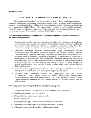 mgr Iwona Bereś NAUCZANIE ORTOGRAFII W KLASACH POCZĄTKOWYCH. Wielu nauczycieli-praktyków zauważa, że, mimo, iż uczymy dzieci zasad ortograficznych, utrwalamy wiadomości, sprawdzamy, poprawiamy, uatrakcyjniamy uczniowie nadal mają kłopoty z pisownią – przepisują z błędami z tablicy (brak czujności ortograficznej), robią poprawę dyktanda i nawet wtedy zdarza się błąd. Musimy więc ciągle się uczyć – szukać nowych sposobów nauczania ortografii, opracowywać atrakcyjne pomoce dydaktyczne, które zainteresują dziecko i rozbudzą pozytywną motywację do uczenia się trudnej sztuki bezbłędnego pisania. Praca nad kształtowaniem umiejętności poprawnego pisania powinna przebiegać wg następującego planu: 1. Zaznajomienie uczniów z nowym materiałem ortograficznym – ćwiczenia wprowadzające pod kierunkiem nauczyciela. Eksponuję się tylko jedną trudność, która jest przedmiotem obserwacji i analizy. Następnie dokonuje się uogólnień i formułuje zasadę. Nie należy od uczniów wymagać zapamiętywania, lecz rozumieniai praktycznego stosowania. 2. Utrwalanie poznanego materiału ortograficznego drogą różnorodnych ćwiczeń utrwalających, przy największej aktywności uczniów, np.: pisanie z pamięci, dyktando z komentowaniem, dyktando utrwalające (nie ocenia się poprawności ortograficznej, lecz staranność pisma i dokładność dokonanych poprawek), dyktando twórcze. Ćwiczenia te organizowane są systematycznie lub okazjonalnie. Utrwalanie okazjonalne nie oznacza przypadkowości. Jest to nauka poprawnej pisowni w związku z wykonywaniem innych ćwiczeń językowych. Na etapie ćwiczeń utrwalających musimy wyraźnie zróżnicować stopień samodzielności pracy uczniów i nauka powinna mieć coraz częściej charakter zindywidualizowany. 3. Sprawdzanie stopnia opanowanego materiału, – ale nie tylko przez dyktanda sprawdzające, (czyli pisanie ze słuchu), lecz np. z wykorzystaniem gier dydaktycznych. 4. Pożądane efekty wdrożenia uczniów do samokontroli daje tzw. zabawa w nauczyciela. Dzieci sięgają wtedy do swoich słowniczków ortograficznych lub profesjonalnych słowników ortograficznych. Taka praca wyrabia u uczniów czujność i spostrzegawczość ortograficzną oraz zdrową ambicję, a bezbłędne pisanie staje się źródłem radości. Przykłady pomocy dydaktycznych do nauczania ortografii: 1. „Lizaki ortograficzne” – wykorzystuję je m.in. do turnieju Mistrz ortografii. 2. Suwaki ortograficzne z „rz”, „ó”, „h” itd. 3. Składanki do tworzenia wyrazów pokrewnych. 4. Domina ortograficzne. 5. Gry ortograficzne typu: Ósmelka, Rzecik, Jarzębinka, Wiewiórka. 6. Słowniczki ortograficzne samodzielnie ilustrowane przez uczniów. 7. „Kieszenie” opracowanych wyrazów i tablice ortograficzne. 8. Innym interesującym sposobem pracy nad poprawnością ortograficzną jest metoda inscenizacji. Polega ona na zorganizowaniu mini przedstawienia. Występują w nim rośliny, przedmioty, zwierzęta, w nazwach których jest określona trudność ortograficzna. Scenariusz i dialogi do inscenizacji układają sami uczniowie. Po wystawieniu „sztuki” z zawartych w przedstawieniu wyrazów układają i zapisują zdania. 9. Dodatkowe zeszyty ćwiczeń, np. Ortografia na wesoło. 10. Kaszta, czyli skrzynia z literami. Jest to rozsypanka literowa – uczniowie składają wyraz, który odpowiada podanemu przez nauczyciela znaczeniu, np. a, k, ł, y, ż – jesz nią zupę. 11. Sylabówki – np. ba ża /żaba/. 12. Praca ze słownikiem ortograficznym – kształci pamięć wzrokową i spostrzegawczość. 13. 5–minutówki ortograficzne – stanowią systematyczny kurs nauki ortografii. 14. Zeszyty do prac klasowych i dyktand. 15. Samodzielne konstruowanie zagadek przez uczniów. W takich sytuacjach manipulowanie materiałem ortograficznym jest jeszcze bardziej świadome, aniżeli przy rozwiązywaniu gotowych krzyżówek. U dzieci rośnie poziom czujności ortograficznej, bowiem pisownia każdego wyrazu pomocniczego włączonego do łamigłówki musi być sprawdzona. Czynności te skutecznie wdrażają uczniów do samokontroli i samooceny. Współcześni dydaktycy apelują, by często stosować metodę gier i zabaw dydaktycznych, które angażują emocjonalnie uczniów, pobudzają ich aktywność intelektualną. Są to: rebusy, loteryjki, quizy, szarady, anagramy, domina itp. Jak sprawdzać i poprawiać prace pisemne uczniów? ● Prace klasowe należy poprawiać w jak najkrótszym czasie po ich napisaniu. Uczniowie jeszcze przeżywają ćwiczenie i trzeba ten czynnik emocjonalny wykorzystać. Szybko poprawiona praca zapobiega procesowi utrwalania się błędów. ● Bardzo dobre wyniki daje poprawianie pracy w obecności ucznia – wspólne korygowanie i wyjaśnianie błędów. Wygląda to tak: Nauczyciel sygnalizuje istnienie błędu, uczeń szuka go i poprawia sam lub odwołuje się do pomocy nauczyciela, bądź korzysta ze słowniczka ortograficznego. Wyraz źle napisany zamazuje (zakleja) i pisze poprawną formę. Dla utrwalenia poprawności zapisu należy go jeszcze raz napisać pod pracą. ● Nie wolno sygnalizować błędu przez kilkakrotne podkreślenie go czerwonym długopisem. Wyraz podkreślony zostaje wyróżniony wśród innych. Uczniowie z dobrą pamięcią wzrokową utrwalają sobie błędnie napisany wyraz. ● W ćwiczeniach ortograficznych wdrażających i utrwalających błędy ucznia można poprawiać kolorem pisma ucznia, a następnie podkreślać ołówkiem poprawione wyrazy /w kl. I i II/. W ten sposób zwracamy uwagę na bezbłędny zapis wyrazów i stwarzamy możliwość przećwiczenia ich pisowni indywidualnie lub pod kierunkiem nauczyciela. ● Błędy można usuwać korektorem – powstanie luka, którą uczeń sam uzupełnia po wcześniejszym ustaleniu poprawnej formy zapisu. ● W klasie III obok wymienionych sposobów warto umownie sygnalizować błędne zapisy np. kółkiem lub kreską napi