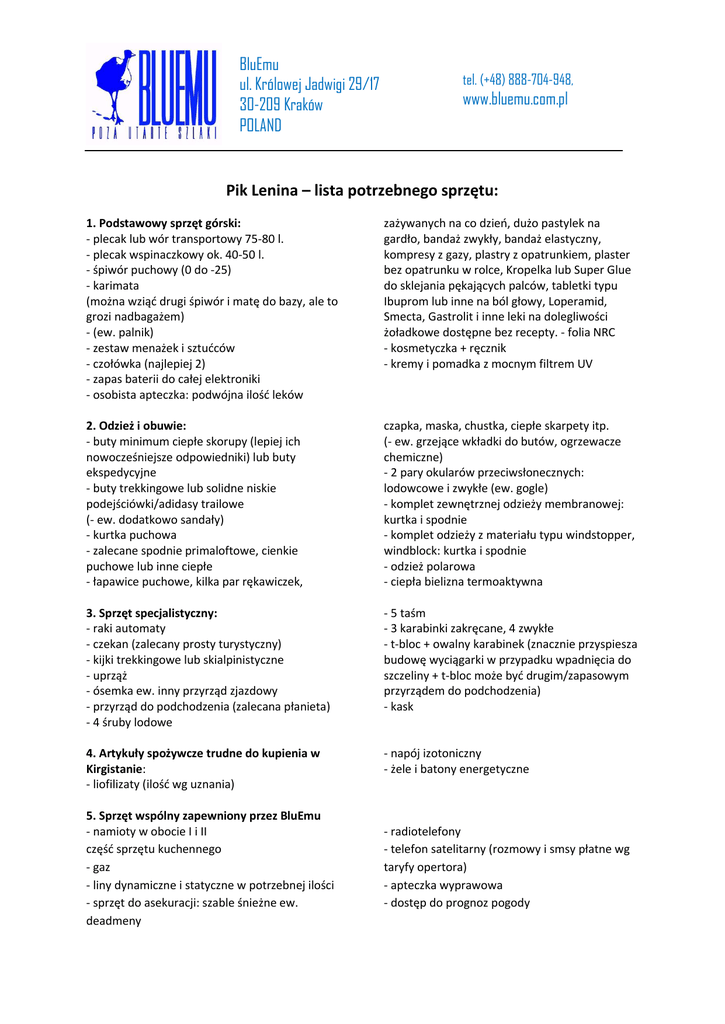 BluEmu ul. Królowej Jadwigi 29/17 30-209 Kraków POLAND tel. (+48) 888-704-948, www.bluemu.com.pl Pik Lenina – lista potrzebnego sprzętu: 1. Podstawowy sprzęt górski: - plecak lub wór transportowy 75-80 l. - plecak wspinaczkowy ok. 40-50 l. - śpiwór puchowy (0 do -25) - karimata (można wziąć drugi śpiwór i matę do bazy, ale to grozi nadbagażem) - (ew. palnik) - zestaw menażek i sztućców - czołówka (najlepiej 2) - zapas baterii do całej elektroniki - osobista apteczka: podwójna ilość leków zażywanych na co dzień, dużo pastylek na gardło, bandaż zwykły, bandaż elastyczny, kompresy z gazy, plastry z opatrunkiem, plaster bez opatrunku w rolce, Kropelka lub Super Glue do sklejania pękających palców, tabletki typu Ibuprom lub inne na ból głowy, Loperamid, Smecta, Gastrolit i inne leki na dolegliwości żoładkowe dostępne bez recepty. - folia NRC - kosmetyczka + ręcznik - kremy i pomadka z mocnym filtrem UV 2. Odzież i obuwie: - buty minimum ciepłe skorupy (lepiej ich nowocześniejsze odpowiedniki) lub buty ekspedycyjne - buty trekkingowe lub solidne niskie podejściówki/adidasy trailowe (- ew. dodatkowo sandały) - kurtka puchowa - zalecane spodnie primaloftowe, cienkie puchowe lub inne ciepłe - łapawice puchowe, kilka par rękawiczek, czapka, maska, chustka, ciepłe skarpety itp. (- ew. grzejące wkładki do butów, ogrzewacze chemiczne) - 2 pary okularów przeciwsłonecznych: lodowcowe i zwykłe (ew. gogle) - komplet zewnętrznej odzieży membranowej: kurtka i spodnie - komplet odzieży z materiału typu windstopper, windblock: kurtka i spodnie - odzież polarowa - ciepła bielizna termoaktywna 3. Sprzęt specjalistyczny: - raki automaty - czekan (zalecany prosty turystyczny) - kijki trekkingowe lub skialpinistyczne - uprząż - ósemka ew. inny przyrząd zjazdowy - przyrząd do podchodzenia (zalecana płanieta) - 4 śruby lodowe - 5 taśm - 3 karabinki zakręcane, 4 zwykłe - t-bloc + owalny karabinek (znacznie przyspiesza budowę wyciągarki w przypadku wpadnięcia do szczeliny + t-bloc może być drugim/zapasowym przyrządem do podchodzenia) - kask 4. Artykuły spożywcze trudne do kupienia w Kirgistanie: - liofilizaty (ilość wg uznania) - napój izotoniczny - żele i batony energetyczne 5. Sprzęt wspólny zapewniony przez BluEmu - namioty w obocie I i II część sprzętu kuchennego - gaz - liny dynamiczne i statyczne w potrzebnej ilości - sprzęt do asekuracji: szable śnieżne ew. deadmeny - radiotelefony - telefon satelitarny (rozmowy i smsy płatne wg taryfy opertora) - apteczka wyprawowa - dostęp do prognoz pogody
