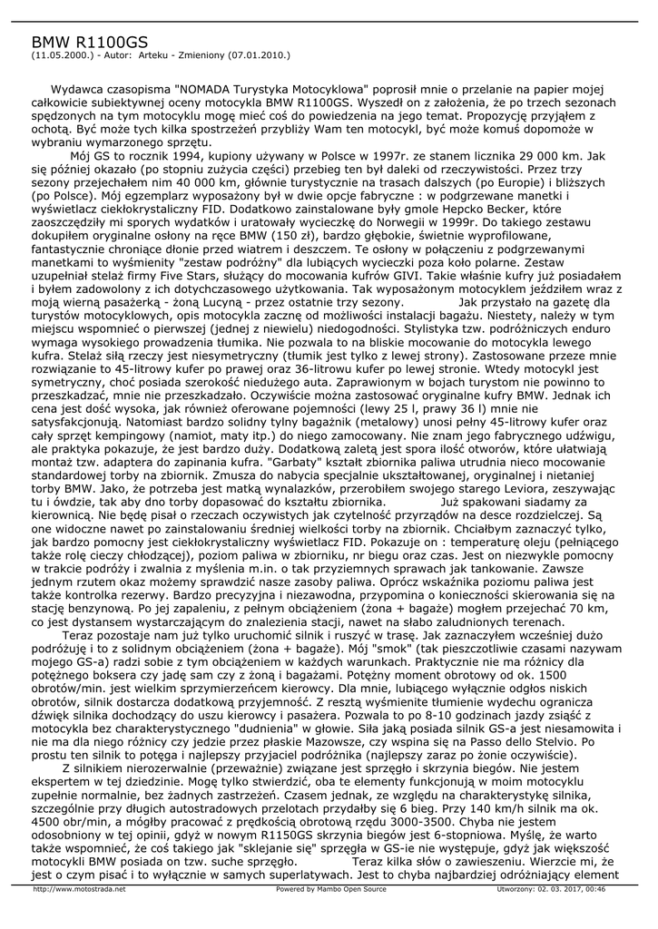 BMW R1100GS (11.05.2000.) - Autor: Arteku - Zmieniony (07.01.2010.) Wydawca czasopisma "NOMADA Turystyka Motocyklowa" poprosił mnie o przelanie na papier mojej całkowicie subiektywnej oceny motocykla BMW R1100GS. Wyszedł on z założenia, że po trzech sezonach spędzonych na tym motocyklu mogę mieć coś do powiedzenia na jego temat. Propozycję przyjąłem z ochotą. Być może tych kilka spostrzeżeń przybliży Wam ten motocykl, być może komuś dopomoże w wybraniu wymarzonego sprzętu. Mój GS to rocznik 1994, kupiony używany w Polsce w 1997r. ze stanem licznika 29 000 km. Jak się później okazało (po stopniu zużycia części) przebieg ten był daleki od rzeczywistości. Przez trzy sezony przejechałem nim 40 000 km, głównie turystycznie na trasach dalszych (po Europie) i bliższych (po Polsce). Mój egzemplarz wyposażony był w dwie opcje fabryczne : w podgrzewane manetki i wyświetlacz ciekłokrystaliczny FID. Dodatkowo zainstalowane były gmole Hepcko Becker, które zaoszczędziły mi sporych wydatków i uratowały wycieczkę do Norwegii w 1999r. Do takiego zestawu dokupiłem oryginalne osłony na ręce BMW (150 zł), bardzo głębokie, świetnie wyprofilowane, fantastycznie chroniące dłonie przed wiatrem i deszczem. Te osłony w połączeniu z podgrzewanymi manetkami to wyśmienity "zestaw podróżny" dla lubiących wycieczki poza koło polarne. Zestaw uzupełniał stelaż firmy Five Stars, służący do mocowania kufrów GIVI. Takie właśnie kufry już posiadałem i byłem zadowolony z ich dotychczasowego użytkowania. Tak wyposażonym motocyklem jeździłem wraz z moją wierną pasażerką - żoną Lucyną - przez ostatnie trzy sezony. Jak przystało na gazetę dla turystów motocyklowych, opis motocykla zacznę od możliwości instalacji bagażu. Niestety, należy w tym miejscu wspomnieć o pierwszej (jednej z niewielu) niedogodności. Stylistyka tzw. podróżniczych enduro wymaga wysokiego prowadzenia tłumika. Nie pozwala to na bliskie mocowanie do motocykla lewego kufra. Stelaż siłą rzeczy jest niesymetryczny (tłumik jest tylko z lewej strony). Zastosowane przeze mnie rozwiązanie to 45-litrowy kufer po prawej oraz 36-litrowu kufer po lewej stronie. Wtedy motocykl jest symetryczny, choć posiada szerokość niedużego auta. Zaprawionym w bojach turystom nie powinno to przeszkadzać, mnie nie przeszkadzało. Oczywiście można zastosować oryginalne kufry BMW. Jednak ich cena jest dość wysoka, jak również oferowane pojemności (lewy 25 l, prawy 36 l) mnie nie satysfakcjonują. Natomiast bardzo solidny tylny bagażnik (metalowy) unosi pełny 45-litrowy kufer oraz cały sprzęt kempingowy (namiot, maty itp.) do niego zamocowany. Nie znam jego fabrycznego udźwigu, ale praktyka pokazuje, że jest bardzo duży. Dodatkową zaletą jest spora ilość otworów, które ułatwiają montaż tzw. adaptera do zapinania kufra. "Garbaty" kształt zbiornika paliwa utrudnia nieco mocowanie standardowej torby na zbiornik. Zmusza do nabycia specjalnie ukształtowanej, oryginalnej i nietaniej torby BMW. Jako, że potrzeba jest matką wynalazków, przerobiłem swojego starego Leviora, zeszywając tu i ówdzie, tak aby dno torby dopasować do kształtu zbiornika. Już spakowani siadamy za kierownicą. Nie będę pisał o rzeczach oczywistych jak czytelność przyrządów na desce rozdzielczej. Są one widoczne nawet po zainstalowaniu średniej wielkości torby na zbiornik. Chciałbym zaznaczyć tylko, jak bardzo pomocny jest ciekłokrystaliczny wyświetlacz FID. Pokazuje on : temperaturę oleju (pełniącego także rolę cieczy chłodzącej), poziom paliwa w zbiorniku, nr biegu oraz czas. Jest on niezwykle pomocny w trakcie podróży i zwalnia z myślenia m.in. o tak przyziemnych sprawach jak tankowanie. Zawsze jednym rzutem okaz możemy sprawdzić nasze zasoby paliwa. Oprócz wskaźnika poziomu paliwa jest także kontrolka rezerwy. Bardzo precyzyjna i niezawodna, przypomina o konieczności skierowania się na stację benzynową. Po jej zapaleniu, z pełnym obciążeniem (żona + bagaże) mogłem przejechać 70 km, co jest dystansem wystarczającym do znalezienia stacji, nawet na słabo zaludnionych terenach. Teraz pozostaje nam już tylko uruchomić silnik i ruszyć w trasę. Jak zaznaczyłem wcześniej dużo podróżuję i to z solidnym obciążeniem (żona + bagaże). Mój "smok" (tak pieszczotliwie czasami nazywam mojego GS-a) radzi sobie z tym obciążeniem w każdych warunkach. Praktycznie nie ma różnicy dla potężnego boksera czy jadę sam czy z żoną i bagażami. Potężny moment obrotowy od ok. 1500 obrotów/min. jest wielkim sprzymierzeńcem kierowcy. Dla mnie, lubiącego wyłącznie odgłos niskich obrotów, silnik dostarcza dodatkową przyjemność. Z resztą wyśmienite tłumienie wydechu ogranicza dźwięk silnika dochodzący do uszu kierowcy i pasażera. Pozwala to po 8-10 godzinach jazdy zsiąść z motocykla bez charakterystycznego "dudnienia" w głowie. Siła jaką posiada silnik GS-a jest niesamowita i nie ma dla niego różnicy czy jedzie przez płaskie Mazowsze, czy wspina się na Passo dello Stelvio. Po prostu ten silnik to potęga i najlepszy przyjaciel podróżnika (najlepszy zaraz po żonie oczywiście). Z silnikiem nierozerwalnie (przeważnie) związane jest sprzęgło i skrzynia biegów. Nie jestem ekspertem w tej dziedzinie. Mogę tylko stwierdzić, oba te elementy funkcjonują w moim motocyklu zupełnie normalnie, bez żadnych zastrzeżeń. Czasem jednak, ze względu na charakterystykę silnika, szczególnie przy długich autostradowych przelotach przydałby się 6 bieg. Przy 140 km/h silnik ma ok. 4500 obr/min, a mógłby pracować z prędkością obrotową rzędu 3000-3500. Chyba nie jestem odosobniony w tej opinii, gdyż w nowym R1150GS skrzynia biegów jest 6-stopniowa. Myślę, że warto także wspomnieć, że coś takiego jak "sklejanie się" sprzęgła w GS-ie nie występuje, gdyż jak większość motocykli BMW posiada on tzw. su