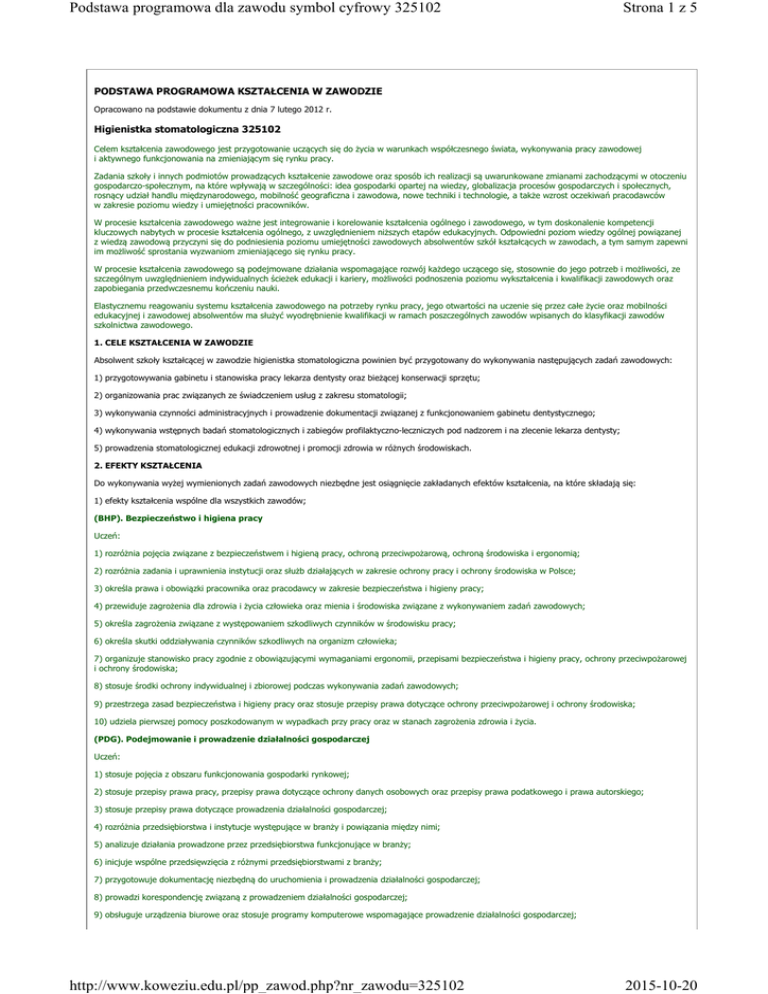 Podstawa programowa dla zawodu symbol cyfrowy 325102 Strona 1 z 5 PODSTAWA PROGRAMOWA KSZTAŁCENIA W ZAWODZIE Opracowano na podstawie dokumentu z dnia 7 lutego 2012 r. Higienistka stomatologiczna 325102 Celem kształcenia zawodowego jest przygotowanie uczących się do życia w warunkach współczesnego świata, wykonywania pracy zawodowej i aktywnego funkcjonowania na zmieniającym się rynku pracy. Zadania szkoły i innych podmiotów prowadzących kształcenie zawodowe oraz sposób ich realizacji są uwarunkowane zmianami zachodzącymi w otoczeniu gospodarczo-społecznym, na które wpływają w szczególności: idea gospodarki opartej na wiedzy, globalizacja procesów gospodarczych i społecznych, rosnący udział handlu międzynarodowego, mobilność geograficzna i zawodowa, nowe techniki i technologie, a także wzrost oczekiwań pracodawców w zakresie poziomu wiedzy i umiejętności pracowników. W procesie kształcenia zawodowego ważne jest integrowanie i korelowanie kształcenia ogólnego i zawodowego, w tym doskonalenie kompetencji kluczowych nabytych w procesie kształcenia ogólnego, z uwzględnieniem niższych etapów edukacyjnych. Odpowiedni poziom wiedzy ogólnej powiązanej z wiedzą zawodową przyczyni się do podniesienia poziomu umiejętności zawodowych absolwentów szkół kształcących w zawodach, a tym samym zapewni im możliwość sprostania wyzwaniom zmieniającego się rynku pracy. W procesie kształcenia zawodowego są podejmowane działania wspomagające rozwój każdego uczącego się, stosownie do jego potrzeb i możliwości, ze szczególnym uwzględnieniem indywidualnych ścieżek edukacji i kariery, możliwości podnoszenia poziomu wykształcenia i kwalifikacji zawodowych oraz zapobiegania przedwczesnemu kończeniu nauki. Elastycznemu reagowaniu systemu kształcenia zawodowego na potrzeby rynku pracy, jego otwartości na uczenie się przez całe życie oraz mobilności edukacyjnej i zawodowej absolwentów ma służyć wyodrębnienie kwalifikacji w ramach poszczególnych zawodów wpisanych do klasyfikacji zawodów szkolnictwa zawodowego. 1. CELE KSZTAŁCENIA W ZAWODZIE Absolwent szkoły kształcącej w zawodzie higienistka stomatologiczna powinien być przygotowany do wykonywania następujących zadań zawodowych: 1) przygotowywania gabinetu i stanowiska pracy lekarza dentysty oraz bieżącej konserwacji sprzętu; 2) organizowania prac związanych ze świadczeniem usług z zakresu stomatologii; 3) wykonywania czynności administracyjnych i prowadzenie dokumentacji związanej z funkcjonowaniem gabinetu dentystycznego; 4) wykonywania wstępnych badań stomatologicznych i zabiegów profilaktyczno-leczniczych pod nadzorem i na zlecenie lekarza dentysty; 5) prowadzenia stomatologicznej edukacji zdrowotnej i promocji zdrowia w różnych środowiskach. 2. EFEKTY KSZTAŁCENIA Do wykonywania wyżej wymienionych zadań zawodowych niezbędne jest osiągnięcie zakładanych efektów kształcenia, na które składają się: 1) efekty kształcenia wspólne dla wszystkich zawodów; (BHP). Bezpieczeństwo i higiena pracy Uczeń: 1) rozróżnia pojęcia związane z bezpieczeństwem i higieną pracy, ochroną przeciwpożarową, ochroną środowiska i ergonomią; 2) rozróżnia zadania i uprawnienia instytucji oraz służb działających w zakresie ochrony pracy i ochrony środowiska w Polsce; 3) określa prawa i obowiązki pracownika oraz pracodawcy w zakresie bezpieczeństwa i higieny pracy; 4) przewiduje zagrożenia dla zdrowia i życia człowieka oraz mienia i środowiska związane z wykonywaniem zadań zawodowych; 5) określa zagrożenia związane z występowaniem szkodliwych czynników w środowisku pracy; 6) określa skutki oddziaływania czynników szkodliwych na organizm człowieka; 7) organizuje stanowisko pracy zgodnie z obowiązującymi wymaganiami ergonomii, przepisami bezpieczeństwa i higieny pracy, ochrony przeciwpożarowej i ochrony środowiska; 8) stosuje środki ochrony indywidualnej i zbiorowej podczas wykonywania zadań zawodowych; 9) przestrzega zasad bezpieczeństwa i higieny pracy oraz stosuje przepisy prawa dotyczące ochrony przeciwpożarowej i ochrony środowiska; 10) udziela pierwszej pomocy poszkodowanym w wypadkach przy pracy oraz w stanach zagrożenia zdrowia i życia. (PDG). Podejmowanie i prowadzenie działalności gospodarczej Uczeń: 1) stosuje pojęcia z obszaru funkcjonowania gospodarki rynkowej; 2) stosuje przepisy prawa pracy, przepisy prawa dotyczące ochrony danych osobowych oraz przepisy prawa podatkowego i prawa autorskiego; 3) stosuje przepisy prawa dotyczące prowadzenia działalności gospodarczej; 4) rozróżnia przedsiębiorstwa i instytucje występujące w branży i powiązania między nimi; 5) analizuje działania prowadzone przez przedsiębiorstwa funkcjonujące w branży; 6) inicjuje wspólne przedsięwzięcia z różnymi przedsiębiorstwami z branży; 7) przygotowuje dokumentację niezbędną do uruchomienia i prowadzenia działalności gospodarczej; 8) prowadzi korespondencję związaną z prowadzeniem działalności gospodarczej; 9) obsługuje urządzenia biurowe oraz stosuje programy komputerowe wspomagające prowadzenie działalności gospodarczej; http://www.koweziu.edu.pl/pp_zawod.php?nr_zawodu=325102 2015-10-20 Podstawa programowa dla zawodu symbol cyfrowy 325102 Strona 2 z 5 10) planuje i podejmuje działania marketingowe prowadzonej działalności gospodarczej; 11) optymalizuje koszty i przychody prowadzonej działalności gospodarczej. (JOZ). Język obcy ukierunkowany zawodowo Uczeń: 1) posługuje się zasobem środków językowych (leksykalnych, gramatycznych, ortograficznych oraz fonetycznych), umożliwiających realizację zadań zawodowych; 2) interpretuje wypowiedzi dotyczące wykonywania typowych czynności zawodowych artykułowane powoli i wyraźnie, w standardowej odmianie języka; 3) analizuje i interpretuje krótkie teksty pisemne dotyczące wykonywania typowych czynności zawodowych; 4) formułuje kró