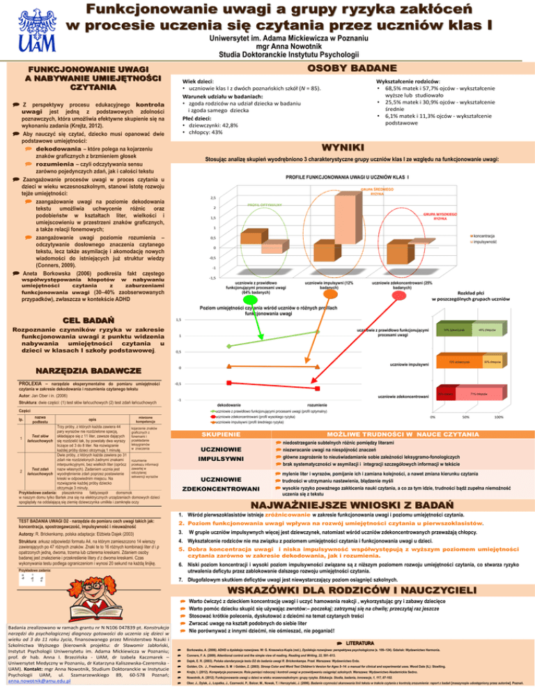Funkcjonowanie uwagi a grupy ryzyka zakłóceń w procesie uczenia się czytania przez uczniów klas I Uniwersytet im. Adama Mickiewicza w Poznaniu mgr Anna Nowotnik Studia Doktoranckie Instytutu Psychologii OSOBY BADANE FUNKCJONOWANIE UWAGI A NABYWANIE UMIEJĘTNOŚCI CZYTANIA Z perspektywy procesu edukacyjnego kontrola uwagi jest jedną z podstawowych zdolności poznawczych, która umożliwia efektywne skupienie się na wykonaniu zadania (Krejtz, 2012). Aby nauczyć się czytać, dziecko musi opanować dwie podstawowe umiejętności: dekodowania – które polega na kojarzeniu znaków graficznych z brzmieniem głosek rozumienia – czyli odczytywania sensu zarówno pojedynczych zdań, jak i całości tekstu Zaangażowanie procesów uwagi w proces czytania u dzieci w wieku wczesnoszkolnym, stanowi istotę rozwoju tejże umiejętności: zaangażowanie uwagi na poziomie dekodowania tekstu umożliwia uchwycenie różnic oraz podobieństw w kształtach liter, wielkości i umiejscowieniu w przestrzeni znaków graficznych, a także relacji fonemowych; zaangażowanie uwagi poziomie rozumienia – odczytywanie dosłownego znaczenia czytanego tekstu, lecz także asymilację i akomodację nowych wiadomości do istniejących już struktur wiedzy (Conners, 2009). Aneta Borkowska (2006) podkreśla fakt częstego WYNIKI Stosując analizę skupień wyodrębniono 3 charakterystyczne grupy uczniów klas I ze względu na funkcjonowanie uwagi: PROFILE FUNKCJONOWANIA UWAGI U UCZNIÓW KLAS I GRUPA WYSOKIEGO RYZYKA 1,5 1 koncentracja impulsywność 0,5 0 -0,5 -1 -1,5 uczniowie z prawidłowo funkcjonującymi procesami uwagi (64% badanych) uczniowie impulsywni (12% badanych) uczniowie zdekoncentrowani (25% badanych) Rozkład płci w poszczególnych grupach uczniów Poziom umiejętności czytania wśród uczniów o różnych profilach funkcjonowania uwagi CEL BADAŃ 1,5 Rozpoznanie czynników ryzyka w zakresie funkcjonowania uwagi z punktu widzenia nabywania umiejętności czytania u dzieci w klasach I szkoły podstawowej. NARZĘDZIA BADAWCZE PROLEXIA – narzędzie eksperymentalne do pomiaru umiejętności czytania w zakresie dekodowania i rozumienia czytanego tekstu Autor: Jan Ober i in. (2006) Struktura: dwie części: (1) test słów łańcuchowych (2) test zdań łańcuchowych uczniowie z prawidłowo funkcjonującymi procesami uwagi 1 46% chłopców 70% dziewczynek uczniowie impulsywni 0 30% chłopców -0,5 -1 dekodowanie 71% chłopców rozumienie uczniowie z prawidłowo funkcjonującymi procesami uwagi (profil optymalny) uczniowie zdekoncentrowani (profil wysokiego ryzyka) uczniowie impulsywni (profil średniego ryzyka) Trzy próby, z których każda zawiera 44 kojarzenie znaków pary wyrazów nie rozdzielone spacją, graficznych z Test słów składające się z 11 liter, zawsze dających fonemami i 1 łańcuchowych się rozdzielić tak, by powstały dwa wyrazy przekładanie leksygramów liczące od 3 do 8 liter. Na rozwiązanie w znaczenia każdej próby dzieci otrzymują 1 minutę. Dwie próby, z których każda zawiera po 31 zdań nie rozdzielonych żadnymi znakami rozumienie interpunkcyjnymi, bez wielkich liter (oprócz przekazu informacji zawartej w Test zdań nazw własnych). Zadaniem ucznia jest 2 odczytanej łańcuchowych wyodrębnienie zdań poprzez postawienie sekwencji wyrazów kreski w odpowiednim miejscu. Na rozwiązanie każdej próby dziecko otrzymuje 3 minuty. Przykładowe zadania: ptaszekmina fałdyzespół domsmok w naszym domu tylko Bartek zna się na elektrycznych urządzeniach domowych dzieci spoglądały na oddalającą się ziemię dziewczynka umilkła i zamknęła oczy 29% dziewcz. uczniowie zdekoncentrowani mierzone kompetencje TEST BADANIA UWAGI D2 - narzędzie do pomiaru cech uwagi takich jak: koncentracja, spostrzegawczość, impulsywność i nieuważność 54% dziewczynek 0,5 Części opis PROFIL OPTYMALNY 2 przypadków), zwłaszcza w kontekście ADHD nazwa podtestu GRUPA ŚREDNIEGO RYZYKA 2,5 współwystępowania kłopotów w nabywaniu umiejętności czytania z zaburzeniami funkcjonowania uwagi (30–40% zaobserwowanych lp. Wykształcenie rodziców: • 68,5% matek i 57,7% ojców - wykształcenie wyższe lub studiowało • 25,5% matek i 30,9% ojców - wykształcenie średnie • 6,1% matek i 11,3% ojców - wykształcenie podstawowe Wiek dzieci: • uczniowie klas I z dwóch poznańskich szkół (N = 85). Warunek udziału w badaniach: • zgoda rodziców na udział dziecka w badaniu i zgoda samego dziecka Płeć dzieci: • dziewczynki: 42,8% • chłopcy: 43% SKUPIENIE 0% 50% 100% MOŻLIWE TRUDNOŚCI W NAUCE CZYTANIA niedostrzeganie subtelnych różnic pomiędzy literami niezwracanie uwagi na niespójność znaczeń główne zagrożenie to nieuświadamianie sobie zależności leksygramo-fonologiczych brak systematyczności w asymilacji i integracji szczegółowych informacji w tekście UCZNIOWIE IMPULSYWNI UCZNIOWIE ZDEKONCENTROWANI mylenie liter i wyrazów, pomijanie ich i zamiana kolejności, a nawet zmiana kierunku czytania trudności w utrzymaniu nastawienia, błądzenie myśli wysokie ryzyko poważnego zakłócenia nauki czytania, a co za tym idzie, trudności bądź zupełna niemożność uczenia się z tekstu NAJWAŻNIEJSZE WNIOSKI Z BADAŃ 1. Wśród pierwszoklasistów istnieje zróżnicowanie w zakresie funkcjonowania uwagi i poziomu umiejętności czytania. 2. Poziom funkcjonowania uwagi wpływa na rozwój umiejętności czytania u pierwszoklasistów. Autorzy: R. Brickenkamp, polska adaptacja: Elżbieta Dajek (2003) 3. Struktura: arkusz odpowiedzi formatu A4, na którym zamieszczono 14 wierszy zawierających po 47 różnych znaków. Znaki te to 16 różnych kombinacji liter d i p opatrzonych jedną, dwoma, trzema lub czterema kreskami. Zdaniem osoby badanej jest znalezienie i przekreślenie litery d z dwoma kreskami. Czas wykonywania testu podlega ograniczeniom i wynosi 20 sekund na każdą linijkę. 5. Dobra koncentracja uwagi i niska impulsywność współwystęp