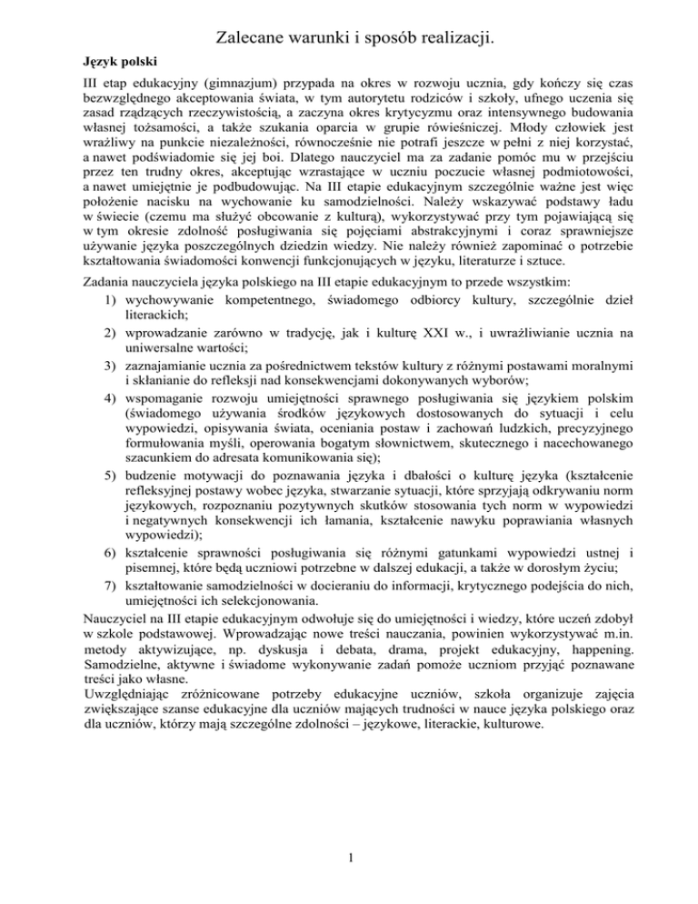 Zalecane warunki i sposób realizacji. Język polski III etap edukacyjny (gimnazjum) przypada na okres w rozwoju ucznia, gdy kończy się czas bezwzględnego akceptowania świata, w tym autorytetu rodziców i szkoły, ufnego uczenia się zasad rządzących rzeczywistością, a zaczyna okres krytycyzmu oraz intensywnego budowania własnej toŜsamości, a takŜe szukania oparcia w grupie rówieśniczej. Młody człowiek jest wraŜliwy na punkcie niezaleŜności, równocześnie nie potrafi jeszcze w pełni z niej korzystać, a nawet podświadomie się jej boi. Dlatego nauczyciel ma za zadanie pomóc mu w przejściu przez ten trudny okres, akceptując wzrastające w uczniu poczucie własnej podmiotowości, a nawet umiejętnie je podbudowując. Na III etapie edukacyjnym szczególnie waŜne jest więc połoŜenie nacisku na wychowanie ku samodzielności. NaleŜy wskazywać podstawy ładu w świecie (czemu ma słuŜyć obcowanie z kulturą), wykorzystywać przy tym pojawiającą się w tym okresie zdolność posługiwania się pojęciami abstrakcyjnymi i coraz sprawniejsze uŜywanie języka poszczególnych dziedzin wiedzy. Nie naleŜy równieŜ zapominać o potrzebie kształtowania świadomości konwencji funkcjonujących w języku, literaturze i sztuce. Zadania nauczyciela języka polskiego na III etapie edukacyjnym to przede wszystkim: 1) wychowywanie kompetentnego, świadomego odbiorcy kultury, szczególnie dzieł literackich; 2) wprowadzanie zarówno w tradycję, jak i kulturę XXI w., i uwraŜliwianie ucznia na uniwersalne wartości; 3) zaznajamianie ucznia za pośrednictwem tekstów kultury z róŜnymi postawami moralnymi i skłanianie do refleksji nad konsekwencjami dokonywanych wyborów; 4) wspomaganie rozwoju umiejętności sprawnego posługiwania się językiem polskim (świadomego uŜywania środków językowych dostosowanych do sytuacji i celu wypowiedzi, opisywania świata, oceniania postaw i zachowań ludzkich, precyzyjnego formułowania myśli, operowania bogatym słownictwem, skutecznego i nacechowanego szacunkiem do adresata komunikowania się); 5) budzenie motywacji do poznawania języka i dbałości o kulturę języka (kształcenie refleksyjnej postawy wobec języka, stwarzanie sytuacji, które sprzyjają odkrywaniu norm językowych, rozpoznaniu pozytywnych skutków stosowania tych norm w wypowiedzi i negatywnych konsekwencji ich łamania, kształcenie nawyku poprawiania własnych wypowiedzi); 6) kształcenie sprawności posługiwania się róŜnymi gatunkami wypowiedzi ustnej i pisemnej, które będą uczniowi potrzebne w dalszej edukacji, a takŜe w dorosłym Ŝyciu; 7) kształtowanie samodzielności w docieraniu do informacji, krytycznego podejścia do nich, umiejętności ich selekcjonowania. Nauczyciel na III etapie edukacyjnym odwołuje się do umiejętności i wiedzy, które uczeń zdobył w szkole podstawowej. Wprowadzając nowe treści nauczania, powinien wykorzystywać m.in. metody aktywizujące, np. dyskusja i debata, drama, projekt edukacyjny, happening. Samodzielne, aktywne i świadome wykonywanie zadań pomoŜe uczniom przyjąć poznawane treści jako własne. Uwzględniając zróŜnicowane potrzeby edukacyjne uczniów, szkoła organizuje zajęcia zwiększające szanse edukacyjne dla uczniów mających trudności w nauce języka polskiego oraz dla uczniów, którzy mają szczególne zdolności – językowe, literackie, kulturowe. 1 Języki obce nowoŜytne Znajomość języków obcych nowoŜytnych jest warunkiem pełnego, aktywnego uczestnictwa młodych Polaków w Ŝyciu społeczności europejskiej i globalnej. Promowanie róŜnorodności językowej jest jednym z priorytetów Unii Europejskiej. Za podstawowy cel kształcenia w nauczaniu języków obcych nowoŜytnych przyjęto skuteczne porozumiewanie się w języku obcym, w mowie i w piśmie. Priorytetem jest zatem umiejętność osiągania przez ucznia róŜnych celów komunikacyjnych, a poprawność językowa, choć odgrywa istotną rolę, nie jest nadrzędnym celem dydaktycznym. Oprócz umiejętności językowych szkoła, poprzez nauczanie języka obcego, kształtuje postawy ciekawości, tolerancji i otwartości wobec innych kultur. Warunkiem rozwijania umiejętności językowych na III etapie edukacyjnym jest zapewnienie uczniom kontynuacji nauki języka obcego nowoŜytnego nauczanego w szkole podstawowej. Nauczyciele powinni właściwie określić i wykorzystać zdobyte przez uczniów w szkole podstawowej umiejętności językowe. W tym celu konieczne jest przeprowadzenie testów, które pozwolą na zakwalifikowanie uczniów do odpowiednich grup zaawansowania. Na III etapie edukacyjnym określono dwa poziomy nauczania języków obcych nowoŜytnych: poziom III.0 – dla początkujących i poziom III.1 – dla kontynuujących naukę, który ma wymagania zbliŜone do poziomu A2, w sześciostopniowej skali poziomów biegłości w zakresie poszczególnych umiejętności językowych (A1, A2 – poziom podstawowy; B1, B2 – poziom samodzielności; C1, C2 – poziom biegłości), zdefiniowanej przez Radę Europy3). Warunkiem rozwijania umiejętności językowych na IV etapie edukacyjnym jest zapewnienie uczniowi kontynuacji nauki języka obcego nowoŜytnego nauczanego na poprzednim etapie edukacyjnym. Nauczyciele powinni właściwie określić i wykorzystać umiejętności uczniów zdobyte na wcześniejszych etapach edukacyjnych. Warunkiem skutecznego nauczania języka obcego nowoŜytnego i osiągnięcia wskazanych wymagań jest nauka w grupach o zbliŜonym poziomie zaawansowania językowego uczniów. Zajęcia z języka obcego nowoŜytnego powinny być prowadzone w odpowiednio wyposaŜonej sali. Wśród niezbędnych pomocy powinny znaleźć się słowniki, pomoce wizualne, odtwarzacz płyt CD, komplet płyt do nauczania. Zalecany jest teŜ dostęp do komputerów z łączem internetowym. 3) Europejski System Opisu Kształcenia Językowego: uczenie się, nauczanie, ocenianie (Common European Framework of Reference f