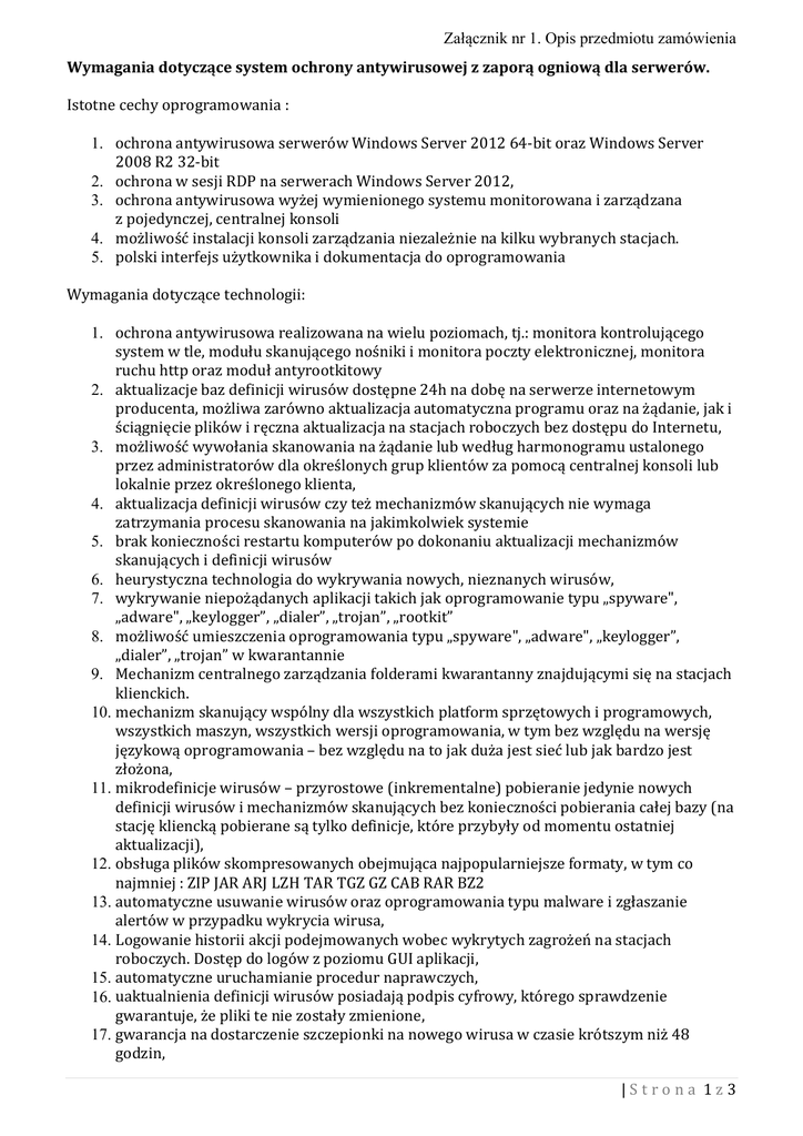 Załącznik nr 1. Opis przedmiotu zamówienia Wymagania dotyczące system ochrony antywirusowej z zaporą ogniową dla serwerów. Istotne cechy oprogramowania : 1. ochrona antywirusowa serwerów Windows Server 2012 64-bit oraz Windows Server 2008 R2 32-bit 2. ochrona w sesji RDP na serwerach Windows Server 2012, 3. ochrona antywirusowa wyżej wymienionego systemu monitorowana i zarządzana z pojedynczej, centralnej konsoli 4. możliwość instalacji konsoli zarządzania niezależnie na kilku wybranych stacjach. 5. polski interfejs użytkownika i dokumentacja do oprogramowania Wymagania dotyczące technologii: 1. ochrona antywirusowa realizowana na wielu poziomach, tj.: monitora kontrolującego system w tle, modułu skanującego nośniki i monitora poczty elektronicznej, monitora ruchu http oraz moduł antyrootkitowy 2. aktualizacje baz definicji wirusów dostępne 24h na dobę na serwerze internetowym producenta, możliwa zarówno aktualizacja automatyczna programu oraz na żądanie, jak i ściągnięcie plików i ręczna aktualizacja na stacjach roboczych bez dostępu do Internetu, 3. możliwość wywołania skanowania na żądanie lub według harmonogramu ustalonego przez administratorów dla określonych grup klientów za pomocą centralnej konsoli lub lokalnie przez określonego klienta, 4. aktualizacja definicji wirusów czy też mechanizmów skanujących nie wymaga zatrzymania procesu skanowania na jakimkolwiek systemie 5. brak konieczności restartu komputerów po dokonaniu aktualizacji mechanizmów skanujących i definicji wirusów 6. heurystyczna technologia do wykrywania nowych, nieznanych wirusów, 7. wykrywanie niepożądanych aplikacji takich jak oprogramowanie typu „spyware", „adware", „keylogger”, „dialer”, „trojan”, „rootkit” 8. możliwość umieszczenia oprogramowania typu „spyware", „adware", „keylogger”, „dialer”, „trojan” w kwarantannie 9. Mechanizm centralnego zarządzania folderami kwarantanny znajdującymi się na stacjach klienckich. 10. mechanizm skanujący wspólny dla wszystkich platform sprzętowych i programowych, wszystkich maszyn, wszystkich wersji oprogramowania, w tym bez względu na wersję językową oprogramowania – bez względu na to jak duża jest sieć lub jak bardzo jest złożona, 11. mikrodefinicje wirusów – przyrostowe (inkrementalne) pobieranie jedynie nowych definicji wirusów i mechanizmów skanujących bez konieczności pobierania całej bazy (na stację kliencką pobierane są tylko definicje, które przybyły od momentu ostatniej aktualizacji), 12. obsługa plików skompresowanych obejmująca najpopularniejsze formaty, w tym co najmniej : ZIP JAR ARJ LZH TAR TGZ GZ CAB RAR BZ2 13. automatyczne usuwanie wirusów oraz oprogramowania typu malware i zgłaszanie alertów w przypadku wykrycia wirusa, 14. Logowanie historii akcji podejmowanych wobec wykrytych zagrożeń na stacjach roboczych. Dostęp do logów z poziomu GUI aplikacji, 15. automatyczne uruchamianie procedur naprawczych, 16. uaktualnienia definicji wirusów posiadają podpis cyfrowy, którego sprawdzenie gwarantuje, że pliki te nie zostały zmienione, 17. gwarancja na dostarczenie szczepionki na nowego wirusa w czasie krótszym niż 48 godzin, |Strona 1z3 Załącznik nr 1. Opis przedmiotu zamówienia 18. średni czas reakcji producenta na nowy wirus poniżej 8 godzin, 24 godziny na dobę przez cały rok (24/7/365), 19. automatyczne powiadomienie użytkowników oraz administratora o pojawiających się zagrożeniach wraz z określeniem stacja robocza jest odpowiednio zabezpieczona 20. skanowanie przez program na komputerze klienckim przychodzącej i wychodzącej poczty elektronicznej bez konieczności instalowania dodatkowych programów/modułów. W programach pocztowych nie modyfikowane są ustawienia konta, tj. serwera POP3, SMTP i IMAP. Obsługuje m.in. MS Outlook, 21. skanowanie przez program na komputerze klienckim, danych pobieranych i wysyłanych danych przy pomocy protokołu HTTP 22. Ochrona podczas przeglądania sieci Internet 23. Możliwość pobierania aktualizacji przez klientów między sobą – tzw. „Neighborcast” pozwalające na odciążenie łącza do sieci WAN, 24. ochrona rejestrów systemowych, w tym odpowiedzialnych za konfigurację przeglądarki Internet Explorer, listę uruchamianych aplikacji przy starcie, przypisania rozszerzeń plików do zadanych aplikacji, 25. kontrola oraz możliwość blokowania aplikacji próbujących uzyskać połączenie z Internetem lub siecią lokalną 26. osobista zapora ogniowa (tzw. personal firewall) z możliwością definiowania profili bezpieczeństwa możliwych do przypisania dla pojedynczej stacji roboczej lub grup roboczych Wymagania dotyczące systemy zarządzania centralnego: 1. Konsola zarządzania umożliwia eksport pakietu instalacyjnego dla klienta w formacie Microsoft Installer (MSI) i JAR lub też bezpośrednią instalację zdalną nienadzorowaną 2. narzędzie instalacyjne musi sprawdzać istnienie poprzednich wersji oprogramowania. W przypadku znalezienia poprzedniej wersji instalator powinien pozostawić ustawienia użytkownika, usunąć starsze oprogramowanie z klienta lub serwera i instalować nowe wersję, 3. pełna administracja konfiguracją i monitorowanie stacji roboczych i serwerów plików za pomocą konsoli administracyjnej (centralna instalacja, konfiguracja w czasie rzeczywistym, zarządzanie, raportowanie i administrowanie oprogramowaniem), 4. pełne centralne zarządzanie dla Windows Server 2008 i Windows Server 2012 5. scentralizowane blokowanie i odblokowywanie dostępu użytkownika do zmian konfiguracyjnych oprogramowania klienckiego, konsola pozwala na zdalne zarządzanie wszystkimi ustawieniami klienta, 6. administratorzy muszą mieć możliwość tworzenia logicznych grup klientów i serwerów, w celu zarządzania oraz wymuszania określonych dla grupy zasad bezpieczeństwa 7. możliwość zmiany ustawień dla poszczególnych grup, umożliwienie a