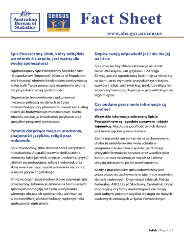 Fact Sheet www.abs.gov.au/census Spis Powszechny 2006, który odbędzie we wtorek 8 sierpnia, jest ważny dla twojej społeczności Ogólnokrajowy Spis Powszechny Mieszkańców i Gospodarstw Domowych [Census of Population and Housing] obejmie każdą osobę przebywającą w Australii. Twoja pomoc jest niezmiernie istotna dla przyszłości twojej społeczności. Organizacje środowiskowe, rząd, przemysł - wszyscy polegają na danych ze Spisu Powszechnego przy planowaniu świadczeń i usług takich jak budownictwo mieszkaniowe, służba zdrowia, edukacja, świadczenia językowe oraz specjalne programy pomocowe. Pytania dotyczące miejsca urodzenia, znajomości języków, religii oraz rodowodu Spis Powszechny 2006 stanowi obraz wszystkich mieszkańców Australii i odzwierciedla istotne elementy takie jak wiek, miejsce urodzenia, język(i) jakim(i) się posługujesz, religię i rodowód, oraz skalę ewentualnego zapotrzebowania na pomoc w nauce języka angielskiego. Etniczne organizacje środowiskowe popierają Spis Powszechny. Informacje zebrane na formularzach spisowych pomagają nie tylko w uzyskaniu wiernego obrazu ich społeczności, ale również w sprawiedliwej alokacji fuduszy rządowych dla społeczności etnicznych. Dopisz swoją odpowiedź jeśli nie ma jej na liście Spis Powszechny zbiera informacje na temat około 280 krajów, 240 języków i 120 religii. Ze względu na ograniczoną ilość miejsca nie da się na formularzu wymienić wszystkich tych krajów, języków i religii. Jeśli twój kraj, język lub religia nie zostały wymienione, dopisz je w przewidzianym do tego miejscu. Czy podane przez mnie informacje są poufne? Wszystkie informacje zebrane w Spisie Powszechnym są - zgodnie z prawem - objęte tajemnicą. Absolutna poufność twoich danych jest bezwzględnie gwarantowana. Żadne nazwiska ani adresy nie są zachowywane, chyba że zadeklarowałeś wolę udziału w programie Census Time Capsule [patrz niżej]. Wszystkie formularze spisowe oraz wszelkie pliki komputerowe zawierające nazwiska i adresy ulegają zniszczeniu po ich przetworzeniu. Każdy z pracowników spisu zobowiązany jest przez prawo do zachowania w tajemnicy wszelkich danych osobowych. Organizacje takie jak Policja Federalna, ASIO, Urząd Skarbowy, Centrelink, Urząd Imigracyjny czy firmy marketingowe nie mogą pod żadnym pozorem uzyskać dostępu do danych osobowych zebranych w Spisie Powszechnym. Polish – Page 1 of 2 Census Time Capsule Potrzebujesz pomocy? Każdy Australijczyk może zadecydować, by zebrane w Spisie Powszechnym informacje, wraz z jego nazwiskiem i adresem, zostały bezpiecznie zamknięte w Narodowym Archiwum Australii [National Archives of Australia] na okres 99 lat. Ponieważ przez 99 lat nikt nie będzie miał dostępu do tych informacji, projekt ten nazwany został Spisową Kapsułą Czasu [Census Time Capsule]. Z końcem lipca uruchomiona zostanie Spisowa Linia Informacyjna [Census Inquiry Service], oferująca pomoc w najpopularniejszych językach używanych w Australii. Wielojęzyczna Spisowa Linia Informacyjna [Census Inquiry Service Language Hotline] czynna będzie w godzinach 8:30 do 20:00 pod numerem 1300 363 365. W roku 2105 Narodowe Archiwum Australii przekaże informacje zawarte w Spisowej Kapsule Czasu do powszechnego użytku i przyszłe pokolenia będą mogły prześledzić swoje drzewa genealogiczne. Na wybranych obszarach zostaną ponadto zatrudnieni Ankieterzy Spisowi władający obcymi językami i przeszkoleni w udzielaniu pomocy. Również na stronie internetowej Spisu www.abs.gov.au/census - znaleźć będzie można wielojęzyczne informacje. Udział w projekcie Census Time Capsule jest całkowicie dobrowolny. W przypadku niewyrażenia zgody na wzięcie w nim udziału, po zakończeniu statystycznego przetwarzania danych wszelkie personalne informacje na temat danej osoby ulegną, zgodnie z rutynową praktyką Australijskiego Urzędu Statystycznego, zniszczeniu. Jak przeprowadza się Spis Powszechny Każda przebywająca w Australii osoba, w tym również turyści, zostanie policzona, niezależnie od tego gdzie znajdzie się w wieczór Spisu Powszechnego (wtorek, 8 sierpnia). Podczas dwóch tygodni poprzedzających dzień Spisu nasi Ankieterzy Spisowi doręczą do każdego domu formularz spisowy oraz informator, a w ciągu dwóch tygodni po dniu Spisu powrócą, aby zebrać wypełnione formularze. Osoby biorące udział w Spisie Powszechnym 2006 będą również miały możliwość wypełnienia formularza spisowego drogą internetową, w systemie on-line. Pamiętaj – Spis Powszechny to twoja szansa na to, by się liczyć. Polish – Page 2 of 2