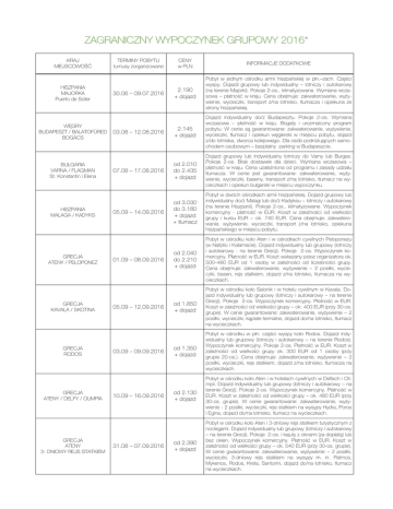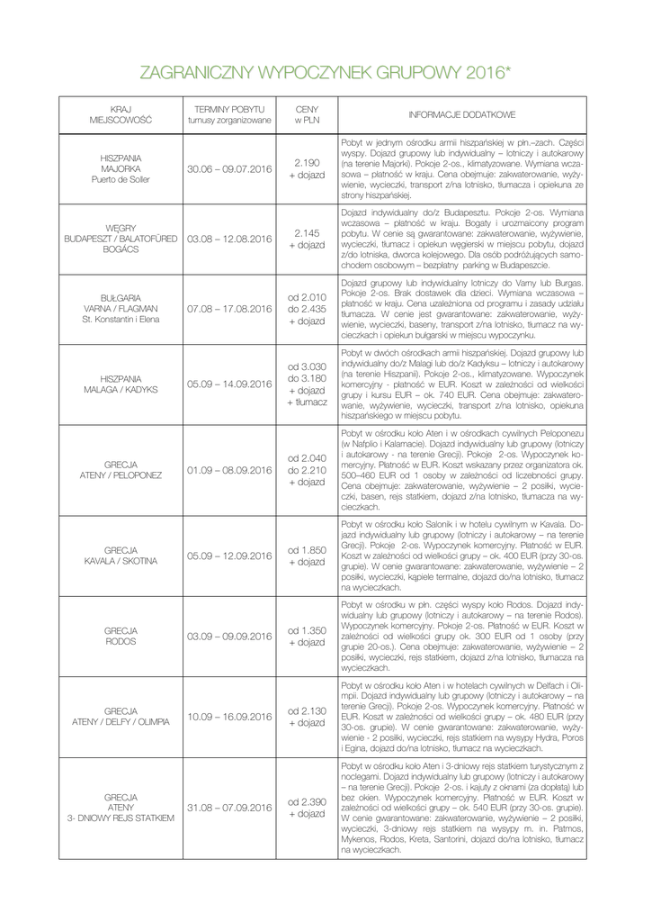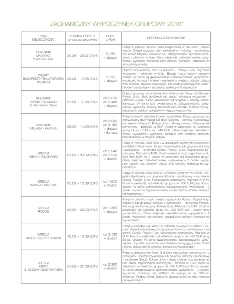 ZAGRANICZNY WYPOCZYNEK GRUPOWY 2016* KRAJ MIEJSCOWOŚĆ HISZPANIA MAJORKA Puerto de Soller WĘGRY BUDAPESZT / BALATOFÜRED BOGÁCS BUŁGARIA VARNA / FLAGMAN St. Konstantin i Elena HISZPANIA MALAGA / KADYKS GRECJA ATENY / PELOPONEZ GRECJA KAVALA / SKOTINA GRECJA RODOS GRECJA ATENY / DELFY / OLIMPIA GRECJA ATENY 3- DNIOWY REJS STATKIEM TERMINY POBYTU turnusy zorganizowane CENY w PLN INFORMACJE DODATKOWE 2.190 + dojazd Pobyt w jednym ośrodku armii hiszpańskiej w płn.–zach. Części wyspy. Dojazd grupowy lub indywidualny – lotniczy i autokarowy (na terenie Majorki). Pokoje 2-os., klimatyzowane. Wymiana wczasowa – płatność w kraju. Cena obejmuje: zakwaterowanie, wyżywienie, wycieczki, transport z/na lotnisko, tłumacza i opiekuna ze strony hiszpańskiej. 03.08 – 12.08.2016 2.145 + dojazd Dojazd indywidualny do/z Budapesztu. Pokoje 2-os. Wymiana wczasowa – płatność w kraju. Bogaty i urozmaicony program pobytu. W cenie są gwarantowane: zakwaterowanie, wyżywienie, wycieczki, tłumacz i opiekun węgierski w miejscu pobytu, dojazd z/do lotniska, dworca kolejowego. Dla osób podróżujących samochodem osobowym – bezpłatny parking w Budapeszcie. 07.08 – 17.08.2016 od 2.010 do 2.435 + dojazd Dojazd grupowy lub indywidualny lotniczy do Varny lub Burgas. Pokoje 2-os. Brak dostawek dla dzieci. Wymiana wczasowa – płatność w kraju. Cena uzależniona od programu i zasady udziału tłumacza. W cenie jest gwarantowane: zakwaterowanie, wyżywienie, wycieczki, baseny, transport z/na lotnisko, tłumacz na wycieczkach i opiekun bułgarski w miejscu wypoczynku. 05.09 – 14.09.2016 od 3.030 do 3.180 + dojazd + tłumacz Pobyt w dwóch ośrodkach armii hiszpańskiej. Dojazd grupowy lub indywidualny do/z Malagi lub do/z Kadyksu – lotniczy i autokarowy (na terenie Hiszpanii). Pokoje 2-os., klimatyzowane. Wypoczynek komercyjny - płatność w EUR. Koszt w zależności od wielkości grupy i kursu EUR – ok. 740 EUR. Cena obejmuje: zakwaterowanie, wyżywienie, wycieczki, transport z/na lotnisko, opiekuna hiszpańskiego w miejscu pobytu. od 2.040 do 2.210 + dojazd Pobyt w ośrodku koło Aten i w ośrodkach cywilnych Peloponezu (w Nafplio i Kalamacie). Dojazd indywidualny lub grupowy (lotniczy i autokarowy - na terenie Grecji). Pokoje 2-os. Wypoczynek komercyjny. Płatność w EUR. Koszt wskazany przez organizatora ok. 500–460 EUR od 1 osoby w zależności od liczebności grupy. Cena obejmuje: zakwaterowanie, wyżywienie – 2 posiłki, wycieczki, basen, rejs statkiem, dojazd z/na lotnisko, tłumacza na wycieczkach. od 1.850 + dojazd Pobyt w ośrodku koło Salonik i w hotelu cywilnym w Kavala. Dojazd indywidualny lub grupowy (lotniczy i autokarowy – na terenie Grecji). Pokoje 2-os. Wypoczynek komercyjny. Płatność w EUR. Koszt w zależności od wielkości grupy – ok. 400 EUR (przy 30-os. grupie). W cenie gwarantowane: zakwaterowanie, wyżywienie – 2 posiłki, wycieczki, kąpiele termalne, dojazd do/na lotnisko, tłumacz na wycieczkach. od 1.350 + dojazd Pobyt w ośrodku w płn. części wyspy koło Rodos. Dojazd indywidualny lub grupowy (lotniczy i autokarowy – na terenie Rodos). Wypoczynek komercyjny. Pokoje 2-os. Płatność w EUR. Koszt w zależności od wielkości grupy ok. 300 EUR od 1 osoby (przy grupie 20-os.). Cena obejmuje: zakwaterowanie, wyżywienie – 2 posiłki, wycieczki, rejs statkiem, dojazd z/na lotnisko, tłumacza na wycieczkach. od 2.130 + dojazd Pobyt w ośrodku koło Aten i w hotelach cywilnych w Delfach i Olimpii. Dojazd indywidualny lub grupowy (lotniczy i autokarowy – na terenie Grecji). Pokoje 2-os. Wypoczynek komercyjny. Płatność w EUR. Koszt w zależności od wielkości grupy – ok. 480 EUR (przy 30-os. grupie). W cenie gwarantowane: zakwaterowanie, wyżywienie - 2 posiłki, wycieczki, rejs statkiem na wysypy Hydra, Poros i Egina, dojazd do/na lotnisko, tłumacz na wycieczkach. od 2.390 + dojazd Pobyt w ośrodku koło Aten i 3-dniowy rejs statkiem turystycznym z noclegami. Dojazd indywidualny lub grupowy (lotniczy i autokarowy – na terenie Grecji). Pokoje 2-os. i kajuty z oknami (za dopłatą) lub bez okien. Wypoczynek komercyjny. Płatność w EUR. Koszt w zależności od wielkości grupy – ok. 540 EUR (przy 30-os. grupie). W cenie gwarantowane: zakwaterowanie, wyżywienie – 2 posiłki, wycieczki, 3-dniowy rejs statkiem na wysypy m. in. Patmos, Mykenos, Rodos, Kreta, Santorini, dojazd do/na lotnisko, tłumacz na wycieczkach. 30.06 – 09.07.2016 01.09 – 08.09.2016 05.09 – 12.09.2016 03.09 – 09.09.2016 10.09 – 16.09.2016 31.08 – 07.09.2016 PORTUGALIA LIZBONA / PORTO WŁOCHY – SYCYLIA CEFALU k. Palermo GRECJA – KRETA MALEME k. Chanii Hotel Castro od 2.840 do 3.000 + dojazd + tłumacz Pobyt w dwóch ośrodkach w Porto i koło Lizbony. Dojazd grupowy lub indywidualny (lotniczy i autokarowy – na terenie Portugalii). Wypoczynek wymienny (przy grupie 20-os.) lub komercyjny. Pokoje 2-os. Płatność w kraju. Koszt w zależności od wielkości grupy i zasady udziału tłumacza oraz opiekuna. Cena obejmuje: zakwaterowanie, wyżywienie, wycieczki, dojazd z/na lotnisko, opiekuna ze strony portugalskiej. 22.09 – 05.10.2016 2.550 + dojazd Pobyt w ośrodku koło Palermo. Dojazd grupowy lub indywidualny (lotniczy i autokarowy – na terenie wyspy). Pokoje studio z aneksem kuchennym. Wypoczynek komercyjny. Możliwość wyżywienia w pobliskiej restauracji/pizzerii – w ramach opłat dodatkowych. Płatność w EUR w miejscu wypoczynku. Koszt w zależności od wielkości grupy – ok. 592 EUR (przy 20 osobach). W cenie: zakwaterowanie, śniadanie włoskie, wycieczki, tłumacz na wycieczkach, transport z/na lotnisko w Palermo. Na niektórych wycieczkach możliwa dopłata za bilety wstępu. 08.09 – 15.09.2016 970 + dojazd + wycieczki 08.09 – 23.09.2016 1.700 + dojazd + wycieczki 22.08 – 29.08.2016 Pobyt w ośrodku armii belgijskiej – blisko Chanii. Dojazd grupowy lub indywidualny (lotniczy). Pokoje 2-os. Wypoczynek komercyjny. P