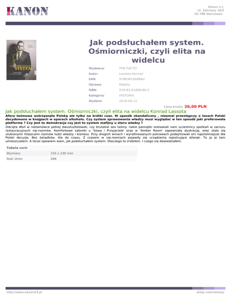 Kanon s.c. Ul. Zamiany 16/2 02-786 Warszawa Jak podsłuchałem system. Ośmiorniczki, czyli elita na widelcu Wydawca: THE FACTO Autor: Lassota Konrad EAN: 9788361808862 Oprawa: Miękka ISBN: 978-83-61808-86-2 Kategoria: HISTORIA Wydano: 2016-04-12 Cena brutto: 26,00 PLN Jak podsłuchałem system. Ośmiorniczki, czyli elita na widelcu Konrad Lassota Afera taśmowa wstrząsnęła Polską ale tylko na krótki czas. W sposób skandaliczny , nieomal przestępczy o losach Polski decydowano w knajpach w oparach alkoholu. Czy system sprawowania władzy musi wyglądać w ten sposób jaki preferowała platforma ? Czy jest to demokracja czy jest to system mafijny u steru władzy ? Odcięta dłoń w reklamówce pełnej dwustuzłotówek, czy brutalne sex taśmy -takie pamiątki zostawiali nam uczestnicy spotkań w zaciszu restauracyjnych vip-roomów. Komfortowe saloniki u 'Sowa i Przyjaciele' oraz w 'Amber Room' zapewniały dyskrecję, więc stały się ulubionymi miejscami rozmów ludzi władzy i biznesu. Przy drogich winach i wyrafinowanych potrawach podejmowali oni najistotniejsze dla Polski decyzje. Bez świadków. Ale do czasu. Z czasem w vip-roomach pojawiły się urządzenia rejestrujące dźwięk. To ja je tam umieszczałem. A teraz opowiem wam, jak podsłuchałem system. Dlaczego to zrobiłem. I czego się dowiedziałem. Tabela cech Wymiary 155 x 230 mm Ilość stron 266 http://www.kanon24.pl sklep internetowy