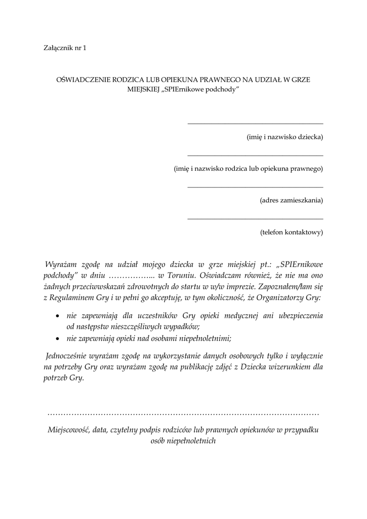Załącznik nr 1 OŚWIADCZENIE RODZICA LUB OPIEKUNA PRAWNEGO NA UDZIAŁ W GRZE MIEJSKIEJ „SPIErnikowe podchody” ________________________________________ (imię i nazwisko dziecka) ________________________________________ (imię i nazwisko rodzica lub opiekuna prawnego) ________________________________________ (adres zamieszkania) ________________________________________ (telefon kontaktowy) Wyrażam zgodę na udział mojego dziecka w grze miejskiej pt.: „SPIErnikowe podchody” w dniu ……………... w Toruniu. Oświadczam również, że nie ma ono żadnych przeciwwskazań zdrowotnych do startu w w/w imprezie. Zapoznałem/łam się z Regulaminem Gry i w pełni go akceptuję, w tym okoliczność, że Organizatorzy Gry:  nie zapewniają dla uczestników Gry opieki medycznej ani ubezpieczenia od następstw nieszczęśliwych wypadków;  nie zapewniają opieki nad osobami niepełnoletnimi; Jednocześnie wyrażam zgodę na wykorzystanie danych osobowych tylko i wyłącznie na potrzeby Gry oraz wyrażam zgodę na publikację zdjęć z Dziecka wizerunkiem dla potrzeb Gry. ………………………………………………………………………………………… Miejscowość, data, czytelny podpis rodziców lub prawnych opiekunów w przypadku osób niepełnoletnich
