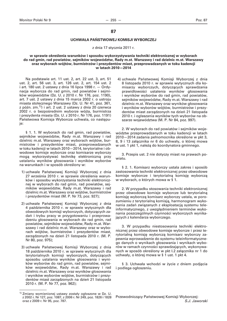 Monitor Polski Nr 9 — 255 — Poz. 87 87 UCHWAŁA PAŃSTWOWEJ KOMISJI WYBORCZEJ z dnia 17 stycznia 2011 r. w sprawie określenia warunków i sposobu wykorzystywania techniki elektronicznej w wyborach do rad gmin, rad powiatów, sejmików województw, Rady m.st. Warszawy i rad dzielnic m.st. Warszawy oraz wyborach wójtów, burmistrzów i prezydentów miast, przeprowadzanych w toku kadencji w latach 2010—2014 Na podstawie art. 11 ust. 2, art. 22 ust. 3, art. 51 ust. 2, art. 56 ust. 3, art. 126 ust. 2, art. 154 ust. 2 i art. 180 ust. 2 ustawy z dnia 16 lipca 1998 r. — Ordynacja wyborcza do rad gmin, rad powiatów i sejmików województw (Dz. U. z 2010 r. Nr 176, poz. 1190), art. 7 ust. 2 ustawy z dnia 15 marca 2002 r. o ustroju miasta stołecznego Warszawy (Dz. U. Nr 41, poz. 361, z późn. zm.1)) i art. 2 ust. 2 ustawy z dnia 20 czerwca 2002 r. o bezpośrednim wyborze wójta, burmistrza i prezydenta miasta (Dz. U. z 2010 r. Nr 176, poz. 1191) Państwowa Komisja Wyborcza uchwala, co następuje: § 1. 1. W wyborach do rad gmin, rad powiatów, sejmików województw, Rady m.st. Warszawy i rad dzielnic m.st. Warszawy oraz wyborach wójtów, burmistrzów i prezydentów miast, przeprowadzanych w toku kadencji w latach 2010—2014, terytorialne i obwodowe komisje wyborcze oraz komisarze wyborczy mogą wykorzystywać technikę elektroniczną przy ustalaniu wyników głosowania i wyników wyborów na warunkach i w sposób określony w: 1) uchwale Państwowej Komisji Wyborczej z dnia 27 września 2010 r. w sprawie określenia warunków i sposobu wykorzystania techniki elektronicznej w wyborach do rad gmin, rad powiatów, sejmików województw, Rady m.st. Warszawy i rad dzielnic m.st. Warszawy oraz wójtów, burmistrzów i prezydentów miast (M. P. Nr 73, poz. 927); 2) uchwale Państwowej Komisji Wyborczej z dnia 4 października 2010 r. w sprawie wytycznych dla obwodowych komisji wyborczych, dotyczących zadań i trybu pracy w przygotowaniu i przeprowadzeniu głosowania w wyborach do rad gmin, rad powiatów, sejmików województw, Rady m.st. Warszawy i rad dzielnic m.st. Warszawy oraz w wyborach wójtów, burmistrzów i prezydentów miast, zarządzonych na dzień 21 listopada 2010 r. (M. P. Nr 80, poz. 975); 3) uchwale Państwowej Komisji Wyborczej z dnia 18 października 2010 r. w sprawie wytycznych dla terytorialnych komisji wyborczych, dotyczących sposobu ustalania wyników głosowania i wyników wyborów do rad gmin, rad powiatów, sejmików województw, Rady m.st. Warszawy i rad dzielnic m.st. Warszawy oraz wyników głosowania i wyników wyborów wójtów, burmistrzów i prezydentów miast zarządzonych na dzień 21 listopada 2010 r. (M. P. Nr 77, poz. 962); 1) Zmiany wymienionej ustawy zostały ogłoszone w Dz. U. z 2002 r. Nr 127, poz. 1087, z 2006 r. Nr 249, poz. 1826 i 1828 oraz z 2009 r. Nr 95, poz. 787. 4) uchwale Państwowej Komisji Wyborczej z dnia 8 listopada 2010 r. w sprawie wytycznych dla komisarzy wyborczych, dotyczących sprawdzania prawidłowości ustalenia wyników głosowania i wyników wyborów do rad gmin, rad powiatów, sejmików województw, Rady m.st. Warszawy i rad dzielnic m.st. Warszawy oraz wyników głosowania i wyników wyborów wójtów, burmistrzów i prezydentów miast zarządzonych na dzień 21 listopada 2010 r. i ogłaszania wyników tych wyborów na obszarze województwa (M. P. Nr 84, poz. 997). 2. W wyborach do rad powiatów i sejmików województw przeprowadzanych w toku kadencji w latach 2010—2014 zadania pełnomocnika określone w pkt 3, 8, 9 i 13 załącznika nr 6 do uchwały, o której mowa w ust. 1 pkt 1, należą do koordynatora gminnego. 3. Przepis ust. 2 nie dotyczy miast na prawach powiatu. § 2. 1. Komisarz wyborczy ustala zakres i sposób zastosowania techniki elektronicznej przez obwodowe komisje wyborcze i terytorialną komisję wyborczą w wyborach, o których mowa w § 1. 2. W przypadku stosowania techniki elektronicznej przez obwodowe komisje wyborcze lub terytorialną komisję wyborczą komisarz wyborczy ustala, w porozumieniu z terytorialną komisją, harmonogram wykonania zadań związanych z eksploatacją systemu teleinformatycznego, z uwzględnieniem terminów wykonania poszczególnych czynności wyborczych wynikających z kalendarza wyborczego. 3. W przypadku niestosowania techniki elektronicznej przez obwodowe komisje wyborcze i przez terytorialną komisję wyborczą komisarz wyborczy zapewnia wprowadzenie do systemu teleinformatycznego danych o wynikach głosowania i wynikach wyborów w ramach czynności sprawdzających, wykonywanych w sposób określony w pkt I.2 załącznika nr 1 do uchwały, o której mowa w § 1 ust. 1 pkt 4. § 3. Uchwała wchodzi w życie z dniem podjęcia i podlega ogłoszeniu. Przewodniczący Państwowej Komisji Wyborczej: S.J. Jaworski