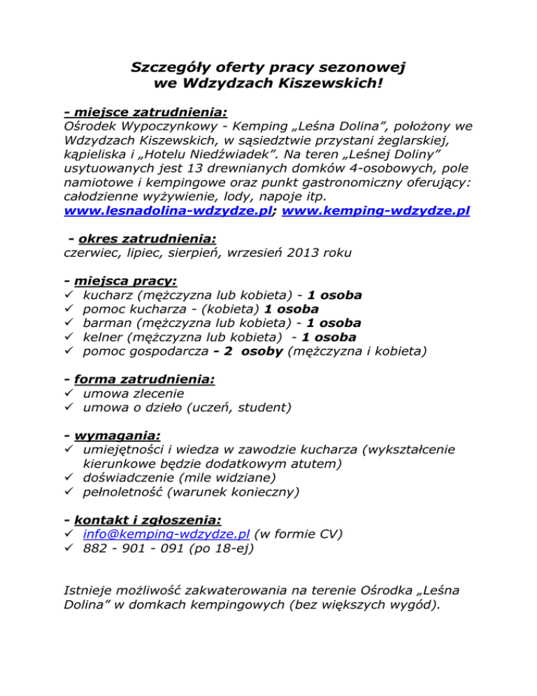 Szczegóły oferty pracy sezonowej we Wdzydzach Kiszewskich! - miejsce zatrudnienia: Ośrodek Wypoczynkowy - Kemping „Leśna Dolina”, położony we Wdzydzach Kiszewskich, w sąsiedztwie przystani żeglarskiej, kąpieliska i „Hotelu Niedźwiadek”. Na teren „Leśnej Doliny” usytuowanych jest 13 drewnianych domków 4-osobowych, pole namiotowe i kempingowe oraz punkt gastronomiczny oferujący: całodzienne wyżywienie, lody, napoje itp. www.lesnadolina-wdzydze.pl; www.kemping-wdzydze.pl - okres zatrudnienia: czerwiec, lipiec, sierpień, wrzesień 2013 roku - miejsca pracy: kucharz (mężczyzna lub kobieta) - 1 osoba pomoc kucharza - (kobieta) 1 osoba barman (mężczyzna lub kobieta) - 1 osoba kelner (mężczyzna lub kobieta) - 1 osoba pomoc gospodarcza - 2 osoby (mężczyzna i kobieta) - forma zatrudnienia: umowa zlecenie umowa o dzieło (uczeń, student) - wymagania: umiejętności i wiedza w zawodzie kucharza (wykształcenie kierunkowe będzie dodatkowym atutem) doświadczenie (mile widziane) pełnoletność (warunek konieczny) - kontakt i zgłoszenia: [email protected] (w formie CV) 882 - 901 - 091 (po 18-ej) Istnieje możliwość zakwaterowania na terenie Ośrodka „Leśna Dolina” w domkach kempingowych (bez większych wygód).