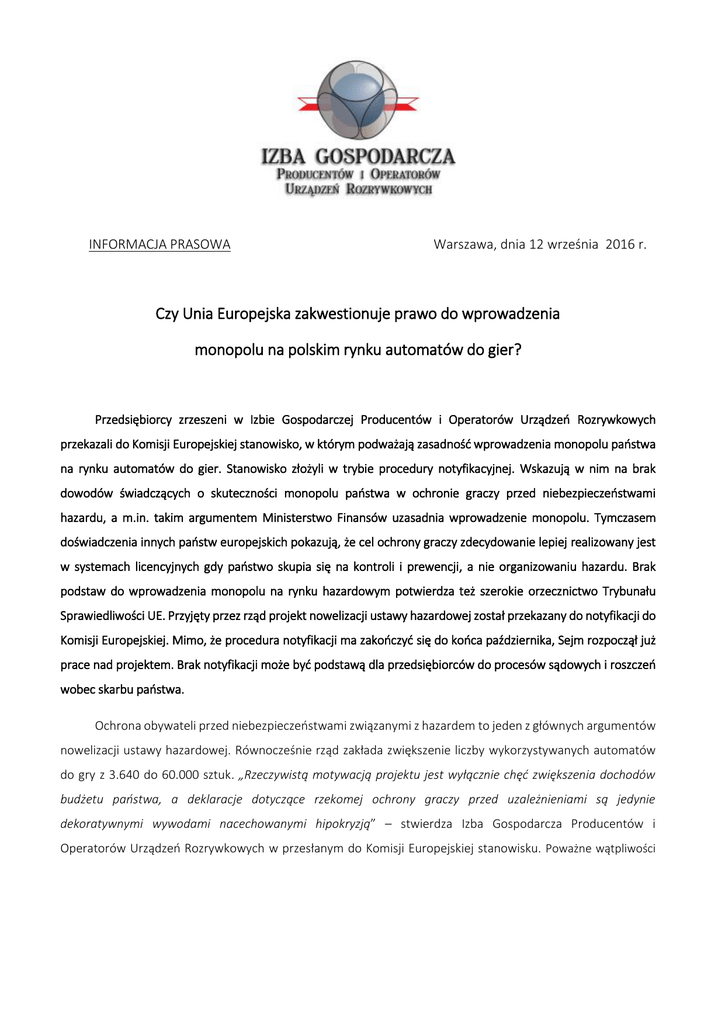 INFORMACJA PRASOWA Warszawa, dnia 12 września 2016 r. Czy Unia Europejska zakwestionuje prawo do wprowadzenia monopolu na polskim rynku automatów do gier? Przedsiębiorcy zrzeszeni w Izbie Gospodarczej Producentów i Operatorów Urządzeń Rozrywkowych przekazali do Komisji Europejskiej stanowisko, w którym podważają zasadność wprowadzenia monopolu państwa na rynku automatów do gier. Stanowisko złożyli w trybie procedury notyfikacyjnej. Wskazują w nim na brak dowodów świadczących o skuteczności monopolu państwa w ochronie graczy przed niebezpieczeństwami hazardu, a m.in. takim argumentem Ministerstwo Finansów uzasadnia wprowadzenie monopolu. Tymczasem doświadczenia innych państw europejskich pokazują, że cel ochrony graczy zdecydowanie lepiej realizowany jest w systemach licencyjnych gdy państwo skupia się na kontroli i prewencji, a nie organizowaniu hazardu. Brak podstaw do wprowadzenia monopolu na rynku hazardowym potwierdza też szerokie orzecznictwo Trybunału Sprawiedliwości UE. Przyjęty przez rząd projekt nowelizacji ustawy hazardowej został przekazany do notyfikacji do Komisji Europejskiej. Mimo, że procedura notyfikacji ma zakończyć się do końca października, Sejm rozpoczął już prace nad projektem. Brak notyfikacji może być podstawą dla przedsiębiorców do procesów sądowych i roszczeń wobec skarbu państwa. Ochrona obywateli przed niebezpieczeństwami związanymi z hazardem to jeden z głównych argumentów nowelizacji ustawy hazardowej. Równocześnie rząd zakłada zwiększenie liczby wykorzystywanych automatów do gry z 3.640 do 60.000 sztuk. „Rzeczywistą motywacją projektu jest wyłącznie chęć zwiększenia dochodów budżetu państwa, a deklaracje dotyczące rzekomej ochrony graczy przed uzależnieniami są jedynie dekoratywnymi wywodami nacechowanymi hipokryzją” – stwierdza Izba Gospodarcza Producentów i Operatorów Urządzeń Rozrywkowych w przesłanym do Komisji Europejskiej stanowisku. Poważne wątpliwości Izby budzi także fakt, że Sejm rozpoczyna prace nad ustawą przed zakończeniem procedury notyfikacyjnej. Mimo, że pozostały jeszcze blisko dwa miesiące, Sejm rozpoczął już prace nad nowelizacją i zaplanowano pierwsze czytanie na najbliższe posiedzenie Sejmu. Brak notyfikacji poprzedniej ustawy powodował niespójność prawną oraz liczne sprawy sądowe. Działalność w sektorze gier hazardowych stale prowadzona jest obecnie w stanie niepewności prawnej. „Nie ulega wątpliwości, że stan prawny wymaga poprawy i uporządkowania. Nie jest to jednak możliwe, jeśli za punkt wyjścia przyjmuje się sprzeczne z prawem Unii rozwiązania prawa krajowego i w ich świetle ocenia się sytuację na rynku gier hazardowych.” – podkreśla IGPiOUR. W stanowisku przekazanym do UE Izba wskazuje, że opierając się na analizie zgodności projektu z prawem Unii Europejskiej ustanowienie monopolu w sektorze urządzania gier na automatach poza kasynami może być potencjalnie i teoretycznie zgodne z prawem UE, ale żeby było legalne ustawa musi spełniać trzy warunki. Musi realizować przede wszystkim usprawiedliwione nadrzędne cele związane z ochroną społeczeństwa. Ustanowione prawo musi zakładać rozsądną relację pomiędzy usprawiedliwionym celem, a negatywnymi konsekwencjami regulacji. Dodatkowo, prawo musi być spójne i systematyczne, jeśli chodzi o sposób osiągania zakładanego celu. Analiza orzecznictwa Trybunału Sprawiedliwości Unii Europejskiej w zakresie regulacji rynku gier hazardowych, potwierdza zasadność kwestionowania wprowadzenia monopolu na polskim rynku hazardowym. Izba powołuje się także na przykłady orzecznictwa sądów austriackich, niemieckich i holenderskich, które jednoznacznie wskazują, że odchodzi się od postrzegania tworzenia czy utrzymywania monopoli hazardowych jako oczywistego środka, który zagwarantuje realizację ogólnych celów społecznych, takich jak walka z uzależnieniami czy bezpieczeństwo publiczne. Brak skuteczności monopolu państwa w ochronie graczy potwierdzają doświadczenia innych państw europejskich. Mimo przyjęcia modelu monopolu w Szwecji czy Norwegii, poziom uzależnienia pozostaje tam na wysokim poziomie. Tylko w ostatnich latach państwa takie jak Hiszpania, Włochy, Dania zrezygnowały z monopolu rynku automatów do gier i przeszły na system licencji. Państwa te są przykładami, że liberalizacja rynku gier hazardowych nie musi prowadzić do podniesienia poziomu uzależnienia od hazardu w społeczeństwie. Polska branża automatów do gier, która od wielu lat śledzi rozwój rynku hazardowego na świecie również wątpi, że to rozwiązanie przyniesie inne efekty w Polsce - Skoro monopol państwa nie zadziałał w innych państwach to trudno przyjąć, że zadziała w Polsce – twierdzi Stanisław Matuszewski, prezes Izby Gospodarczej Producentów i Operatorów Urządzeń Rozrywkowych. Helmut Kafka, były wiceprzewodniczący Europejskiej Federacji Gier i Rozrywki (EUROMAT), uważa, że legalnie działający pod kontrolą państwa przedsiębiorcy to skuteczniejsza ochrona obywateli, którzy zawsze znajdą sposób by skorzystać z tej formy rozrywki: - Ochrona konsumenta najlepiej funkcjonuje w otwartej, wolnej konkurencji, która automatycznie jest przyjazna konsumentom i dla nich atrakcyjna. W przeciwnej sytuacji gracze IZBA GOSPODARCZA PRODUCENTÓW I OPERATORÓW URZĄDZEŃ ROZRYWKOWYCH Ul: WILCZA 54 A LOK. 7, 00-679 WARSZAWA TEL: + 48 22 622 79 99 [email protected] WWW.IZBAGOSPODARCZA.PL KRS:0000169796, NIP: 525-21-00-399, REGON: 013176559 zaczną szukać innych rozwiązań będących poza kontrolą państwa. W ocenie austriackiego eksperta cel jest możliwy do osiągnięcia, ale nie przez wprowadzenie monopolu: - Tylko jeśli istnieje zdrowa konkurencja pomiędzy różnymi podmiotami, konsument jest chroniony od bycia wykorzystanym. To jest najlepsza możliwa ochrona gracza – twierdzi Kafka i podkreśla, że nie wyk