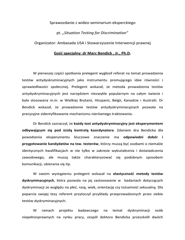 Sprawozdanie z wideo-seminarium eksperckiego pt. „Situation Testing for Discrimination” Organizator: Ambasada USA i Stowarzyszenie Interwencji prawnej Gość specjalny: dr Marc Bendick , Jr., Ph.D. W pierwszej części spotkania prelegent wygłosił referat na temat prowadzenia testów antydyskryminacyjnych jako instrumentu promującego idee równości i sprawiedliwości społecznej. Prelegent wskazał, że metoda prowadzenia testów antydyskryminacyjnych jest narzędziem niezwykle popularnym na całym świecie i była stosowana m.in. w Wielkiej Brytanii, Hiszpanii, Belgii, Kanadzie i Australii. Dr Bendick wskazał, że prowadzenie testów antydyskryminacyjnych pozwala na precyzyjne zidentyfikowanie mechanizmu nierównego traktowania. Dr Bendick zaznaczył, że każdy test antydyskryminacyjny jest eksperymentem odbywającym się pod ścisłą kontrolą koordynatora. Zdaniem dra Bendicka dla powodzenia eksperymentu kluczowe znaczenie ma odpowiedni dobór i przygotowanie kandydatów na tzw. testerów, którzy muszą być osobami o niemalże identycznych kwalifikacjach w nie tylko w zakresie wykształcenia i doświadczenia zawodowego, ale muszą także charakteryzować się podobnym sposobem komunikacji, ubierania się itp. W swoim wystąpieniu prelegent wskazał na elastyczność metody testów dyskryminacyjnych, która pozwala na jej zastosowanie w badaniach dotyczących dyskryminacji ze względu na płeć, rasę, wiek, orientację czy tożsamość seksualną. Dla poparcia swojej tezy referent przytoczył przykłady przeprowadzonych przez siebie testów dyskryminacyjnych. W ramach projektu badawczego na temat dyskryminacji osób niepełnosprawnych na rynku pracy, zespół doktora Bendicka przeszkolił dwóch kandydatów, którzy mieli wcielić się w rolę kandydatów na stanowisko urzędnika administracji. Osoby te charakteryzowały się podobnym poziomem wykształcenia (ze wskazaniem na kandydata niepełnosprawnego) i doświadczenia zawodowego. Kandydatów przeszkolono również, aby podczas rozmowy kwalifikacyjnej z potencjalnym pracodawcą udzielali podobnych odpowiedzi na zadawane pytania. Jedyną cechą różniącą kandydatów była niepełnosprawność jednego z nich. Z testów wynikło, że po przeprowadzeniu rozmowy kwalifikacyjnej pracę zaoferowano osobie pełnosprawnej, która odrzuciła ofertę, po czym kandydatowi niepełnosprawnej udzielono nieprawdziwej informacji, że stanowisko jest już obsadzone. Analogiczne testy prowadzono również badając podejście potencjalnych pracodawców do kandydatów- osób transseksualnych i osób starszych. Dr Bendick prowadził również testy pod kątem dyskryminacji ze względu na płeć, sprawdzając, czy cena usługi naprawy konkretnego samochodu będzie jednakowa w stosunku do kobiet i mężczyzn. Wielokrotne przeprowadzenie testu wskazało, że w przypadku, gdy klientką była kobieta osoby świadczące taką usługę w bezprawny sposób zawyżały koszt naprawy samochodu. Referent wskazał, że testy dyskryminacyjne są rozwiązaniem, które pozwalają na przedstawienie społeczeństwu problemu dyskryminacji w przystępny i obrazowy sposób. Zdaniem dra Bendicka wyniki przeprowadzonych testów dyskryminacyjnych mogą stanowić nie tylko pomoc dla sędziów w orzekaniu w sprawach dyskryminacyjnych, ale także są poważnym argumentem w dyskusji dotyczącej stanowienia prawa antydyskryminacyjnego.