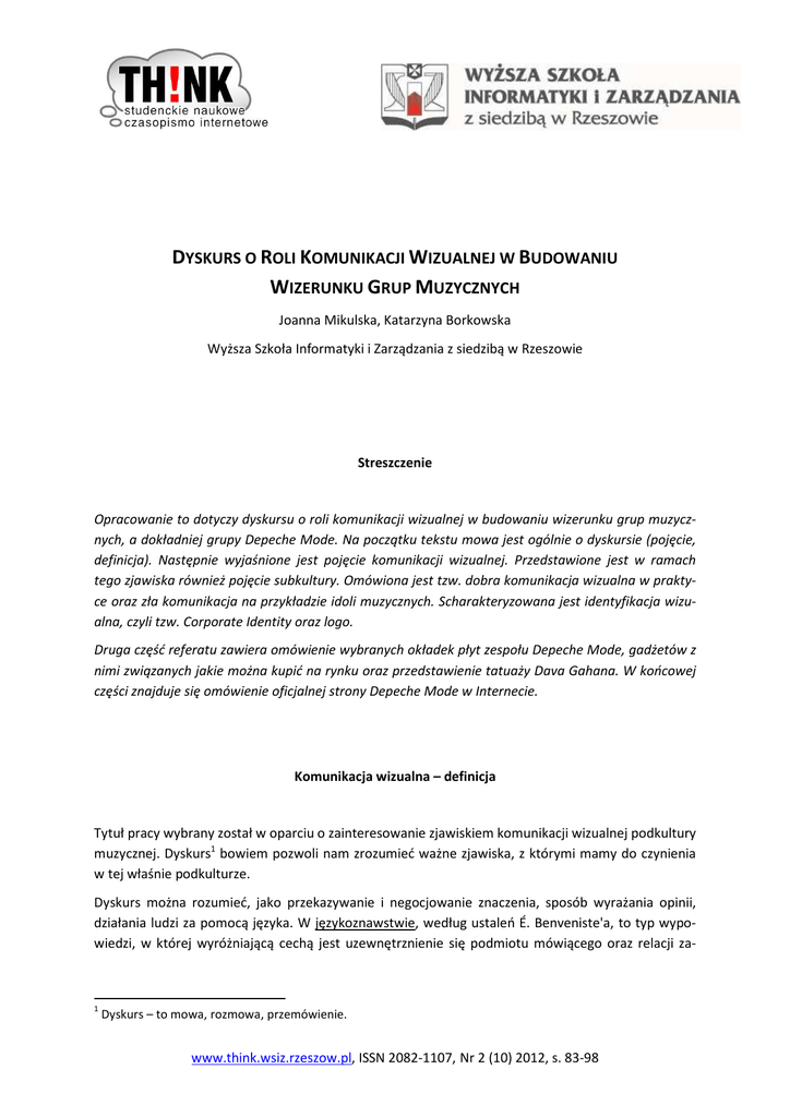 DYSKURS O ROLI KOMUNIKACJI WIZUALNEJ W BUDOWANIU WIZERUNKU GRUP MUZYCZNYCH Joanna Mikulska, Katarzyna Borkowska Wyższa Szkoła Informatyki i Zarządzania z siedzibą w Rzeszowie Streszczenie Opracowanie to dotyczy dyskursu o roli komunikacji wizualnej w budowaniu wizerunku grup muzycznych, a dokładniej grupy Depeche Mode. Na początku tekstu mowa jest ogólnie o dyskursie (pojęcie, definicja). Następnie wyjaśnione jest pojęcie komunikacji wizualnej. Przedstawione jest w ramach tego zjawiska również pojęcie subkultury. Omówiona jest tzw. dobra komunikacja wizualna w praktyce oraz zła komunikacja na przykładzie idoli muzycznych. Scharakteryzowana jest identyfikacja wizualna, czyli tzw. Corporate Identity oraz logo. Druga część referatu zawiera omówienie wybranych okładek płyt zespołu Depeche Mode, gadżetów z nimi związanych jakie można kupić na rynku oraz przedstawienie tatuaży Dava Gahana. W końcowej części znajduje się omówienie oficjalnej strony Depeche Mode w Internecie. Komunikacja wizualna – definicja Tytuł pracy wybrany został w oparciu o zainteresowanie zjawiskiem komunikacji wizualnej podkultury muzycznej. Dyskurs1 bowiem pozwoli nam zrozumieć ważne zjawiska, z którymi mamy do czynienia w tej właśnie podkulturze. Dyskurs można rozumieć, jako przekazywanie i negocjowanie znaczenia, sposób wyrażania opinii, działania ludzi za pomocą języka. W językoznawstwie, według ustaleń É. Benveniste'a, to typ wypowiedzi, w której wyróżniającą cechą jest uzewnętrznienie się podmiotu mówiącego oraz relacji za- 1 Dyskurs – to mowa, rozmowa, przemówienie. www.think.wsiz.rzeszow.pl, ISSN 2082-1107, Nr 2 (10) 2012, s. 83-98 Dyskurs o roli komunikacji wizualnej w budowaniu wizerunku grup muzycznych chodzących między nim a adresatem. Dyskurs jest więc nieodłączną częścią szerszego zjawiska jakim jest komunikowanie się. Otóż, pod pojęciem komunikacji2 należy rozumieć: - łączność między bliższymi lub dalszymi miejscami utrzymaną za pomocą różnych środków; - porozumiewanie się, przekazywanie myśli, udzielanie informacji, wymiana wiadomości. Należy tu zwrócić uwagę na stwierdzenie: „za pomocą różnych środków”, a więc porozumiewanie się zachodzi nie tylko za pomocą bezpośredniej rozmowy, ale również komunikując się przez telefon, za pomocą Internetu bądź bardziej tradycyjnie – za pomocą listów czy pocztówek. Co więcej, tymi „różnymi środkami” w ogóle nie muszą być słowa, ale również inne formy m.in., obraz, dźwięk, itp. Wiesław Kopaliński, twórca słownika wyrazów obcych, udziela takiej oto odpowiedzi na pytanie czym jest komunikacja: „komunikatywność to zdolność, umiejętność docierania do odbiorcy w procesie porozumiewania się, zrozumiałość, wyrazistość”3. Bardzo słuszne stwierdzenie wyraża Hannah Arendit w książce „Myślenie” – „komunikacja międzyludzka nie wymaga naszego języka z jego złożoną gramatyką i składnią. Można się bowiem komunikować w znacznie prostszy sposób, np. język zwierząt – dźwięki, znaki.” Zdaniem pisarki gesty wystarczyłyby nie tylko dla zaspokojenia wszystkich bezpośrednich potrzeb związanych z przetrwaniem gatunku, ale również do wyrażania nastrojów oraz uczuć4. Mieczysław Wallis, twórca książki „Sztuki i znaki” uważa, iż znaki nie są wyłącznym, lecz niezmiernie doniosłym środkiem porozumiewania się ludzi”5. W książce „Oblicza komunikowania wizualnego” pod red. Rafała Polaka, za P. Przywarą stwierdzić można, iż fenomen języka obrazkowego jest tak stary jak pismo, a początki jego związane są z używaniem przez ludzi znaków ikonicznych jako jednostek językowych. Komunikacja wizualna jest komunikowaniem się z drugą osobą, bądź też grupą osób za pomocą form obrazowych. Mówiąc inaczej, idee i pomysły przekazywane są za pomocą obrazów: ikon, rysunków, loga, filmu. Do komunikatów wizualnych będą należeć więc bilbordy reklamowe, jak i znaki drogowe, reklamy telewizyjne i rysunki dzieci. Można śmiało stwierdzić, że komunikacja wizualna jest nieodłączną częścią naszego życia, której w zależności od sytuacji poświęcamy mniej lub więcej uwagi. Komunikacja wizualna odgrywa bardzo dużą rolę również w muzyce. Zespoły czy wokaliści również posługują się ową komunikacją, gdyż bez niej nie mogliby istnieć na rynku muzycznym. Fani tworzą z kolei subkultury, by w ten sposób łatwo komunikować się ze sobą za pomocą wyróżniających ich elementów. 2 Mały słownik języka polskiego, Wydawnictwo Naukowe PWN, Warszawa 1994, s. 332. W. Kopaliński, Słownik wyrazów obcych i zwrotów obcojęzycznych, Wiedza Powszechna, Warszawa 1983, s. 224. 4 H. Arendit, Myślenie, Czytelnik, Warszawa 1991, s. 148. 5 M. Wallis, Sztuki i znaki, PIW, Warszawa 1983, s. 30. 3 84 Dyskurs o roli komunikacji wizualnej w budowaniu wizerunku grup muzycznych Subkultura Na potrzeby opracowania należy również wyjaśnić termin „subkultura”, gdyż jest on trwale wpisany w kontekst jaki stanowią zespoły muzyczne. Pojęcie „subkultura” w potocznym rozumieniu stawia się w jednym rzędzie z takimi określeniami jak „nieprzystosowanie społeczne”, „patologia społeczna”, kojarzy się ono bowiem z negacją obowiązujących wzorów kulturowych, z rewoltą i buntem – ma więc wydźwięk pejoratywny. Rozumienie takie, całkowicie niewystarczające w analizie naukowej, nie uwzględnia niestety wielości subkulturowych odmian, oraz ich kontekstu historycznego. Dokonać należy zatem neutralnej analizy pojęcia „subkultura”, jak i związanych z nim terminów „kontrkultura” i „kultura alternatywna”6. Termin „subkultura” z czasem zaczął być używany w znaczeniu wartościującym, prawdopodobnie z racji swojej etymologii: „sub” czyli coś, co jest „pod” kulturą, co jest od niej niższe i gorsze. W ujęciu war