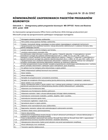 Załącznik Nr 1B do SIWZ RÓWNOWAŻNOŚĆ ZAOFEROWANCH PAKIETÓW PROGRAMÓW BIUROWYCH Odnośnik 1 : Zintegrowany pakiet programów biurowych MS OFFICE Home and Busines 2010 polski OEM Za równoważne oprogramowaniu Office Home and Busines 2010, którego producentem jest Microsoft uznaje się oprogramowanie spełniające następujące wymagania: 1. Wymagania odnośnie interfejsu użytkownika: 1.1. Pełna polska wersja językowa interfejsu użytkownika. 1.2. 2. 2.1. 2.2. 2.3 2.4. 3. 4. Prostota i intuicyjność obsługi, pozwalająca na pracę osobom nieposiadającym umiejętności technicznych. Oprogramowanie musi umożliwiać tworzenie i edycję dokumentów elektronicznych w ustalonym formacie, który spełnia następujące warunki: posiada kompletny i publicznie dostępny opis formatu, umożliwia wykorzystanie schematów XML, ma zdefiniowany układ informacji w postaci XML zgodnie z Tabelą B1 załącznika 2 rozporządzenia w sprawie minimalnych wymagań dla systemów teleinformatycznych (Dz.U. z 2005r. Nr 212, poz.1766 z późn. zm.), obsługuje w ramach standardu formatu podpis elektroniczny zgodnie z Tabelą A.1.1 załącznika 2 rozporządzenia w sprawie minimalnych wymagań dla systemów teleinformatycznych (Dz.U. z 2005r. Nr 212, poz.1766 z późn. zm.). Oprogramowanie musi umożliwiać dostosowanie dokumentów i szablonów do potrzeb instytucji oraz udostępniać narzędzia umożliwiające dystrybucję odpowiednich szablonów do właściwych odbiorców. W skład oprogramowania muszą wchodzić narzędzia programistyczne umożliwiające automatyzację pracy i wymianę danych pomiędzy dokumentami i aplikacjami (język makropoleceń, język skryptowy). 5. Do aplikacji musi być dostępna pełna dokumentacja w języku polskim. 6. Pakiet zintegrowanych aplikacji biurowych musi zawierać: 6.1. Edytor tekstów, 6.2. Arkusz kalkulacyjny, 6.3. Narzędzie do przygotowywania i prowadzenia prezentacji, 6.4. Narzędzie do zarządzania informacją prywatną (pocztą elektroniczną, kalendarzem, kontaktami i zadaniami). 7. 7.1. Edytor tekstów musi umożliwiać: Edycję i formatowanie tekstu w języku polskim wraz z obsługą języka polskiego w zakresie sprawdzania pisowni i poprawności gramatycznej oraz funkcjonalnością słownika wyrazów bliskoznacznych i autokorekty, 7.2. Wstawianie oraz formatowanie tabel, 7.3. Wstawianie oraz formatowanie obiektów graficznych, 7.4. Wstawianie wykresów i tabel z arkusza kalkulacyjnego (wliczając tabele przestawne), 7.5. Automatyczne numerowanie rozdziałów, punktów, akapitów, tabel i rysunków, 7.6. Automatyczne tworzenie spisów treści, 7.7 Formatowanie nagłówków i stopek stron, 7.8. Sprawdzanie pisowni w języku polskim, 7.9. Śledzenie zmian wprowadzonych przez użytkowników, 7.10. Nagrywanie, tworzenie i edycję makr automatyzujących wykonywanie czynności, 7.11. Określenie układu strony (pionowa/pozioma), 7.12. 7.13. 7.14. Wydruk dokumentów, Wykonywanie korespondencji seryjnej bazując na danych adresowych pochodzących z arkusza kalkulacyjnego i z narzędzia do zarządzania informacją prywatną, Pracę na dokumentach utworzonych przy pomocy Microsoft Word 2003 lub Microsoft Word 2007 z zapewnieniem bezproblemowej konwersji wszystkich elementów i atrybutów dokumentu, 7.15. Zabezpieczenie dokumentów hasłem przed odczytem oraz przed wprowadzaniem modyfikacji, 8. Arkusz kalkulacyjny musi umożliwiać: 8.1. Tworzenie raportów tabelarycznych, 8.2. 8.3. 8.4. 8.5. 8.6. Tworzenie wykresów liniowych (wraz z linią trendu), słupkowych, kołowych, Tworzenie arkuszy kalkulacyjnych zawierających teksty, dane liczbowe oraz formuły przeprowadzające operacje matematyczne, logiczne, tekstowe, statystyczne oraz operacje na danych finansowych i na miarach czasu, Tworzenie raportów z zewnętrznych źródeł danych (inne arkusze kalkulacyjne, bazy danych zgodne z ODBC, pliki tekstowe, pliki XML, webservice), Obsługę kostek OLAP oraz tworzenie i edycję kwerend bazodanowych i webowych. Narzędzia wspomagające analizę statystyczną i finansową, analizę wariantową i rozwiązywanie problemów optymalizacyjnych, Tworzenie raportów tabeli przestawnych umożliwiających dynamiczną zmianę wymiarów oraz wykresów bazujących na danych z tabeli przestawnych, 8.7. Wyszukiwanie i zamianę danych, 8.8. Wykonywanie analiz danych przy użyciu formatowania warunkowego, 8.9. Nazywanie komórek arkusza i odwoływanie się w formułach po takiej nazwie, 8.10. Nagrywanie, tworzenie i edycję makr automatyzujących wykonywanie czynności, 8.11. Formatowanie czasu, daty i wartości finansowych z polskim formatem, 8.12. 8.13. Zapis wielu arkuszy kalkulacyjnych w jednym pliku, Zachowanie pełnej zgodności z formatami plików utworzonych za pomocą oprogramowania Microsoft Excel 2003 oraz Microsoft Excel 2007, z uwzględnieniem poprawnej realizacji użytych w nich funkcji specjalnych i makropoleceń, 8.14. Zabezpieczenie dokumentów hasłem przed odczytem oraz przed wprowadzaniem modyfikacji. 9. Narzędzie do przygotowywania i prowadzenia prezentacji musi umożliwiać: 9.1. Przygotowywanie prezentacji multimedialnych, które będą: 9.2. Prezentowane przy użyciu projektora multimedialnego, 9.3. Drukowane w formacie umożliwiającym robienie notatek, 9.4. Zapisane jako prezentacja tylko do odczytu, 9.5. Nagrywanie narracji i dołączanie jej do prezentacji, 9.6. Opatrywanie slajdów notatkami dla prezentera, 9.7. Umieszczanie i formatowanie tekstów, obiektów graficznych, tabel, nagrań dźwiękowych i wideo, 9.8. Umieszczanie tabel i wykresów pochodzących z arkusza kalkulacyjnego, 9.9. Odświeżenie wykresu znajdującego się w prezentacji po zmianie danych w źródłowym arkuszu kalkulacyjnym, 9.10. 9.11. 9.12. 10. Możliwość tworzenia animacji obiektów i całych slajdów, Prowadzenie prezentacji w trybie prezentera, gdzie slajdy są widoczne na jednym monitorze lub projektorze, a na drugim widoczne są slajdy i notatki prezentera, Pełna zgodno