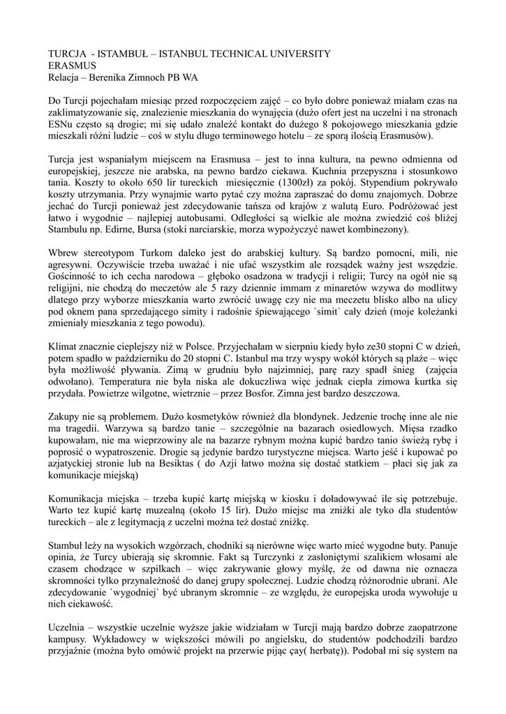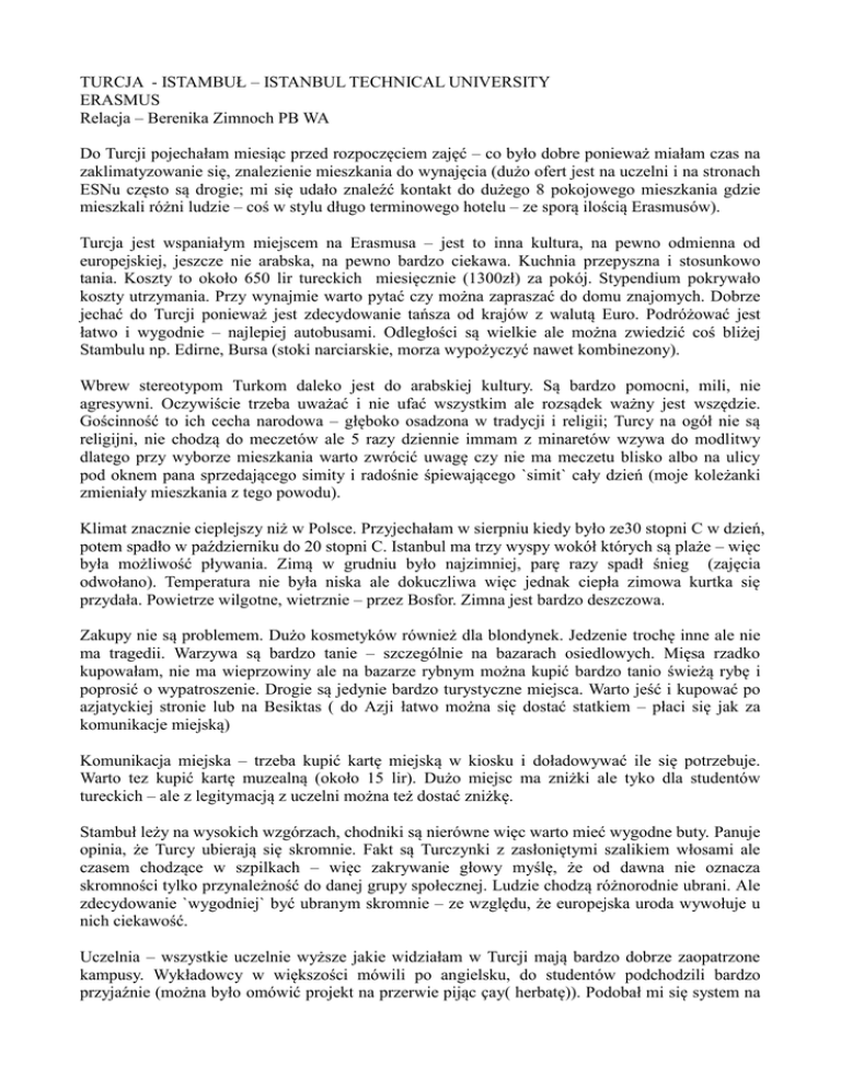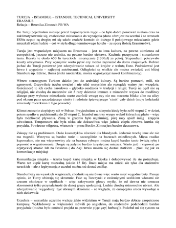 TURCJA - ISTAMBUŁ – ISTANBUL TECHNICAL UNIVERSITY ERASMUS Relacja – Berenika Zimnoch PB WA Do Turcji pojechałam miesiąc przed rozpoczęciem zajęć – co było dobre ponieważ miałam czas na zaklimatyzowanie się, znalezienie mieszkania do wynajęcia (dużo ofert jest na uczelni i na stronach ESNu często są drogie; mi się udało znaleźć kontakt do dużego 8 pokojowego mieszkania gdzie mieszkali różni ludzie – coś w stylu długo terminowego hotelu – ze sporą ilością Erasmusów). Turcja jest wspaniałym miejscem na Erasmusa – jest to inna kultura, na pewno odmienna od europejskiej, jeszcze nie arabska, na pewno bardzo ciekawa. Kuchnia przepyszna i stosunkowo tania. Koszty to około 650 lir tureckich miesięcznie (1300zł) za pokój. Stypendium pokrywało koszty utrzymania. Przy wynajmie warto pytać czy można zapraszać do domu znajomych. Dobrze jechać do Turcji ponieważ jest zdecydowanie tańsza od krajów z walutą Euro. Podróżować jest łatwo i wygodnie – najlepiej autobusami. Odległości są wielkie ale można zwiedzić coś bliżej Stambulu np. Edirne, Bursa (stoki narciarskie, morza wypożyczyć nawet kombinezony). Wbrew stereotypom Turkom daleko jest do arabskiej kultury. Są bardzo pomocni, mili, nie agresywni. Oczywiście trzeba uważać i nie ufać wszystkim ale rozsądek ważny jest wszędzie. Gościnność to ich cecha narodowa – głęboko osadzona w tradycji i religii; Turcy na ogół nie są religijni, nie chodzą do meczetów ale 5 razy dziennie immam z minaretów wzywa do modlitwy dlatego przy wyborze mieszkania warto zwrócić uwagę czy nie ma meczetu blisko albo na ulicy pod oknem pana sprzedającego simity i radośnie śpiewającego `simit` cały dzień (moje koleżanki zmieniały mieszkania z tego powodu). Klimat znacznie cieplejszy niż w Polsce. Przyjechałam w sierpniu kiedy było ze30 stopni C w dzień, potem spadło w październiku do 20 stopni C. Istanbul ma trzy wyspy wokół których są plaże – więc była możliwość pływania. Zimą w grudniu było najzimniej, parę razy spadł śnieg (zajęcia odwołano). Temperatura nie była niska ale dokuczliwa więc jednak ciepła zimowa kurtka się przydała. Powietrze wilgotne, wietrznie – przez Bosfor. Zimna jest bardzo deszczowa. Zakupy nie są problemem. Dużo kosmetyków również dla blondynek. Jedzenie trochę inne ale nie ma tragedii. Warzywa są bardzo tanie – szczególnie na bazarach osiedlowych. Mięsa rzadko kupowałam, nie ma wieprzowiny ale na bazarze rybnym można kupić bardzo tanio świeżą rybę i poprosić o wypatroszenie. Drogie są jedynie bardzo turystyczne miejsca. Warto jeść i kupować po azjatyckiej stronie lub na Besiktas ( do Azji łatwo można się dostać statkiem – płaci się jak za komunikacje miejską) Komunikacja miejska – trzeba kupić kartę miejską w kiosku i doładowywać ile się potrzebuje. Warto tez kupić kartę muzealną (około 15 lir). Dużo miejsc ma zniżki ale tyko dla studentów tureckich – ale z legitymacją z uczelni można też dostać zniżkę. Stambuł leży na wysokich wzgórzach, chodniki są nierówne więc warto mieć wygodne buty. Panuje opinia, że Turcy ubierają się skromnie. Fakt są Turczynki z zasłoniętymi szalikiem włosami ale czasem chodzące w szpilkach – więc zakrywanie głowy myślę, że od dawna nie oznacza skromności tylko przynależność do danej grupy społecznej. Ludzie chodzą różnorodnie ubrani. Ale zdecydowanie `wygodniej` być ubranym skromnie – ze względu, że europejska uroda wywołuje u nich ciekawość. Uczelnia – wszystkie uczelnie wyższe jakie widziałam w Turcji mają bardzo dobrze zaopatrzone kampusy. Wykładowcy w większości mówili po angielsku, do studentów podchodzili bardzo przyjaźnie (można było omówić projekt na przerwie pijąc çay( herbatę)). Podobał mi się system na uczelni – wszystkie przedmioty były wykładane w angielskim i tureckim, więc nie było trudności z wyborem (warto przed wyborem porozmawiać z wykładowcami ponieważ rzadko nazwa przedmiotu pokrywała się z tym co ja oczekiwałam) zajęcia są prowadzone w równych formach, dużo zajęć ma charakter dyskusyjny. Dużo materiałów trzeba przygotowywać. Super są zajęcia z plenerowymi wycieczkami (wzięłam Acustic design; na Remappng Istanbul było dużo pracy). Ciekawe podejście było do projektowania na projektowych zajęciach – bardzo pomocni, nie ograniczający są wykładowcy, dużo analiz. Ważne by pilnować swoich papierów na uczelni – odczuwalna jest w Turcji jednak luźna atmosfera jak w krajach południowych – nie przejmują się terminami; Większość dokumentów wysyłać musieliśmy sami (poczta turecka PTT ale koperty i znaczki trzeba kupić gdzieś indziej). Obiady a stołówce na wydziale to tylko 2 liry. Można się najeść, czasem smaki tureckie wydają się dziwne w kuchni domowej ale ogólnie zjadliwe. Domowa kuchnia turecka myślę, że Polakom średnio może przypaść do gustu (bezsmakowa) ale warto znaleźć sobie znajomego Turka który by zaprosił na obiad do siebie by zobaczyć jak oni mieszkają. Jedzenie tureckie dostępne w barach i na ulicach jest bardzo smaczne. Nie można pić wody z kranu. Ale wszędzie są firmy sprzedające wodę w dużych baniakach. Trzeba uważać na fałszywe organizacje erasmusowe których jest mnóstwo – ale ESN ostrzega przed tym. ESN wysyła listę mentorów – można sobie wybrać; czasem zabierają cię na mała wycieczkę po wydziale i po Stambule; Niestety poprzez fałszywe erasmusowe organizacje dużo studentów jest rozproszona. Dużo jest organizowanych wycieczek (głównie do Pumakale i Capadoci) i imprez (w Eski Beyrut, Araf, Beat czy KafePi (Street Party). Nie można ufać taksówkarzom; ale lepiej brać taksówkę do domu, nigdy nie wracać pieszo. Ale wybierać taksówki z licznikiem i nie być miłym (w Turcji uśmiech czasem jest brany za podryw – różnice kulturowe; ale zauważył
