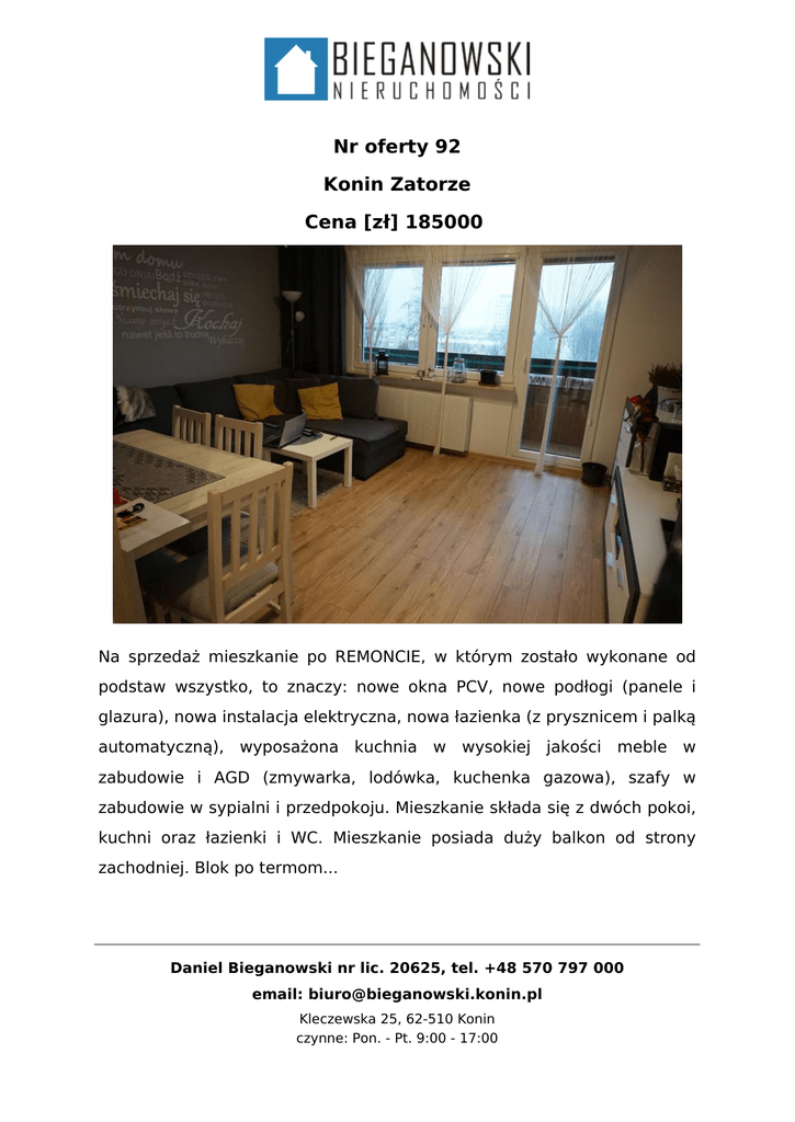 Nr oferty 92 Konin Zatorze Cena [zł] 185000 Wysoki standard Zatorze