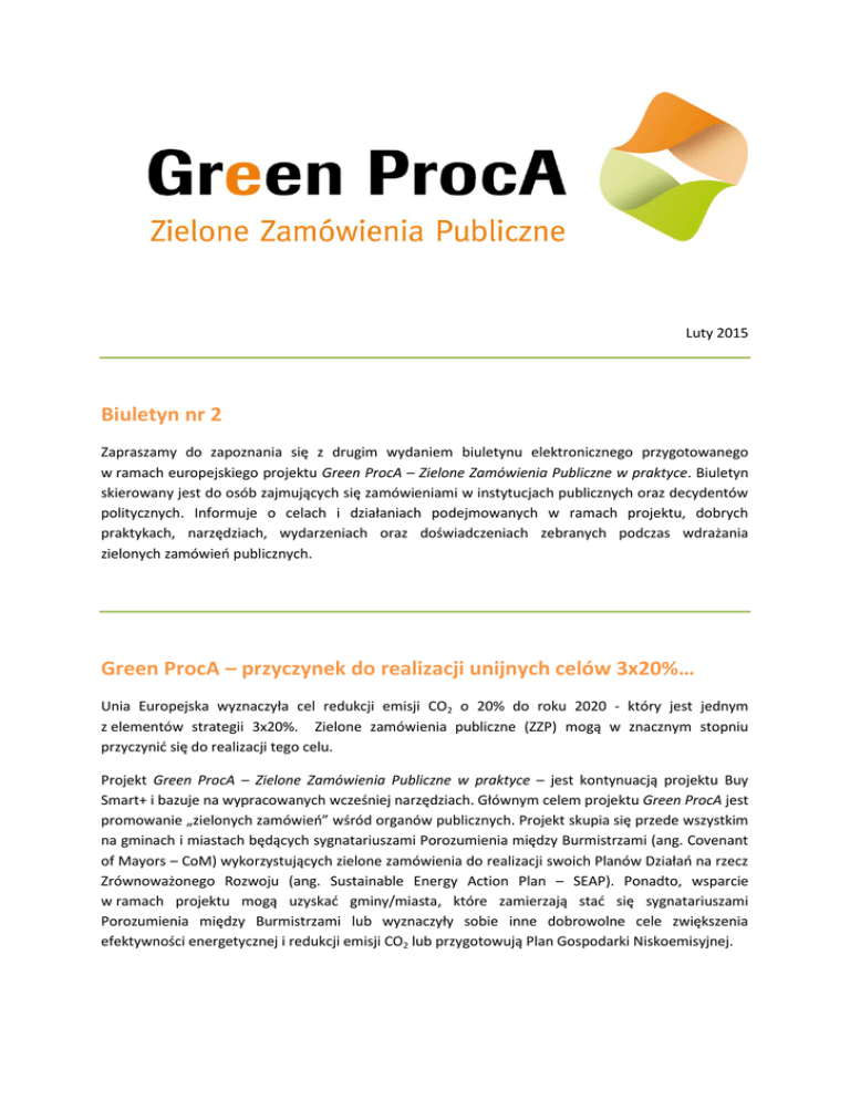 Luty 2015 Biuletyn nr 2 Zapraszamy do zapoznania się z drugim wydaniem biuletynu elektronicznego przygotowanego w ramach europejskiego projektu Green ProcA – Zielone Zamówienia Publiczne w praktyce. Biuletyn skierowany jest do osób zajmujących się zamówieniami w instytucjach publicznych oraz decydentów politycznych. Informuje o celach i działaniach podejmowanych w ramach projektu, dobrych praktykach, narzędziach, wydarzeniach oraz doświadczeniach zebranych podczas wdrażania zielonych zamówień publicznych. Green ProcA – przyczynek do realizacji unijnych celów 3x20%… Unia Europejska wyznaczyła cel redukcji emisji CO2 o 20% do roku 2020 - który jest jednym z elementów strategii 3x20%. Zielone zamówienia publiczne (ZZP) mogą w znacznym stopniu przyczynić się do realizacji tego celu. Projekt Green ProcA – Zielone Zamówienia Publiczne w praktyce – jest kontynuacją projektu Buy Smart+ i bazuje na wypracowanych wcześniej narzędziach. Głównym celem projektu Green ProcA jest promowanie „zielonych zamówień” wśród organów publicznych. Projekt skupia się przede wszystkim na gminach i miastach będących sygnatariuszami Porozumienia między Burmistrzami (ang. Covenant of Mayors – CoM) wykorzystujących zielone zamówienia do realizacji swoich Planów Działań na rzecz Zrównoważonego Rozwoju (ang. Sustainable Energy Action Plan – SEAP). Ponadto, wsparcie w ramach projektu mogą uzyskać gminy/miasta, które zamierzają stać się sygnatariuszami Porozumienia między Burmistrzami lub wyznaczyły sobie inne dobrowolne cele zwiększenia efektywności energetycznej i redukcji emisji CO2 lub przygotowują Plan Gospodarki Niskoemisyjnej. W ramach projektu oferujemy: Informację dla nabywców Na stronie internetowej projektu www.gpp-proca.eu znajdują się informacje i narzędzia pomocne osobom przeprowadzającym zamówienia publiczne: • • • • • informacje na temat Zielonych Zamówień Publicznych wraz z instrukcją ich stosowania „krok po kroku” informacje jak wdrażać ZZP w ramach Planów Działań na rzecz Zrównoważonej Energii w gminach będących sygnatariuszami Porozumienia między Burmistrzami przykłady wzorcowych zamówień oraz najlepszych praktyk informacje na temat wydarzeń i bezpłatnych szkoleń na temat ZZP ciekawe europejskie i krajowe wydarzenia dotyczące ZZP i Porozumienia między Burmistrzami Bezpłatne konsultacje i szkolenia Jeśli chcą Państwo poszerzyć swoją wiedzę na temat zielonych zamówień publicznych oraz kryteriów środowiskowych i tych związanych z energią lub chcieliby Państwo przeprowadzić pierwsze zielone zamówienie wykorzystując narzędzia opracowane w ramach projektu Buy Smart+ proponujemy skorzystanie z: • bezpłatnych szkoleń • konsultacji • wsparcia przy przygotowywaniu projektu wzorcowego. Krajowe punkty kontaktowe Projekt Green ProcA jest wdrażany przez partnerów z siedmiu krajów europejskich. Celem projektu jest promowanie, wdrażanie i dalszy rozwój narzędzi pomocnych przy realizowaniu zielonych zamówień publicznych w Bułgarii, Niemczech, Polsce, Rumunii, Słowacji, Węgrzech i Włoszech. Krajowy i międzynarodowy konkurs Spośród nadesłanych propozycji zostanie wyłoniony zwycięzca, który zostanie wyróżniony krajową nagrodą za najlepsze zielone zamówienie publiczne i weźmie udział w europejskim wydaniu konkursu. Więcej informacji o projekcie, również w języku polskim, można znaleźć na stronie: www.gpp-proca.eu Aktualności 09. lutego 2015 Nowe przykłady dobrych praktyk Urząd Zamówień Publicznych w ostatnich dniach opublikował nowe przykłady dobrych praktyk zrównoważonych zamówień publicznych. Dotyczą one zamówienia na roboty budowlane dotyczące montażu oświetlenia solarnego drogowego oraz zamówienia na usługi dotyczące termomodernizacji obiektów użyteczności publicznej z terenu gminy - sporządzenie audytów energetycznych dla budynków. Materiały do pobrania na: uzp.gov.pl/cmsws/page/?D;2876 31. stycznia 2015 Odbyły się już pierwsze szkolenia 29 stycznia 2015 r. w Kwidzynie i 30 stycznia 2015 r. w Tczewie Bałtycka Agencja Poszanowania Energii przeprowadziła szkolenia na temat zielonych zamówień publicznych w budownictwie i oświetleniu. Gminy i powiaty zainteresowane poszerzeniem wiedzy swoich pracowników na temat zielonych zamówień publicznych, kryteriów środowiskowych i związanych z energią lub chcieliby Państwo przeprowadzić zielone zamówienie zachęcamy do kontaktu z nami ([email protected]). Postaramy się dostosować tematykę, miejsce i termin szkoleń do zgłaszanych potrzeb. 20. stycznia 2015 Nowe unijne kryteria Zielonych Zamówień Publicznych dotyczące ogrzewaczy wodnych – dostępne w języku polskim W dokumencie przedstawiono kryteria UE dotyczące zielonych zamówień publicznych zalecane w odniesieniu do ogrzewaczy wodnych o maksymalnej mocy 400 kW. Grupa ta obejmuje produkty, które są wykorzystywane w celu wytwarzania ciepła w ramach wodnego systemu centralnego ogrzewania, gdzie podgrzana woda jest rozprowadzana za pomocą pomp cyrkulacyjnych i promienników ciepła w celu uzyskania i utrzymania temperatury wewnętrznej w przestrzeni zamkniętej, takiej jak budynek, mieszkanie lub pomieszczenie, na wymaganym poziomie. Z kolei w zakres tej grupy produktów nie wchodzą m.in. ogrzewacze, których podstawową funkcją jest zapewnianie ciepłej wody użytkowej. Więcej informacji: ec.europa.eu/environment/gpp/pdf/criteria/water_based/heaters_pl.pdf 12. stycznia 2015 Już ponad 100 przykładów dobrych praktyk zielonych zamówień publicznych Zachęcamy do zapoznania się z przykładami dobrych praktyk dostępnych na stronie ec.europa.eu/environment/gpp/case_group_en.htm. Można tu znaleźć cenne informacje na temat kryteriów środowiskowych, specyfikacji technicznych czy kryteriów udzielania zamówienia stosowanych przez różne instytucje publiczne w podziale na różne grupy produktowe. K