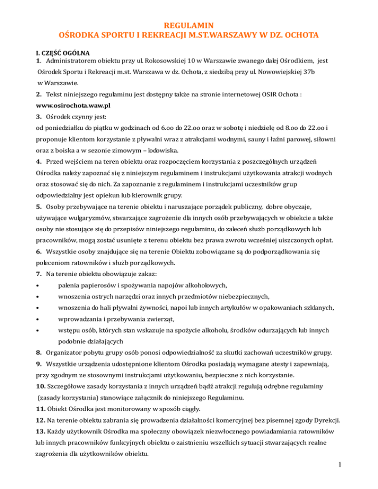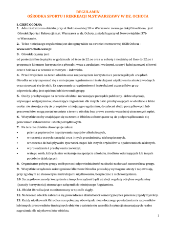 REGULAMIN OŚRODKA SPORTU I REKREACJI M.ST.WARSZAWY W DZ. OCHOTA I. CZĘŚĆ OGÓLNA 1. Administratorem obiektu przy ul. Rokosowskiej 10 w Warszawie zwanego dalej Ośrodkiem, jest Ośrodek Sportu i Rekreacji m.st. Warszawa w dz. Ochota, z siedzibą przy ul. Nowowiejskiej 37b w Warszawie. 2. Tekst niniejszego regulaminu jest dostępny także na stronie internetowej OSIR Ochota : www.osirochota.waw.pl 3. Ośrodek czynny jest: od poniedziałku do piątku w godzinach od 6.oo do 22.oo oraz w sobotę i niedzielę od 8.oo do 22.oo i proponuje klientom korzystanie z pływalni wraz z atrakcjami wodnymi, sauny i łaźni parowej, siłowni oraz z boiska a w sezonie zimowym – lodowiska. 4. Przed wejściem na teren obiektu oraz rozpoczęciem korzystania z poszczególnych urządzeń Ośrodka należy zapoznać się z niniejszym regulaminem i instrukcjami użytkowania atrakcji wodnych oraz stosować się do nich. Za zapoznanie z regulaminem i instrukcjami uczestników grup odpowiedzialny jest opiekun lub kierownik grupy. 5. Osoby przebywające na terenie obiektu i naruszające porządek publiczny, dobre obyczaje, używające wulgaryzmów, stwarzające zagrożenie dla innych osób przebywających w obiekcie a także osoby nie stosujące się do przepisów niniejszego regulaminu, do zaleceń służb porządkowych lub pracowników, mogą zostać usunięte z terenu obiektu bez prawa zwrotu wcześniej uiszczonych opłat. 6. Wszystkie osoby znajdujące się na terenie Obiektu zobowiązane są do podporządkowania się poleceniom ratowników i służb porządkowych. 7. Na terenie obiektu obowiązuje zakaz: • palenia papierosów i spożywania napojów alkoholowych, • wnoszenia ostrych narzędzi oraz innych przedmiotów niebezpiecznych, • wnoszenia do hali pływalni żywności, napoi lub innych artykułów w opakowaniach szklanych, • wprowadzania i przebywania zwierząt, • wstępu osób, których stan wskazuje na spożycie alkoholu, środków odurzających lub innych podobnie działających 8. Organizator pobytu grupy osób ponosi odpowiedzialność za skutki zachowań uczestników grupy. 9. Wszystkie urządzenia udostępnione klientom Ośrodka posiadają wymagane atesty i zapewniają, przy zgodnym ze stosownymi instrukcjami użytkowaniu, bezpieczne z nich korzystanie. 10. Szczegółowe zasady korzystania z innych urządzeń bądź atrakcji regulują odrębne regulaminy (zasady korzystania) stanowiące załącznik do niniejszego Regulaminu. 11. Obiekt Ośrodka jest monitorowany w sposób ciągły. 12. Na terenie obiektu zabrania się prowadzenia działalności komercyjnej bez pisemnej zgody Dyrekcji. 13. Każdy użytkownik Ośrodka ma społeczny obowiązek niezwłocznego powiadamiania ratowników lub innych pracowników funkcyjnych obiektu o zaistnieniu wszelkich sytuacji stwarzających realne zagrożenia dla użytkowników obiektu. 1 14. Każda osoba zamierzająca korzystać z obiektu Ośrodka może uzyskać informację o zakresie usług świadczonych w danym czasie w obiekcie bądź występujących w tej mierze ograniczeń, zaś decyzję, co do korzystania z obiektu podejmuje na własne ryzyko. II. ZASADY KORZYSTANIA Z HALI PŁYWALNI. 1. Przed wejściem na teren hali pływalni oraz rozpoczęciem korzystania z poszczególnych urządzeń Ośrodka, należy zapoznać się z niniejszym regulaminem oraz instrukcjami użytkowania zjeżdżalni i atrakcji wodnych i bezwzględnie stosować się do nich w czasie pobytu. 2. Klienci indywidualni i w grupach zorganizowanych mają prawo wstępu na nieckę pływalni (do sauny) na podstawie wykupionego biletu (karnetu). Wykupienie biletu (karnetu) jest równoznaczne z akceptacją regulaminu. 3. Osoby przebywające na terenie hali pływalni i naruszające porządek publiczny, dobre obyczaje, używające wulgaryzmów a także osoby stwarzające zagrożenie dla innych użytkowników, nie stosujące się do przepisów niniejszego regulaminu, do zaleceń ratowników lub pracowników, mogą zostać usunięte z hali pływalni bez prawa do zwrotu wcześniej uiszczonych opłat. 4. Grupy zorganizowane (pływające lub uczestniczące w zajęciach specjalistycznych) nie mogą liczyć więcej niż 15 uczestników na jedną osobę opiekującą się lub prowadzącą zajęcia. Osoba taka jest odpowiedzialna za podopiecznych przez cały czas pobytu na terenie obiektu. 5. Opiekunowie grup zobowiązani są do przebywania w hali pływalni w klapkach, stroju kąpielowym lub podkoszulku i krótkich spodenkach. 6. Opiekun grupy, po wejściu do hali basenowej, zobowiązany jest skontaktować się z ratownikiem ze stanowiska nr 1 celem ustalenia zasad korzystania z hali basenowej przez grupę. 7. Zajęcia nauki i doskonalenia pływania mogą odbywać się tylko w obecności i pod nadzorem osób posiadających stosowne uprawnienia oraz zgodę Dyrekcji Ośrodka. 8. Zajęcia specjalistyczne mogą się odbywać tylko w obecności instruktorów odpowiedniej specjalności i ratowników, a w przypadku grup szkolnych - dodatkowo opiekunów grup szkolnych, w ilości nie mniejszej niż jeden opiekun na 15 uczestników zajęć. 9. Zajęcia grupowe odbywają się według ściśle określonego harmonogramu dostępnego w KASIE. 10. Osoby korzystające z pływalni zobowiązane są do posiadania: czystego stroju kąpielowego zgodnego z wytycznymi umieszczonymi na piktogramach przy wejściu do obiektu (dla kobiet- jedno lub dwuczęściowy, dla mężczyzn – elastyczne, przylegające do ciała kąpielówki lub slipki o dowolnej długości nogawek bez kieszeni i metalowych elementów, czepka na głowę, zmienionego na terenie pływalni obuwia typu kąpielowego, np.: klapki. 12. Dzieci noszące pieluchy powinny mieć założone jednorazowe pieluchy przeznaczone do kąpieli. 13. Każdy użytkownik zobowiązany jest przed wejściem do hali pływalni do skorzystania z prysznica celem umycia całego ciała. 14. Przy korzystaniu z atrakcji wodnych (leżanki wodne i wanna z hydromasażem) należy bezwzględnie 2 pr