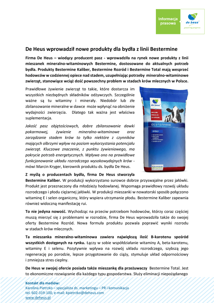 De Heus wprowadził nowe produkty dla bydła z linii Bestermine Firma De Heus – wiodący producent pasz - wprowadziła na rynek nowe produkty z linii mieszanek mineralno-witaminowych Bestermine, dostosowane do aktualnych potrzeb bydła. Produkty Bestermine Kaliber, Bestermine Rozród i Bestermine Total mają wesprzeć hodowców w codziennej opiece nad stadem, uzupełniając potrzeby mineralno-witaminowe zwierząt, stanowiące wciąż dość powszechny problem w stadach krów mlecznych w Polsce. Prawidłowe żywienie zwierząt to takie, które dostarcza im wszystkich niezbędnych składników odżywczych. Szczególnie ważne są tu witaminy i minerały. Niedobór lub złe zbilansowanie mineralne w dawce może wpłynąć na obniżenie wydajności zwierzęcia. Dlatego tak ważna jest właściwa suplementacja. Jakość pasz objętościowych, dobre zbilansowanie dawki pokarmowej, żywienie mineralno-witaminowe oraz zarządzanie stadem krów to tylko niektóre z czynników mających olbrzymi wpływ na poziom wykorzystania potencjału zwierząt. Kluczowe znaczenie, z punktu żywieniowego, ma pokrycie potrzeb energetycznych. Wpływa ono na prawidłowe funkcjonowanie układu rozrodczego wysokowydajnych krów mówi Marcin Kryger, kierownik produktu ds. bydła De Heus. Z myślą o producentach bydła, firma De Heus stworzyła Bestermine Kaliber. W produkcji wykorzystano surowce dobrze przyswajalne przez jałówki. Produkt jest przeznaczony dla młodzieży hodowlanej. Wspomaga prawidłowy rozwój układu rozrodczego i płodu ciężarnej jałówki. W produkcji mieszanki w nowatorski sposób połączono witaminę E i selen organiczny, który wspiera utrzymanie płodu. Bestermine Kaliber zapewnia również widoczną manifestację rui. To nie jedyna nowość. Wychodząc na przeciw potrzebom hodowców, którzy coraz częściej muszą mierzyć się z problemami w rozrodzie, firma De Heus wprowadziła także do swojej oferty Bestermine Rozród. Nowa formuła produktu pozwala poprawić wyniki rozrodu w stadach krów mlecznych. Ta mieszanka mineralno-witaminowa zawiera największą ilość B-karotenu spośród wszystkich dostępnych na rynku. Łączy w sobie współdziałanie witaminy A, beta-karotenu, witaminy E i selenu. Pozytywnie wpływa na rozwój układu rozrodczego, szybszą jego regenerację po porodzie, lepsze przygotowanie do ciąży, stymuluje układ odpornościowy i zmniejsza stres cieplny. De Heus w swojej ofercie posiada także mieszankę dla przeżuwaczy Bestermine Total. Jest to ekonomiczne rozwiązanie dla każdego typu gospodarstwa. Służy eliminacji niepożądanego Kontakt dla mediów: Karolina Pietrzko – specjalista ds. marketingu – PR i komunikacja tel. 602-319-100, e-mail: [email protected] www.deheus.pl działania potasu w dawkach pokarmowych. Uzupełnia niedobory witaminowe i zapewnia wydajność produkcyjną stada. Nowe produkty z linii Bestermine zostały wyprodukowane z surowców wysokiej jakości wolnych od modyfikacji genetycznych. Priorytetem firmy De Heus jest wsparcie hodowców w utrzymaniu wysokiego stanu zdrowia zwierząt ku zadowoleniu hodowców. Dlatego proces powstawania mieszanek na każdym etapie podlega kontroli zgodnie z zasadami systemu zapewnienia jakości i bezpieczeństwa FAMI-QS. Bestermine Kaliber, Rozród i Total produkowane są w wytwórni premiksów w Łęczycy. To, uruchomiona w 2015 r., najnowocześniejsza fabryka tego typu w Europie. Znajduje się w niej specjalna linia do produkcji mieszanek mineralno-witaminowych dla bydła. Problem niedoborów witamin nie pojawia się z dnia na dzień. Jest konsekwencją długotrwałych błędów żywieniowych oraz źle rozumianych oszczędności. Stworzyliśmy Bestermine, by dać hodowcom skuteczne rozwiązanie do walki z tym problemem. Mieszanki mineralnowitaminowe produkujemy w naszej wytwórni premiksów w Łęczycy, zapewniającej precyzyjne dawkowanie oraz wysokiej jakości mieszanki – mówi Marcin Kryger. Zaawansowana technologia połączona z wieloletnim doświadczeniem i wiedzą pozwala firmie De Heus produkować pasze oraz dodatki mineralno-witaminowe, odpowiadające wymaganiom najbardziej wydajnych stad. Wytwórnie premiksów i paszy De Heus w Łęczycy Kontakt dla mediów: Karolina Pietrzko – specjalista ds. marketingu – PR i komunikacja tel. 602-319-100, e-mail: [email protected] www.deheus.pl