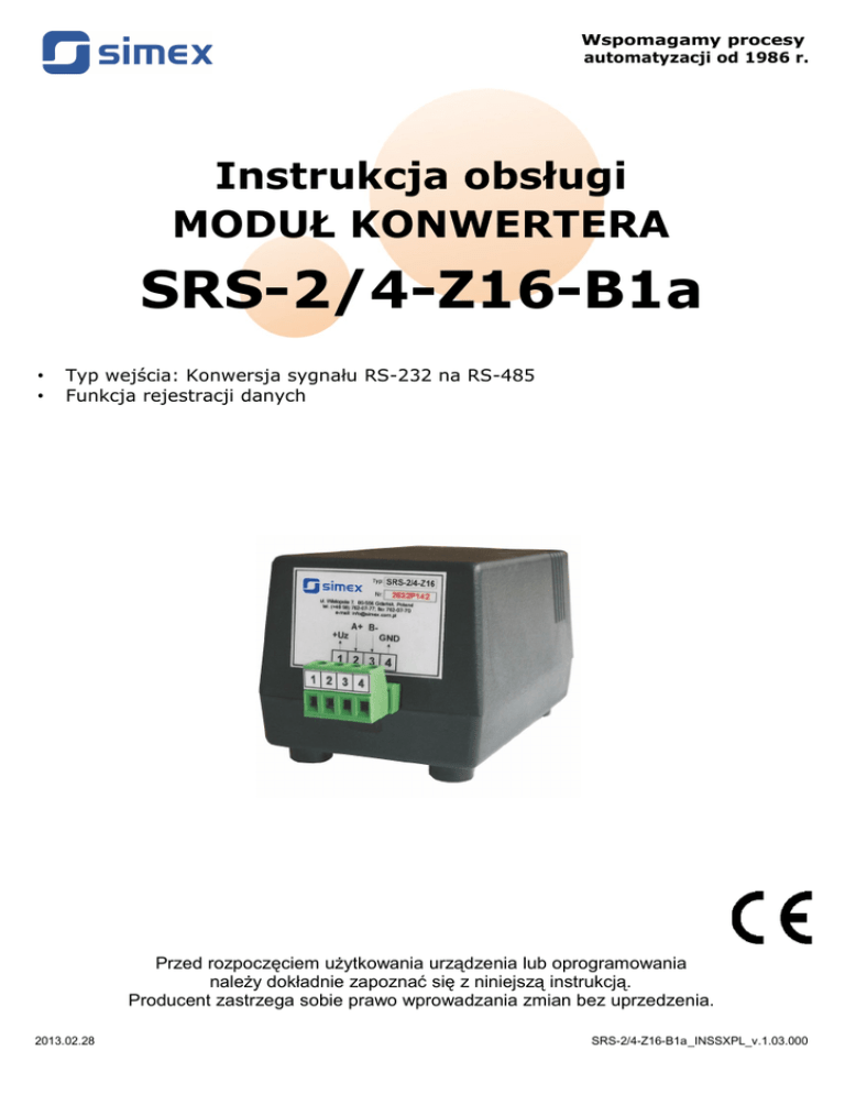 Wspomagamy procesy automatyzacji od 1986 r. Instrukcja obsługi MODUŁ KONWERTERA SRS-2/4-Z16-B1a • • Typ wejścia: Konwersja sygnału RS-232 na RS-485 Funkcja rejestracji danych Przed rozpoczęciem użytkowania urządzenia lub oprogramowania należy dokładnie zapoznać się z niniejszą instrukcją. Producent zastrzega sobie prawo wprowadzania zmian bez uprzedzenia. 2013.02.28 SRS-2/4-Z16-B1a_INSSXPL_v.1.03.000 Instrukcja obsługi - MODUŁ KONWERTERA SRS-2/4-Z16-B1a SPIS TREŚCI 1. PODSTAWOWE WYMAGANIA I BEZPIECZEŃSTWO UŻYTKOWANIA.................................................3 2. CHARAKTERYSTYKA................................................................................................................................4 3. DANE TECHNICZNE...................................................................................................................................5 4. INSTALACJA URZĄDZENIA......................................................................................................................6 4.1. ROZPAKOWANIE...............................................................................................................................6 4.2. SPOSÓB PODŁĄCZENIA...................................................................................................................7 4.3. KONSERWACJA..............................................................................................................................10 Znaczenie symboli używanych w instrukcji: ! - symbol ten zwraca uwagę na szczególnie istotne wskazówki dotyczące instalacji oraz obsługi urządzenia. Nie stosowanie się do uwag oznaczonych tym symbolem może być przyczyną wypadku, uszkodzenia lub zniszczenia urządzenia. W PRZYPADKU UŻYTKOWANIA URZĄDZENIA NIEZGODNIE Z INSTRUKCJĄ ODPOWIEDZIALNOŚĆ ZA POWSTAŁE SZKODY PONOSI UŻYTKOWNIK i 2 - symbol ten zwraca uwagę na szczególnie istotne opisy dotyczące właściwości urządzenia. Zalecane jest dokładne zapoznanie się z uwagami oznaczonymi tym symbolem. Instrukcja obsługi - MODUŁ KONWERTERA SRS-2/4-Z16-B1a 1. PODSTAWOWE WYMAGANIA I BEZPIECZEŃSTWO UŻYTKOWANIA ! - Producent nie ponosi odpowiedzialności za szkody wynikłe z niewłaściwego zainstalowania, nieutrzymywania we właściwym stanie technicznym oraz użytkowania urządzenia niezgodnie z jego przeznaczeniem. - Instalacja powinna być przeprowadzona przez wykwalifikowany personel posiadający uprawnienia wymagane do instalacji urządzeń elektrycznych. Podczas instalacji należy uwzględnić wszystkie dostępne wymogi ochrony. Na instalatorze spoczywa obowiązek wykonania instalacji zgodnie z niniejszą instrukcją oraz przepisami i normami dotyczącymi bezpieczeństwa i kompatybilności elektromagnetycznej właściwymi dla rodzaju wykonywanej instalacji. - Należy przeprowadzić właściwą konfigurację urządzenia, zgodnie z zastosowaniem. Niewłaściwa konfiguracja może spowodować błędne działanie, prowadzące do uszkodzenia urządzenia lub wypadku. - Jeśli w rezultacie defektu pracy urządzenia istnieje ryzyko poważnego zagrożenia związanego z bezpieczeństwem ludzi oraz mienia należy zastosować dodatkowe, niezależne układy i rozwiązania, które takiemu zagrożeniu zapobiegną. - Urządzenia sąsiadujące i współpracujące powinny spełniać wymagania odpowiednich norm i przepisów dotyczących bezpieczeństwa oraz być wyposażone w odpowiednie filtry przeciwprzepięciowe i przeciwzakłóceniowe. - Nie należy podejmować prób samodzielnego rozbierania, napraw lub modyfikacji urządzenia. Urządzenie nie posiada żadnych elementów, które mogłyby zostać wymienione przez użytkownika. Urządzenia w których stwierdzono usterkę muszą być odłączone i oddane do naprawy w autoryzowanym serwisie. ! - W celu minimalizacji niebezpieczeństwa zapalenia lub udaru elektrycznego, należy zabezpieczyć urządzenie przed opadami atmosferycznymi i nadmierną wilgocią. - Nie używać urządzenia w strefach zagrożonych nadmiernymi wstrząsami, wibracjami, pyłem, wilgocią, korozyjnymi gazami i olejami. - Nie używać urządzenia w środowisku zagrożonym wybuchem. - Nie używać urządzenia w miejscach charakteryzujących się dużymi wahaniami temperatury, narażonych na kondensację pary wodnej lub oblodzenie. - Nie używać urządzenia w miejscach narażonych na bezpośrednie promieniowanie słoneczne. - Należy upewnić się czy temperatura w otoczeniu urządzenia (np. wewnątrz szafy sterowniczej) nie przekracza wartości zalecanych. W takich przypadkach należy wziąć pod uwagę wymuszone chłodzenie urządzenia (np. poprzez wykorzystanie wentylatora). 3 Instrukcja obsługi - MODUŁ KONWERTERA SRS-2/4-Z16-B1a ! Urządzenie przeznaczone jest do pracy w środowisku przemysłowym i nie należy używać go w środowisku mieszkalnym lub podobnym. 2. CHARAKTERYSTYKA Moduł rejestratora SRS-2/4-Z16-B1a jest urządzeniem wielofunkcyjnym, pełniącym rolę: zasilacza systemu czujników pomiarowych (z zasilacza zewnętrznego), konwertera standardu RS232/RS485, separatora galwanicznego obwodów RS232 i RS485, rejestratora danych. SRS-2/4-Z16-B1a jest urządzeniem dwu procesorowym wyposażonym w zegar czasu rzeczywistego podtrzymywanym baterią litową oraz nieulotną pamięć typu flash umożliwiającą rejestrację pomiarów. Podstawowym zastosowaniem urządzenia jest: • połączenie sieci modułów systemu TRS z komputerem PC, wyposażonym w interfejs RS232, • automatyczna rejestracja pomiarów w rejestratorze w czasie, gdy program SimCorder Soft (lub komputer, na którym to oprogramowanie jest uruchomione) jest wyłączony. Rejestrator może być wykorzystany w systemach rejestracyjnych TRS, gdzie współpracuje wyłącznie z programem SimCorder Soft. • • • • Zasilanie Wraz z modułem dostarczany jest zasilacz 12VDC. Wydajność prądowa zewnętrznego zasilacza (typowo 1,25A) pozwala na wykorzystanie go jako źródła zasilania zarówno re