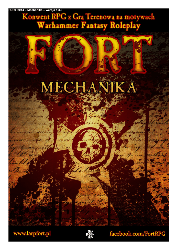 FORT 2014 – Mechanika – wersja 1.3.3 Spis treści Wprowadzenie....................................2 Rasy....................................................3 Ludzie...........................................3 Elfy................................................3 Krasnoludy....................................3 Niziołki (Halflingi)..........................3 Zielonoskórzy................................4 Klasy postaci.......................................4 Awanturnik (6 PD).........................4 Czarownik (6PD)...........................5 Kapłan (6 PD)...............................5 Łotr (6 PD)....................................6 Łowczy (6 PD)..............................6 Obywatel (5 PD)...........................7 Strzelec (7 PD).............................7 Uczony (5 PD)..............................8 Żołnierz (7 PD)..............................8 Wady i umiejętnośći............................9 Wady................................................9 Znamię Chaosu – Mark (1 PD).....9 Asceta (2 PD)...............................9 Brak kończyny (3 PD)...................9 Brak oka (2 PD)............................9 Choroba (1 PD)...........................10 Głupota (6 PD)............................10 Niemagiczność (2 PD)................10 Niemowa (3 PD).........................10 Niewidomy (5 PD).......................10 Poszukiwany (1 PD)...................10 Tchórzostwo (rasowa).................10 Wątła budowa (3 PD)..................10 Umiejętności..................................10 Alchemia.....................................10 Artylerzysta.................................10 Bastion odwagi...........................10 Biurokrata...................................10 Broń palna..................................10 Broń specjalna: bomba...............11 Broń strzelecka...........................11 Chmara.......................................11 Cyrulik.........................................11 Czarotwórstwo............................11 Dowódca.....................................11 Długa prosta................................11 Egzorcyzmy................................11 Szczęście....................................14 Fałszerz......................................11 Szlachetna Krew.........................14 Guślarstwo..................................11 Szybki strzał................................14 Identyfikacja................................11 Szybkie dobywanie.....................15 Inżynier.......................................11 Ślusarz........................................15 Koncentracja...............................11 Tarczownik – puklerz / tarcza / Kowal run....................................11 pawęż.........................................15 Krasnoludzka krzepa..................12 Tkacz wiatrów.............................15 Kryptografia................................12 Torturowanie...............................15 Lepkie ręce.................................12 Tropienie.....................................15 Łowczy........................................12 Twardziel....................................15 Mag miecza................................12 Tworzenie zwojów.......................15 Medium.......................................12 Urodzony w magii.......................15 Medyk.........................................12 Ważenie trucizn..........................15 Mistrz gestów..............................12 Wiedza........................................15 Mistrz run....................................12 Wigor..........................................15 Moc.............................................12 Wola nieumarłych.......................15 Narodzony w dziczy....................12 Wróżenie z run............................15 Objawiona moc...........................12 Wytrzymały.................................16 Oburęczność...............................13 Wytwarzanie strzał......................16 Odporność na choroby...............13 Zapłata we krwi...........................16 Odporność na magię..................13 Zielarstwo...................................16 Ogłuszenie..................................13 Żelazna wola...............................16 Ognia!.........................................13 System Walki....................................16 Padnij – powstań!.......................13 Faza magii.....................................16 Pancerz Wiary............................13 Faza strzelecka..............................17 Piśmienny...................................13 Broń artyleryjska.........................17 Plotka..........................................13 Broń palna..................................17 Płatnerz......................................13 Broń strzelecka...........................17 Pojedynek...................................13 Faza walki......................................17 Pojętność....................................13 Faza kończąca...............................18 Poliglota......................................13 Dołączenie się do walki..............18 Potęga myśli...............................13 Zakończenie walki......................18 Precyzyjny strzał.........................14 Gest bezpieczeństwa – postać Przebijanie..................................14 pokonana....................................18 Psalm..........................................14 Martwe postaci i gest Rdzawe ostrza............................14 skrzyżowanych rąk.....................18 Rzucanie czarów........................14 Zasady dodatkowe.........................19 Słaby punkt.................................14 Amunicja i surowce.....................19 Solidna osłona............................14 Długość broni..............................19 Spadek.......................................14 Tarcze.........................................19 Spryt...........................................14 Nóż na gardle.............................19 