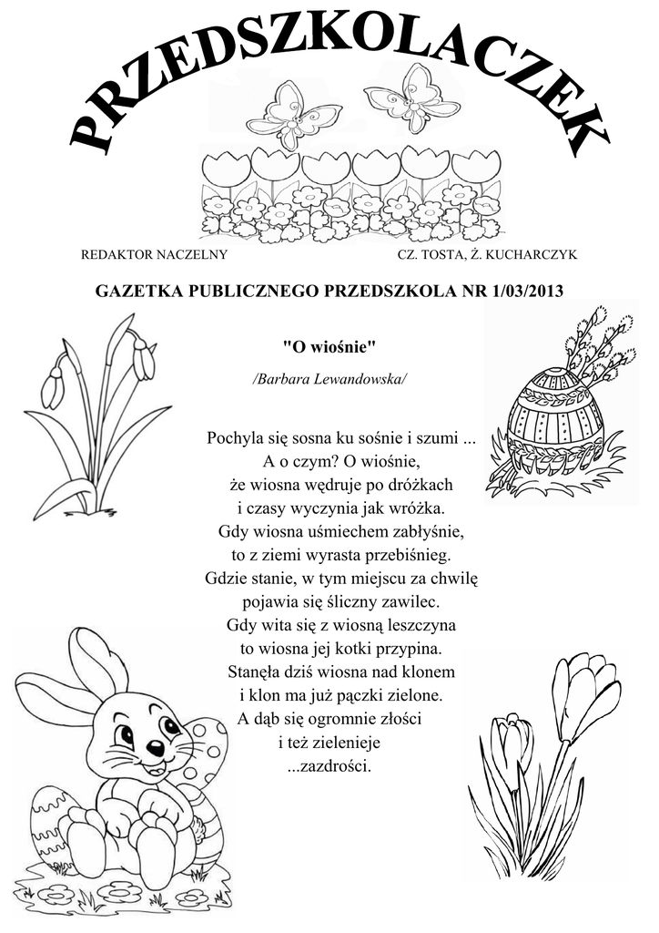 REDAKTOR NACZELNY CZ. TOSTA, ś. KUCHARCZYK GAZETKA PUBLICZNEGO PRZEDSZKOLA NR 1/03/2013 "O wiośnie" /Barbara Lewandowska/ Pochyla się sosna ku sośnie i szumi ... A o czym? O wiośnie, Ŝe wiosna wędruje po dróŜkach i czasy wyczynia jak wróŜka. Gdy wiosna uśmiechem zabłyśnie, to z ziemi wyrasta przebiśnieg. Gdzie stanie, w tym miejscu za chwilę pojawia się śliczny zawilec. Gdy wita się z wiosną leszczyna to wiosna jej kotki przypina. Stanęła dziś wiosna nad klonem i klon ma juŜ pączki zielone. A dąb się ogromnie złości i teŜ zielenieje ...zazdrości. Będzie łatwiej o miejsce w przedszkolu JuŜ od września 2014 roku wszystkie gminy będą miały obowiązek zapewnić miejsce w przedszkolu kaŜdemu czterolatkowi, a od 2016 takŜe trzylatkowi. Oznacza to zagwarantowanie wszystkim dzieciom równego dostępu do przedszkoli. Będzie to moŜliwe dzięki przekazaniu samorządom dotacji celowej na zwiększenie liczby miejsc i poprawę warunków wychowania przedszkolnego oraz zmniejszenie – docelowo do 1 złotówki za dodatkową godzinę – opłat jakie ponoszą rodzice. Na okres od 1 września do 31 grudnia 2013 roku rząd zaplanował na ten cel w budŜecie państwa 320 mln zł. W 2014 roku 1 mld 148 mln, a w następnych latach ponad miliard rocznie. Dotacja nie tylko zrekompensuje samorządom zmiany w systemie opłacania przedszkoli przez rodziców, ale pomoŜe w upowszechnieniu edukacji przedszkolnej. Ustawa reguluje teŜ kwestie rekrutacji do przedszkoli. W okresie przejściowym, czyli do czasu zapewnienia wszystkim dzieciom miejsc w przedszkolu, gmina uchwalając dodatkowe kryteria naboru będzie musiała stosować definicje (np. samotnego rodzica) uŜyte w ustawie o świadczeniach rodzinnych i będzie mogła Ŝądać przedłoŜenia jedynie przewidzianych w niej dokumentów. Wyeliminuje to zgłaszane przez rodziców przypadki, gdy podczas rekrutacji musieli przedłoŜyć np. dane zawarte w kopii deklaracji podatkowej PIT, aktualnym zaświadczeniu ZUS RMUA, lub zaświadczenie o niepełnosprawności Wejście w Ŝycie przepisów przewidywane jest 1 września 2013 roku. źródło: men.gov.pl Zachęcamy rodziców do odwiedzin: • • strony naszego przedszkola, gdzie znajdą państwo aktualne informacje, dokumenty, zdjęcia dzieci, itp. www.pp1.pszow.pl nowej strony - portal informacyjny dla rodziców z powiatu wodzisławskiego www.icodalej.com.pl Z okazji zbliŜającej się Wielkanocy Dyrektor i rada pedagogiczna Ŝyczy spokojnych zdrowych i radosnych Świąt. O zgubnych skutkach niezaspokojenia potrzeby ruchu u dzieci Piękny zimowy dzień. Świeci słońce, kilka stopni poniŜej zera, puszysty śnieg a w parku na spacerze nie ma ani jednego dziecka. Jesienią, gdy mŜy deszcz lub wieje wiatr jest podobnie. Za to zdecydowanie lepiej bywa wiosną i latem. Wówczas spotykamy dzieci trzymane za ręce i spacerujące noga za nogą wraz z rodzicami. Gdy dorośli pozwolą dzieciom na trochę samodzielności zaraz słychać upominanie: Nie biegaj bo się spocisz ...., Nie wchodź na murek bo spadniesz...., Nie przeskakuj przez konar bo upadniesz i rozbijesz sobie głowę..... Spotykamy teŜ dzieci czteroletnie sprawne ruchowo woŜone do przedszkola w wózkach lub wnoszone po schodach na rękach do sal. A przecieŜ wszyscy wiemy , Ŝe sprawność fizyczna jest waŜnym wskaźnikiem prawidłowego rozwoju psychoruchowego dziecka. Wiek przedszkolny to okres wzrastającej sprawności ruchowej, tak zwany złoty wiek motoryczności. Zabiegani i zapracowani rodzice : - cieszą się , gdy ich dziecko długo i spokojnie siedzi przed telewizorem a potem dziwią się , Ŝe róŜni się ono od rówieśników , bo jest mniej sprawne, słabe ( chorowite) i szybko się męczy; - nie stwarzają dziecku okazji do ruchowego wyŜycia się, a potem uskarŜą się, Ŝe jest nadmiernie ruchliwe , nie potrafi spokojnie usiedzieć przez chwilę i przeszkadza wszystkim w domu; - nie dbają o to, aby dziecko realizowało potrzebę ruchu przebywając jak najdłuŜej na powietrzu a potem są zaskoczeni, Ŝe dziecko jest słabe, mało odporne i często choruje. Zgodnie z prawidłowościami rozwoju fizycznego starszych przedszkolaków monotonny nawet dwukilometrowy spacer za rękę jest dla dziecka bardzo męczący. Nie potrafi się ono dostosować do rytmu kroków dorosłego a trzymane stale za tą samą rękę deformuje kręgosłup. Jednocześnie to samo dziecko bez zmęczenia pokonuje drogę zdecydowanie dłuŜszą biegając, przeskakując przez przeszkody, wspinając się na konary, wbiegając na schody itp. Deszcz, wiatr, upał a nawet mróz nie moŜe być przeszkodą w organizowaniu dzieciom pobytu na powietrzu, gdyŜ poprzez udział w zabawach ruchowych, grach zespołowych i zawodach sportowych dzieci nabędą tęŜyzny fizycznej i odporności zdrowotnej. Co kaŜdy przedszkolak powinien umieć idąc do szkoły w zakresie sprawności fizycznej Zgodnie z nową podstawą programową dziecko kończące przedszkole i rozpoczynające naukę w szkole podstawowej : - dba o swoje zdrowie: - jest sprawne fizycznie lub jest sprawne w miarę swoich moŜliwości, jeŜeli jest dzieckiem mniej sprawnym ruchowo; - uczestniczy w zajęciach ruchowych, w zabawach i grach w ogrodzie przedszkolnym, w parku, na boisku, sali gimnastycznej. Oto kilka porad i wskazówek dla rodziców ułatwiających wspólne zabawy z dziećmi . • gimnastyka ma być dla dziecka wesołą i radosną zabawą, • nie naleŜy wydawać poleceń, komenderować, pouczać i ciągle upominać, • wspólne z rodzicami zabawy naśladowcze np. Skaczące piłeczki (podskoki obunóŜ), Wiatr i liście (skłony na boki i wirowanie dookoła siebie), Zabawy kotków (chodzenie na czworakach za piłką, wykonywanie kociego grzbietu), Zanieś misiowi śniadanie ( przenoszenie na tacy drobnych klocków). Tego typu zabawy nie tylko sprzyjają rozwojowi sprawności ruchowej ale takŜe pobudzają wyobraźnię i fantazję. Organizując zabawy ruchowe i ćwicz