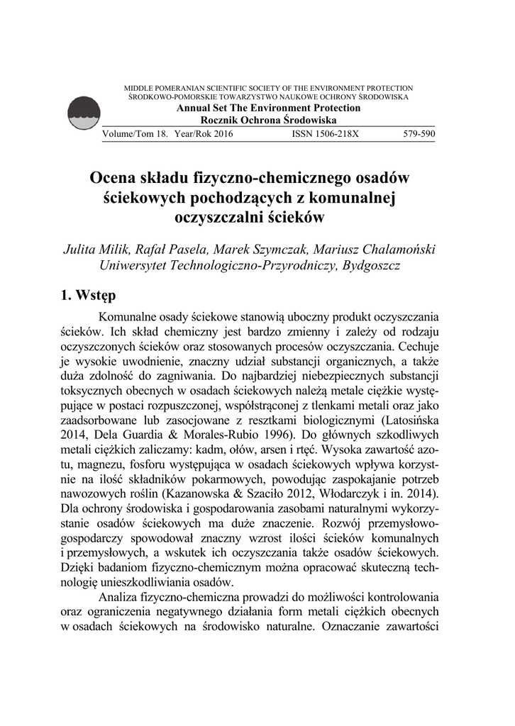 MIDDLE POMERANIAN SCIENTIFIC SOCIETY OF THE ENVIRONMENT PROTECTION ŚRODKOWO-POMORSKIE TOWARZYSTWO NAUKOWE OCHRONY ŚRODOWISKA Annual Set The Environment Protection Rocznik Ochrona Środowiska Volume/Tom 18. Year/Rok 2016 ISSN 1506-218X 579-590 Ocena składu fizyczno-chemicznego osadów ściekowych pochodzących z komunalnej oczyszczalni ścieków Julita Milik, Rafał Pasela, Marek Szymczak, Mariusz Chalamoński Uniwersytet Technologiczno-Przyrodniczy, Bydgoszcz 1. Wstęp Komunalne osady ściekowe stanowią uboczny produkt oczyszczania ścieków. Ich skład chemiczny jest bardzo zmienny i zależy od rodzaju oczyszczonych ścieków oraz stosowanych procesów oczyszczania. Cechuje je wysokie uwodnienie, znaczny udział substancji organicznych, a także duża zdolność do zagniwania. Do najbardziej niebezpiecznych substancji toksycznych obecnych w osadach ściekowych należą metale ciężkie występujące w postaci rozpuszczonej, współstrąconej z tlenkami metali oraz jako zaadsorbowane lub zasocjowane z resztkami biologicznymi (Latosińska 2014, Dela Guardia & Morales-Rubio 1996). Do głównych szkodliwych metali ciężkich zaliczamy: kadm, ołów, arsen i rtęć. Wysoka zawartość azotu, magnezu, fosforu występująca w osadach ściekowych wpływa korzystnie na ilość składników pokarmowych, powodując zaspokajanie potrzeb nawozowych roślin (Kazanowska & Szaciło 2012, Włodarczyk i in. 2014). Dla ochrony środowiska i gospodarowania zasobami naturalnymi wykorzystanie osadów ściekowych ma duże znaczenie. Rozwój przemysłowogospodarczy spowodował znaczny wzrost ilości ścieków komunalnych i przemysłowych, a wskutek ich oczyszczania także osadów ściekowych. Dzięki badaniom fizyczno-chemicznym można opracować skuteczną technologię unieszkodliwiania osadów. Analiza fizyczno-chemiczna prowadzi do możliwości kontrolowania oraz ograniczenia negatywnego działania form metali ciężkich obecnych w osadach ściekowych na środowisko naturalne. Oznaczanie zawartości 580 Julita Milik i in. substancji organicznej oraz azotu pozwala na odpowiednie dobranie parametrów prowadzących do zwiększenia efektywności kompostowania. Natomiast oznaczanie stopnia uwodnienia osadów pozwala na zastosowanie zabiegów zmniejszenia objętości osadów i ich masy. Celem podjętych badań była ocena składu fizyczno-chemicznego osadów pochodzących z komunalnej oczyszczalni ścieków. Badanie osadów ściekowych obejmuje oznaczenie zawartości suchej masy, pH, substancji biogennych: (azotu amonowego, fosforu, potasu, magnezu, wapnia), oznaczanie stężenia wybranych metali ciężkich. 2. Materiał i metody Materiał badany stanowił osad ściekowy pochodzący z komunalnej oczyszczalni ścieków o przepustowości 26 400 m3/d zlokalizowanej na terenie województwa kujawsko-pomorskiego. Ścieki transportowane do oczyszczalni pochodziły z systemu kanalizacji rozdzielczej. Ilość ścieków dopływających na oczyszczalnię wynosiła 428 703 m3. Do badań wykorzystano komunalne osady ściekowe pobrane do analiz zgodnie z normą PN-EN ISO 5667-13: 2004, pochodzące z jednej wybranej oczyszczalni ścieków w pięciu równomiernych 2-miesięcznych odstępach czasowych na przełomie 8 miesięcy w ciągu 2015 roku. Wybrano następujące terminy poboru próbek: styczeń, marzec, maj, lipiec i wrzesień. Badania chemiczne przeprowadzono w laboratorium Katedry Chemii Środowiska i Bioanalityki na Wydziale Chemii na Uniwersytecie Mikołaja Kopernika w Toruniu. Przedstawione wyniki analiz chemicznych stanowią średnią z trzech powtórzeń. Określono podstawowe właściwości fizyczno-chemiczne pobranych próbek osadu ściekowego, opierając się na Rozporządzeniu Ministra Środowiska z dnia 6 lutego 2015 r. w sprawie komunalnych osadów ściekowych, Dz.U. 2015, Nr 1, poz. 257 (tabela 1). Odczyn pH próbek oznaczono elektrometrycznie w roztworze wodnym, a zawartość suchej masy poprzez suszenie w temperaturze 105°C i ważenie. Substancję organiczną z ubytku na wadze po wyżarzeniu w temperaturze 550°C oznaczono według normy PN-EN 12879:2004. Wysuszone, rozdrobnione próbki osadów poddano badaniu na zawartość azotu i fosforu ogólnego metodą mineralizacji w środowisku kwaśnym z dodatkiem katalizatora. Zawartość azotu amonowego oznaczono metodą spektrofotometryczną. Po mineralizacji oznaczono metodą miareczkową zawartość wapnia i magnezu. Stężenia metali ciężkich w badanych osadach ściekowych Ocena składu fizyczno-chemicznego osadów ściekowych… 581 (ołowiu, kadmu, rtęci, niklu, cynku, miedzi i chromu ogólnego) oznaczono na spektrofotometrze emisyjnym ze wzbudzoną plazmą ICP-OES PerkinElmer Optima 8000 wykazując obecność pierwiastków (P, Ca, Mg, Pb, Cd, Ni, Zn, Cu, Cr). Uzyskane wyniki opracowano statystycznie. Tabela 1. Dopuszczalna ilość metali ciężkich w komunalnych osadach ściekowych Table 1. The permissible amount of heavy metals in municipal sewage sludge Zawartość metali ciężkich w mg/kg suchej masy osadu nie większa niż: w rolnictwie oraz rekultywacji gruntów na cele rolne do rekultywacji terenów na cele nierolne Przy stosowaniu komunalnych osadów ściekowych: przy dostosowywaniu gruntów do określonych potrzeb wynikających z planów gospodarki odpadami, planów zagospodarowania przestrzennego lub decyzji o warunkach zabudowy i zagospodarowania terenu, do uprawy roślin przeznaczonych do produkcji kompostu, do uprawy roślin nieprzeznaczonych do spożycia i produkcji pasz Cynk (Zn) 2500 3500 5000 Ołów (Pb) 750 1000 1500 Kadm (Cd) 20 25 50 Chrom (Cr) 500 1000 2500 Miedź (Cu) 1000 1200 2000 Nikiel (Ni) 300 400 500 Metale Źródło: Rozporządzenie Ministra Środowiska z dnia 6 lutego 2015 r. w sprawie komunalnych osadów ściekowych, Dz.U. 2015, Nr 1, poz. 257. 3. Wyniki badań i dyskusja Parametry fizyczno-chemiczne oraz wartości statystyczne badanych osadów ściekowych pochodzących z wybranej oczyszczalni ścieków zestawiono w tab