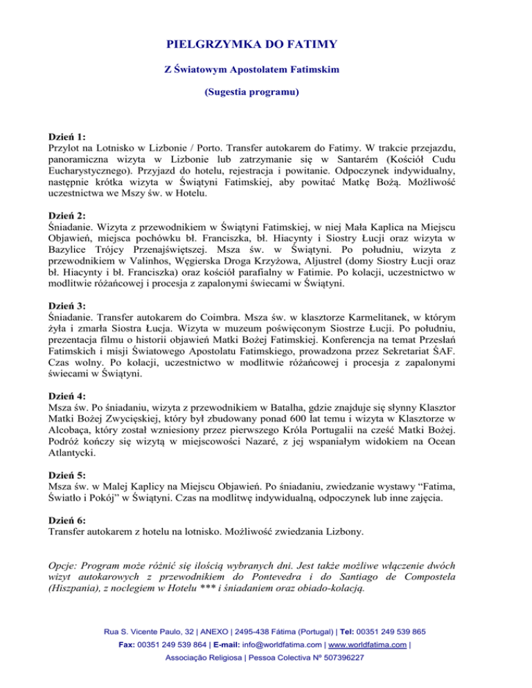 PIELGRZYMKA DO FATIMY Z Światowym Apostolatem Fatimskim (Sugestia programu) Dzień 1: Przylot na Lotnisko w Lizbonie / Porto. Transfer autokarem do Fatimy. W trakcie przejazdu, panoramiczna wizyta w Lizbonie lub zatrzymanie się w Santarém (Kościół Cudu Eucharystycznego). Przyjazd do hotelu, rejestracja i powitanie. Odpoczynek indywidualny, następnie krótka wizyta w Świątyni Fatimskiej, aby powitać Matkę Bożą. Możliwość uczestnictwa we Mszy św. w Hotelu. Dzień 2: Śniadanie. Wizyta z przewodnikiem w Świątyni Fatimskiej, w niej Mała Kaplica na Miejscu Objawień, miejsca pochówku bł. Franciszka, bł. Hiacynty i Siostry Łucji oraz wizyta w Bazylice Trójcy Przenajświętszej. Msza św. w Świątyni. Po południu, wizyta z przewodnikiem w Valinhos, Węgierska Droga Krzyżowa, Aljustrel (domy Siostry Łucji oraz bł. Hiacynty i bł. Franciszka) oraz kościół parafialny w Fatimie. Po kolacji, uczestnictwo w modlitwie różańcowej i procesja z zapalonymi świecami w Świątyni. Dzień 3: Śniadanie. Transfer autokarem do Coimbra. Msza św. w klasztorze Karmelitanek, w którym żyła i zmarła Siostra Łucja. Wizyta w muzeum poświęconym Siostrze Łucji. Po południu, prezentacja filmu o historii objawień Matki Bożej Fatimskiej. Konferencja na temat Przesłań Fatimskich i misji Światowego Apostolatu Fatimskiego, prowadzona przez Sekretariat ŚAF. Czas wolny. Po kolacji, uczestnictwo w modlitwie różańcowej i procesja z zapalonymi świecami w Świątyni. Dzień 4: Msza św. Po śniadaniu, wizyta z przewodnikiem w Batalha, gdzie znajduje się słynny Klasztor Matki Bożej Zwycięskiej, który był zbudowany ponad 600 lat temu i wizyta w Klasztorze w Alcobaça, który został wzniesiony przez pierwszego Króla Portugalii na cześć Matki Bożej. Podróż kończy się wizytą w miejscowości Nazaré, z jej wspaniałym widokiem na Ocean Atlantycki. Dzień 5: Msza św. w Malej Kaplicy na Miejscu Objawień. Po śniadaniu, zwiedzanie wystawy “Fatima, Światło i Pokój” w Świątyni. Czas na modlitwę indywidualną, odpoczynek lub inne zajęcia. Dzień 6: Transfer autokarem z hotelu na lotnisko. Możliwość zwiedzania Lizbony. Opcje: Program może różnić się ilością wybranych dni. Jest także możliwe włączenie dwóch wizyt autokarowych z przewodnikiem do Pontevedra i do Santiago de Compostela (Hiszpania), z noclegiem w Hotelu *** i śniadaniem oraz obiado-kolacją. Rua S. Vicente Paulo, 32 | ANEXO | 2495-438 Fátima (Portugal) | Tel: 00351 249 539 865 Fax: 00351 249 539 864 | E-mail: [email protected] | www.worldfatima.com | Associação Religiosa | Pessoa Colectiva Nº 507396227