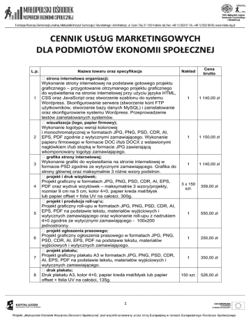 CENNIK USŁUG MARKETINGOWYCH DLA PODMIOTÓW EKONOMII SPOŁECZNEJ L.p. Nazwa towaru oraz specyfikacja Nakład Cena brutto 1 1 140,00 zł 1 1 150,00 zł 1 1 140,00 zł 3 x 150 szt. 359,00 zł 1 550,00 zł 1 250,00 zł 1 350,00 zł 150 szt. 526,00 zł strona internetowa organizacji; 1 Wykonanie strony internetowej na podstawie gotowego projektu graficznego – przygotowanie otrzymanego projektu graficznego do wyświetlania na stronie internetowej przy użyciu języka HTML, CSS oraz JavaScript oraz stworzenie szablonu do systemu Wordpress. Skonfigurowanie serwera (stworzenie kont FTP użytkowników, stworzenie bazy danych MySQL) i zainstalowanie oraz skonfigurowanie systemu Wordpress. Przeprowadzenie testów zainstalowanych systemów. wizualizacja (logo, papier firmowy); 2 Wykonanie logotypu wersji kolorowej i monochromatycznej w formatach JPG, PNG, PSD, CDR, AI, EPS, PDF zgodnie z wytycznymi zamawiającego. Wykonanie papieru firmowego w formacie DOC i/lub DOCX z wstawionymi nagłówkiem i/lub stopką w formacie JPG zawierającą wkomponowany logotyp zamawiającego. grafika strony internetowej; 3 Wykonanie grafiki do wyświetlania na stronie internetowej w formacie PSD zgodnie ze wytycznymi zamawiającego. Grafika do strony głównej oraz maksymalnie 3 różne wzory podstron. projekt i druk wizytówek; 4 Projekt graficzny w formatach JPG, PNG, PSD, CDR, AI, EPS, PDF oraz wydruk wizytówek – maksymalnie 3 wzory/projekty, rozmiar 9 cm na 5 cm, kolor 4+0, papier kreda mat/błysk lub papier offset + folia UV na całości, 300g. projekt i produkcja roll-up’u; 5 Projekt graficzny roll-upu w formatach JPG, PNG, PSD, CDR, AI, EPS, PDF na podstawie tekstu, materiałów wyjściowych i wytycznych zamawiającego oraz wykonanie roll-upu z nadrukiem 4+0 zgodnie ze wytycznymi zamawiającego - 100x200 jednostronny. projekt ogłoszenia prasowego; 6 Projekt graficzny ogłoszenia prasowego w formatach JPG, PNG, PSD, CDR, AI, EPS, PDF na podstawie tekstu, materiałów wyjściowych i wytycznych zamawiającego. projekt plakatu; 7 Projekt graficzny plakatu A3 w formatach JPG, PNG, PSD, CDR, AI, EPS, PDF na podstawie tekstu, materiałów wyjściowych i wytycznych zamawiającego. druk plakatu; 8 Druk plakatu A3, kolor 4+0, papier kreda mat/błysk lub papier offset + folia UV na całości, 135g. 1 projekt ulotki; 9 Projekt ulotki A4 złamana do DL (6 skrzydeł) w formatach JPG, PNG, PSD, CDR, AI, EPS, PDF na podstawie tekstu, materiałów wyjściowych i wytycznych zamawiającego. 1 400,00 zł 200 szt. 589,00 zł 200 szt. 870,00 zł 200 szt. 880,00 zł druk ulotki; 10 Druk ulotki A4 złamanej do DL, kolor 4+4 papier kreda mat/błysk lub papier offset + folia UV na całości, 135g. długopisy z nadrukiem; 11 Długopisy metalowe lub plastikowe, wkład: niebieski, mechanizm: wciskany, znakowanie: nadruk fullcolor lub grawer. ołówek z nadrukiem; 12 Ołówek drewniany, wkład: grafit HB, znakowanie: nadruk monochromatyczny. teczka z nadrukiem; Teczka kartonowa na dokumenty A4, zamykana na gumkę, papier 350g – nadruk 4+0 na podstawie projektu graficznego w 13 300 szt. 1 550,00 zł formatach JPG, PNG, PSD, CDR, AI, EPS, PDF wykonanego na podstawie tekstu, materiałów wyjściowych i wytycznych zamawiającego. notatnik z nadrukiem danych i logo; Notes A5, 80 kartek w kratkę lub czyste, papier 80g, z nadrukiem 14 na pierwszej stronie 4+0 na podstawie tekstu, materiałów wyjściowych i wytycznych zamawiającego projekt banneru internetowego;Projekt graficzny banneru internetowego w formatach JPG, PNG, PSD, CDR, AI, EPS, PDF 15 na podstawie tekstu, materiałów wyjściowych i wytycznych zamawiającego w rozmiarze dopasowanym do wymagań strony internetowej zamawiającego. 100 szt. 1 650,00 zł 1 350,00 zł skład i druk folderu informacyjnego; Projekt graficzny i skład folderu informacyjnego A5, 8 lub 12 stron, w formatach JPG, PNG, PSD, CDR, AI, EPS, PDF na podstawie 16 tekstu, materiałów wyjściowych i wytycznych zamawiającego. 300 szt. 1 850,00 zł Druk folderu informacyjnego, kolor 4+4, papier kreda mat/błysk lub papier offset + folia UV na całości, okładka-240g, środek120g. mailing informacyjno-promocyjny; Usługa mailingu informacyjno-promocyjnego - dwutygodniowa kampania w Internecie polegająca na przesłaniu informacji 17 marketingowej w celu pozyskania klientów poprzez miedzy innymi strony rezultatów wyszukiwarki, bannery, reklamy multimedialne, reklamy serwisów społecznościowych, interstitial, ogłoszenia reklamowe w Internecie, sieci reklamowe oraz e-mail marketing. Mailing 1000 emisji (cpm) 850,00 zł 50 szt. 1 550,00 zł 300 szt. 650,00 zł koszulki z nadrukiem Koszulki bawełniane, w rozmiarach S-XXL, w kolorze i z 18 nadrukiem na podstawie tekstu, materiałów wyjściowych i wytycznych zamawiającego. kalendarz (A4, 1 str.) Kalendarz A4, jednostronicowy – projekt graficzny w formatach JPG, PNG, PSD, CDR, AI, EPS, PDF na podstawie tekstu, 19 materiałów wyjściowych i wytycznych zamawiającego oraz wydruk, kolor 4+4, papier kreda mat/błysk lub papier offset + folia UV na całości, 135g. 2 kalendarz biurkowy wielostronicowy - 12 pełnokolorowych stron z dowolną grafiką lub zdjęciem - kalendarium 1 miesiąc na stronie dopasowane do zdjęć, - druk 4+0 lub 4+4 - spirala biała, lakierowana 20 - podstawka z zadrukiem 4+0 lub bez zadruku karton 270g - format dostępny w pionie i poziomie: 50 szt. 830,00 zł 130x150 pion, podstawka 130x165 po rozł. 130x430, podstawka 4+0 150x130 poziom, podstawka 150x145 po rozł. 150x390, podstawka 4+0 - kolor biały lub kość słoniowa 150g/m2, dwustronnie jednakowo trzykrotnie powlekany kalendarz trójdzielny średni -format całkowity: 300 x 630 - główka wypukła: 210x300, 4+0, karton 230 g, folia błysk, kaszerowana na tekturze falistej, doklejana do plecków lub główka płaska: 210x300, 4+0, karton 250 g, spiralowana 21 50 szt. 1 370,00 zł z pleckami - plecki: 300x420, karton 270 g, - kalendaria (projekt drukarni): 98x280, 2+0, offset 80g, 3