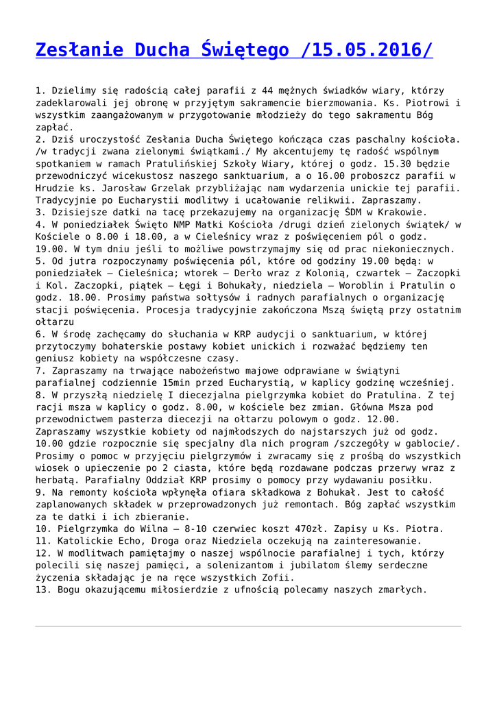 Zesłanie Ducha Świętego /15.05.2016/ 1. Dzielimy się radością całej parafii z 44 mężnych świadków wiary, którzy zadeklarowali jej obronę w przyjętym sakramencie bierzmowania. Ks. Piotrowi i wszystkim zaangażowanym w przygotowanie młodzieży do tego sakramentu Bóg zapłać. 2. Dziś uroczystość Zesłania Ducha Świętego kończąca czas paschalny kościoła. /w tradycji zwana zielonymi świątkami./ My akcentujemy tę radość wspólnym spotkaniem w ramach Pratulińskiej Szkoły Wiary, której o godz. 15.30 będzie przewodniczyć wicekustosz naszego sanktuarium, a o 16.00 proboszcz parafii w Hrudzie ks. Jarosław Grzelak przybliżając nam wydarzenia unickie tej parafii. Tradycyjnie po Eucharystii modlitwy i ucałowanie relikwii. Zapraszamy. 3. Dzisiejsze datki na tacę przekazujemy na organizację ŚDM w Krakowie. 4. W poniedziałek Święto NMP Matki Kościoła /drugi dzień zielonych świątek/ w Kościele o 8.00 i 18.00, a w Cieleśnicy wraz z poświęceniem pól o godz. 19.00. W tym dniu jeśli to możliwe powstrzymajmy się od prac niekoniecznych. 5. Od jutra rozpoczynamy poświęcenia pól, które od godziny 19.00 będą: w poniedziałek – Cieleśnica; wtorek – Derło wraz z Kolonią, czwartek – Zaczopki i Kol. Zaczopki, piątek – Łęgi i Bohukały, niedziela – Woroblin i Pratulin o godz. 18.00. Prosimy państwa sołtysów i radnych parafialnych o organizację stacji poświęcenia. Procesja tradycyjnie zakończona Mszą świętą przy ostatnim ołtarzu 6. W środę zachęcamy do słuchania w KRP audycji o sanktuarium, w której przytoczymy bohaterskie postawy kobiet unickich i rozważać będziemy ten geniusz kobiety na współczesne czasy. 7. Zapraszamy na trwające nabożeństwo majowe odprawiane w świątyni parafialnej codziennie 15min przed Eucharystią, w kaplicy godzinę wcześniej. 8. W przyszłą niedzielę I diecezjalna pielgrzymka kobiet do Pratulina. Z tej racji msza w kaplicy o godz. 8.00, w kościele bez zmian. Główna Msza pod przewodnictwem pasterza diecezji na ołtarzu polowym o godz. 12.00. Zapraszamy wszystkie kobiety od najmłodszych do najstarszych już od godz. 10.00 gdzie rozpocznie się specjalny dla nich program /szczegóły w gablocie/. Prosimy o pomoc w przyjęciu pielgrzymów i zwracamy się z prośbą do wszystkich wiosek o upieczenie po 2 ciasta, które będą rozdawane podczas przerwy wraz z herbatą. Parafialny Oddział KRP prosimy o pomocy przy wydawaniu posiłku. 9. Na remonty kościoła wpłynęła ofiara składkowa z Bohukał. Jest to całość zaplanowanych składek w przeprowadzonych już remontach. Bóg zapłać wszystkim za te datki i ich zbieranie. 10. Pielgrzymka do Wilna – 8-10 czerwiec koszt 470zł. Zapisy u Ks. Piotra. 11. Katolickie Echo, Droga oraz Niedziela oczekują na zainteresowanie. 12. W modlitwach pamiętajmy o naszej wspólnocie parafialnej i tych, którzy polecili się naszej pamięci, a solenizantom i jubilatom ślemy serdeczne życzenia składając je na ręce wszystkich Zofii. 13. Bogu okazującemu miłosierdzie z ufnością polecamy naszych zmarłych. Mamy nowych świadków wiary Przez ostatni rok formacyjni 44 osoby z naszej wspólnoty parafialnej przygotowywało się bardzo intensywnie do przyjęcia sakramentu dojrzałości chrześcijańskiej. W comiesięcznych spotkaniach formacyjnych, systematycznej spowiedzi, coniedzielnej Eucharystii i zaangażowaniu się w pomoc przy pracach gospodarczych parafii młodzież rozważała podjęcie decyzji pójścia w całości za Panem i Bogiem, którego przyjęła w sakramencie chrztu św. Radość naszej wspólnoty po 9 dniowym przygotowaniu kandydatów do bierzmowania dopełniła się w czwartek 12 maja 2016r. o godz. 18.00, gdzie stając w naszej wspólnocie Ks. Biskup Ordynariusz potwierdził przez modlitwę i włożenie rąk wybór przez kościół 44 młodych ludzi do świadczenia o swojej wierze w Boga, który bogaty jest w miłosierdzie. Całą parafią wyrażamy radość z tego faktu i gratulujemy naszej młodzieży oraz rodzicom za przekazanie depozytu wiary, który w bierzmowaniu umocnił Kościół darami Ducha Świętego. Ks. Piotrowi, który prowadził od początku młodzież naszej parafii dziękujemy za ofiarne, solidne i dobre przygotowanie serc i umysłów, tych którzy postanowili dalsze swoje życie łączyć z Chrystusem i Jego Kościołem. Kilka fotek z tej uroczystości udało się wykonać: Spotkajmy się /15 maja Pratulińska Szkoła Wiary/ Sanktuarium Błogosławionych Męczenników Podlaskich w Pratulinie ZAPRASZA wszystkich Czcicieli Błogosławionych Męczenników Podlaskich do spotkania i modlitwy w PRATULIŃSKIEJ SZKOLE WIARY 15 maja /niedziela/ 2016r.w Pratulinie Program: 15.30 Nabożeństwo z Męczennikami /Martyrium Pratulińskie/ 16.00 Eucharystia z homilią o wydarzeniach unickich w Hrudzie /Ks. Jarosław Grzelak/ 17.00 Modlitwy wstawiennicze i polecanie przesyłanych intencji 17.30 Zawierzenie się Męczennikom i ucałowanie Relikwii Retransmisja Pratulińskiej Szkoły Wiary na antenie Katolickiego Radia Podlasie w niedzielę /15 kwietnia/ godz. 19.00. Wszystkich, którzy nie mogą przybyć do Pratulina zachęcamy do skorzystania z tej formy tworzenia wspólnoty modlitwy. Ogłoszenia VII Niedziela Wielkanocna /08.05.2016/ 1. Dziękujemy za wspólne przeżywanie odpustu parafialnego zarówno w kościele jak i przy wieczornym spotkaniu. Bóg zapłać. 2. Dziś w Kościele uroczystość Wniebowstąpienia Pańskiego, która przypomina nam o kończącym się w przyszłą niedziele czasie wielkanocnym, w którym każdy chrześcijanin winien według nauki kościoła – przynajmniej raz w roku w czasie wielkanocnym przyjąć komunię świętą. 3. Trwa nowenna do Ducha Świętego i przygotowanie liturgiczne kandydatów do bierzmowania. Codziennie o godz. 17.30 nabożeństwo majowe i nowenna. Przypominamy, że jest to też czas dla kandydatów, ich rodziców i świadków bierzmowania do skorzystania ze spowiedzi. 4. Jutro 