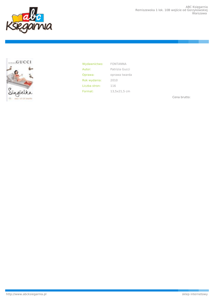 ABC Księgarnia Remiszewska 1 lok. 10B wejście od Gorzykowskiej Warszawa Wydawnictwo: FONTANNA Autor: Patrizia Gucci Oprawa: oprawa twarda Rok wydania: 2010 Liczba stron: 116 Format: 13,5x21,5 cm Cena brutto: http://www.abcksiegarnia.pl sklep internetowy